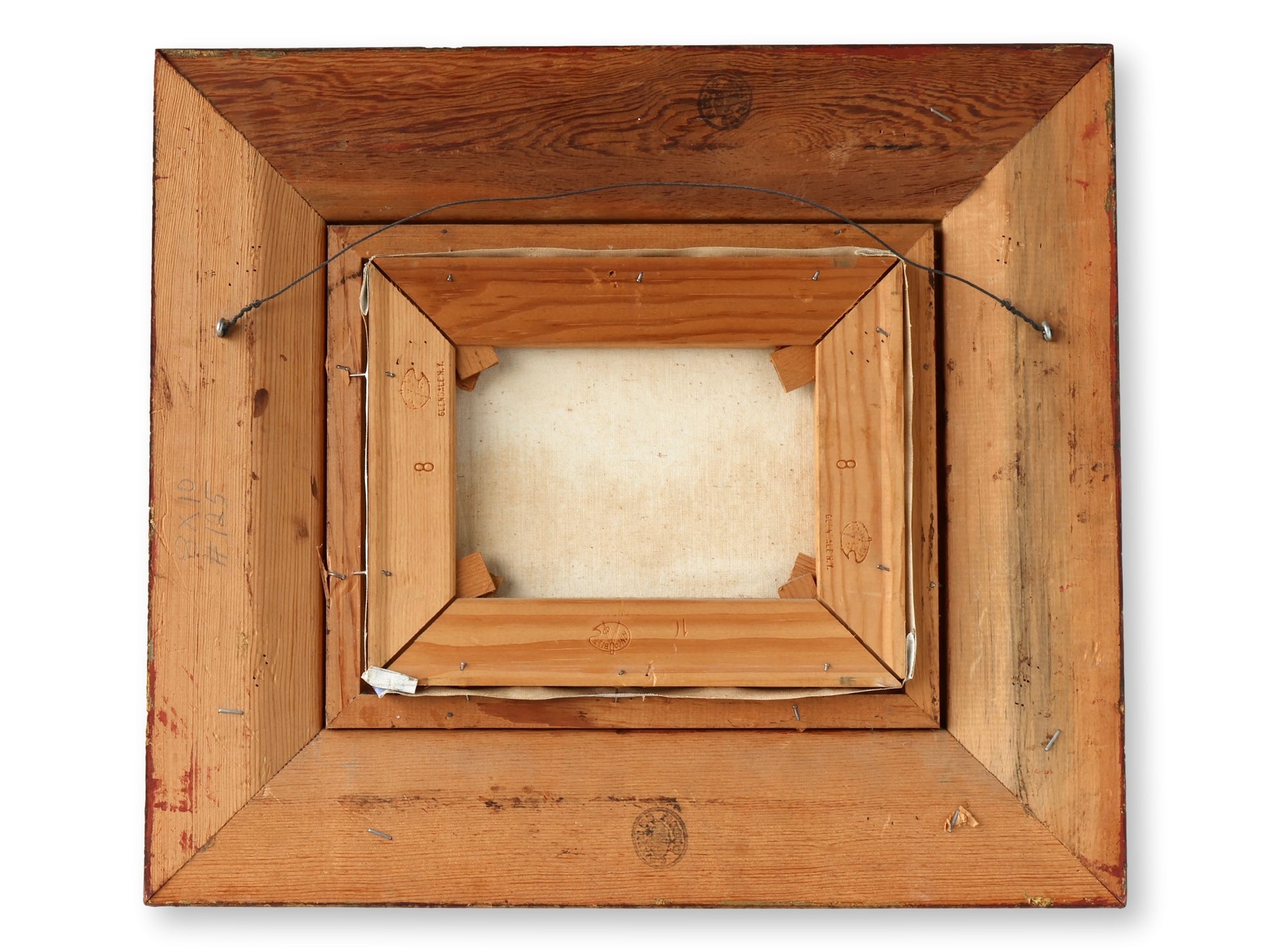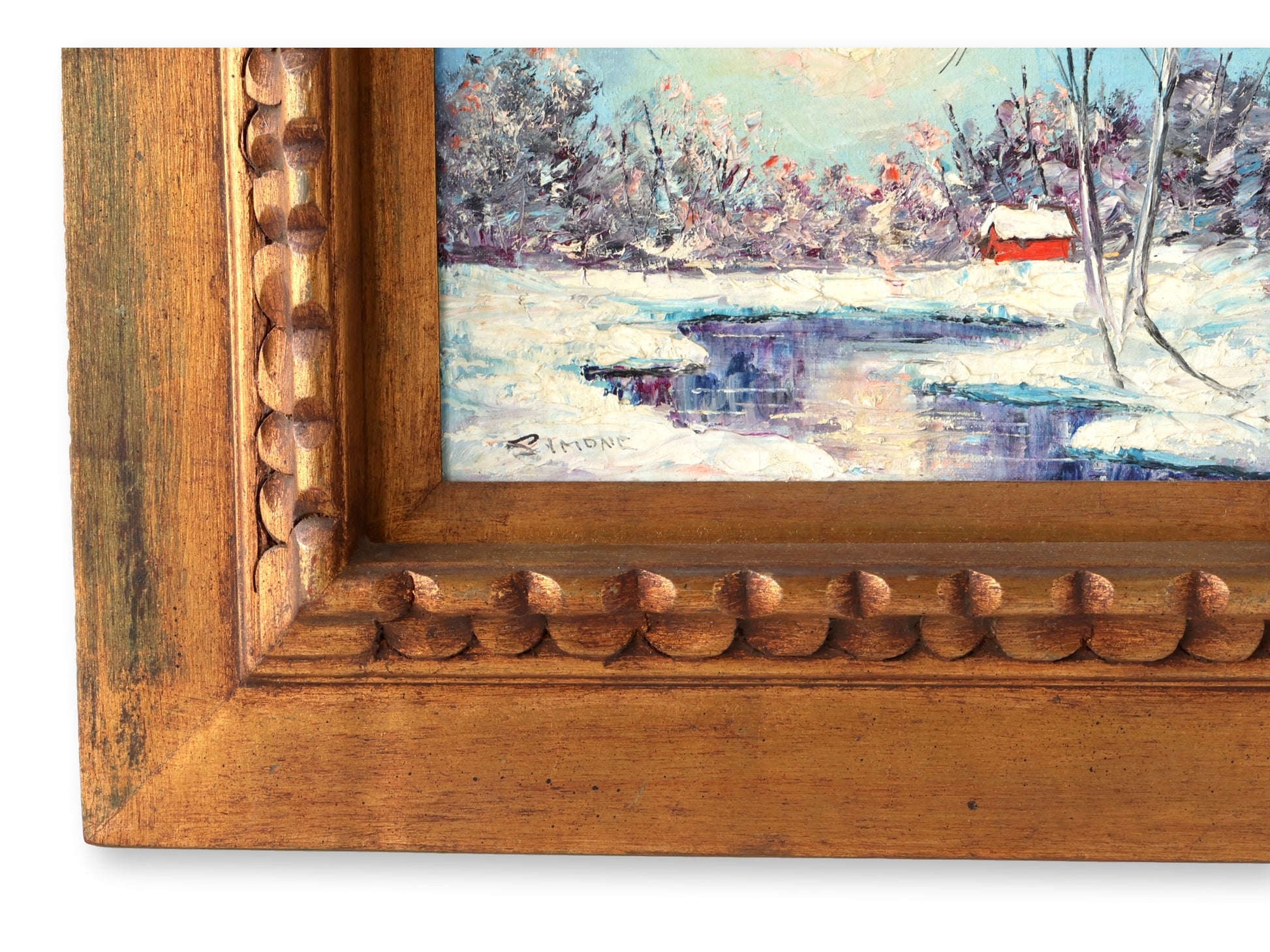 Charming winter landscape oil painting signed P. Simone in the lower left. A red-roofed cabin stands near a frozen pond, framed by bare trees and snow-covered banks under a bright sky. The palette is crisp yet warm, with vibrant accents in the sky and tree line. Housed in a rustic, deeply carved wooden frame with a gold wash—ideal for a cozy study, cabin, or winter-themed vignette.