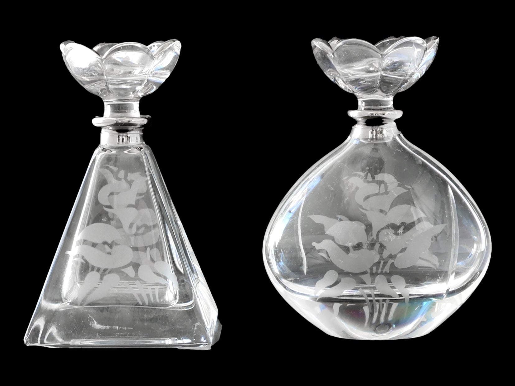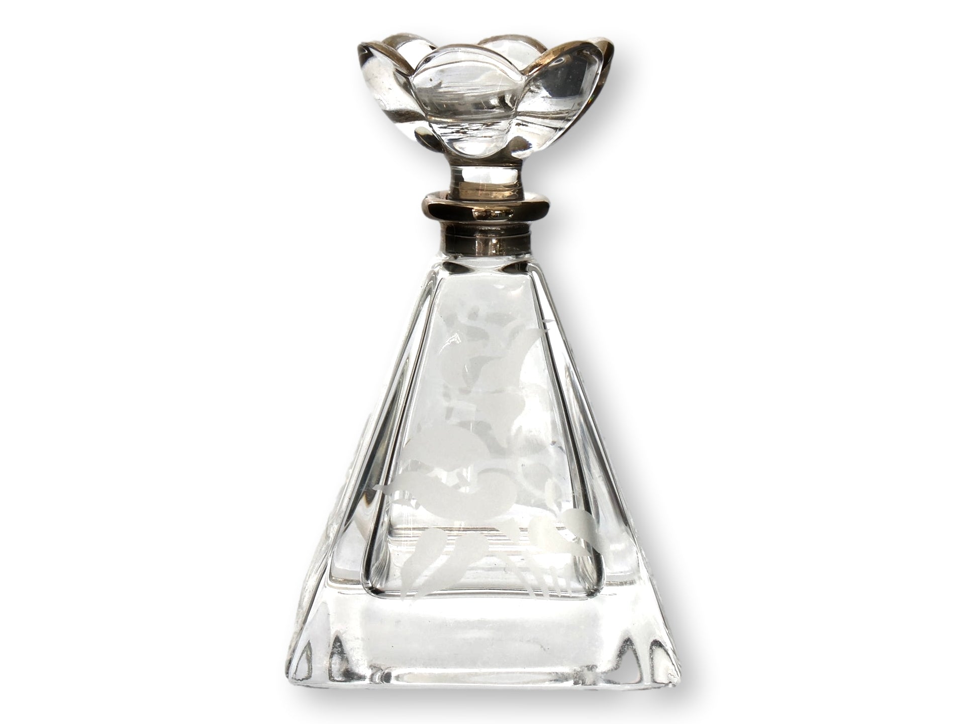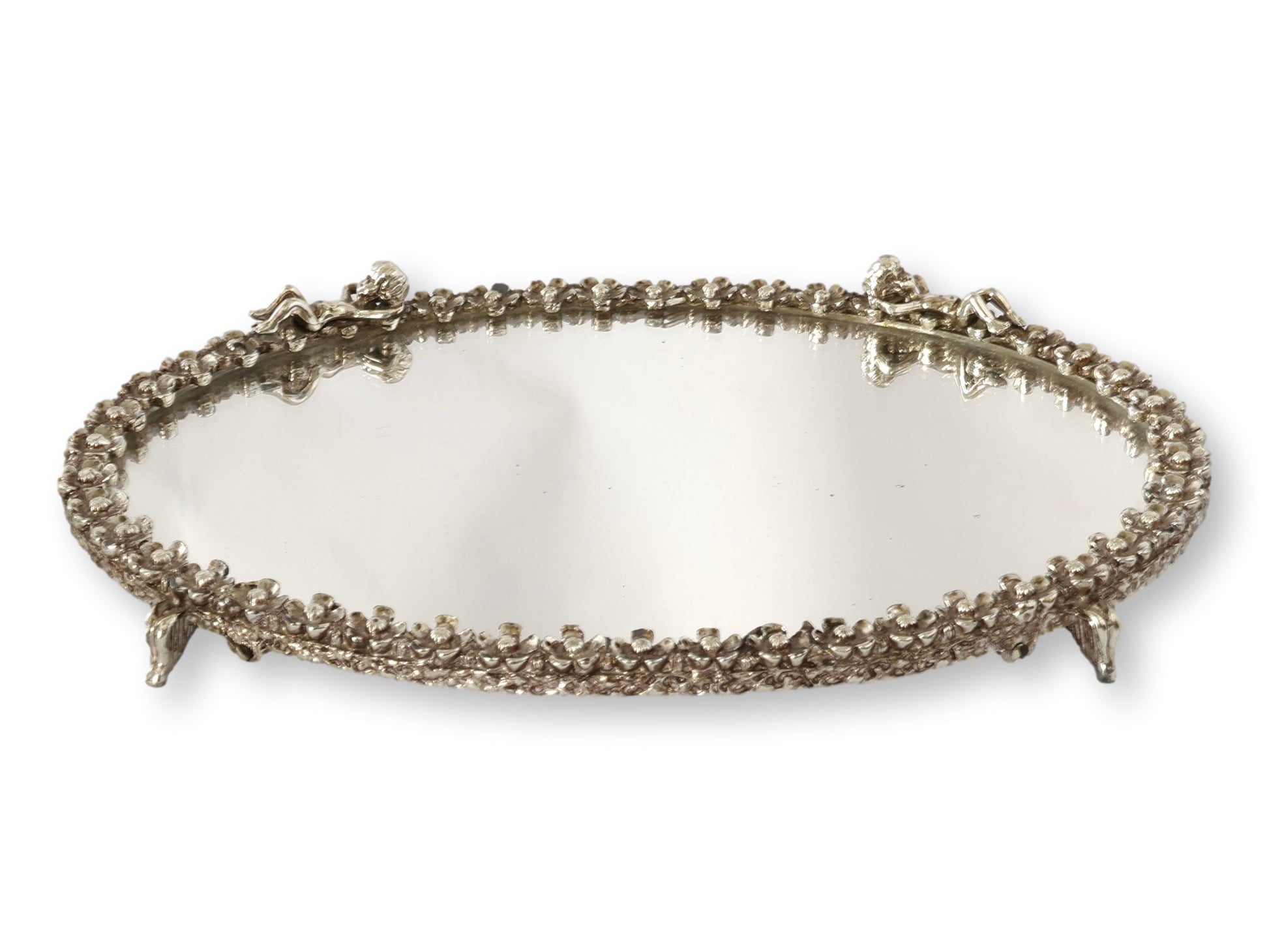 Darling, your vanity called — it wants its sparkle back. This midcentury perfume set features two etched glass bottles with floral stoppers, poised atop a mirrored silverplate tray adorned with cherubic detailing. Equal parts Hollywood Regency and old-Hollywood dressing room, it’s the perfect finishing touch for a glamorous vanity or boudoir. Whether holding your signature scent or simply catching the light, this set is every bit as enchanting as the woman who owns it.