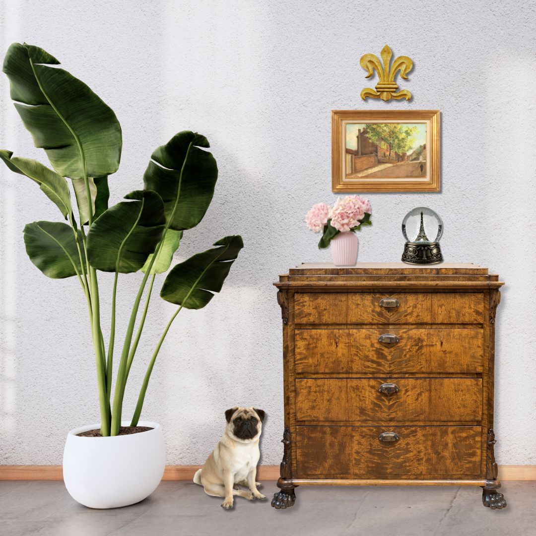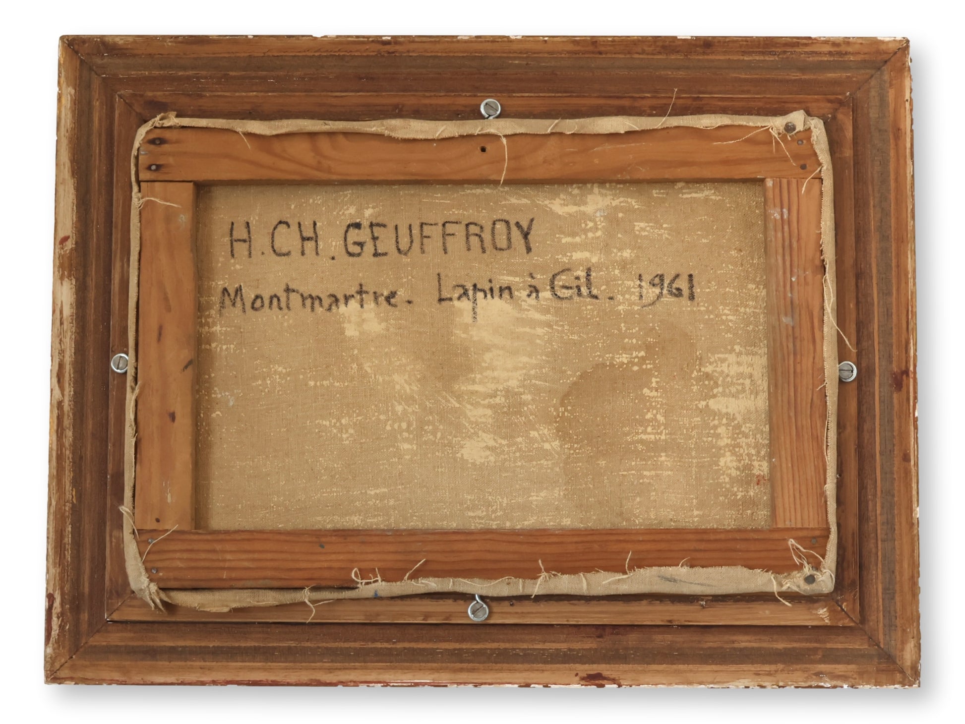 Paris street scene, vintage oil on canvas signed lower left H.Ch.G. and inscribed on the reverse “Montmartre, Lapin Gil, 1961.” The composition shows a quiet Montmartre street lined with sunlit façades and leafy trees, with a lone figure walking in the distance. Painted in warm tones with a relaxed hand, the work captures the charm of Paris’s historic artists’ quarter. Light wear consistent with age. Original frame as found.