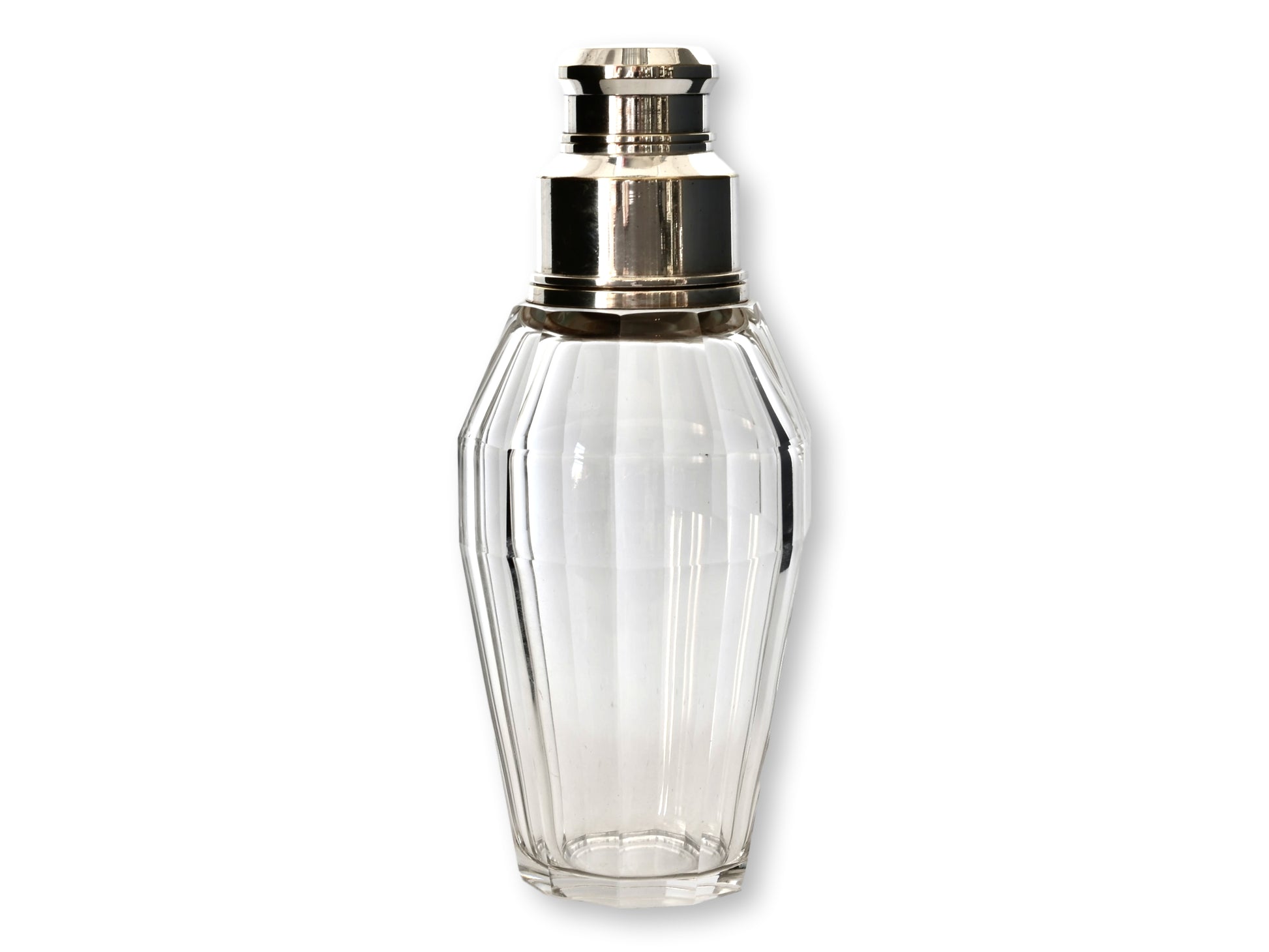This impressive oversized cocktail shaker stands 10.5" tall and is crafted from exceptionally heavy cut crystal, showcasing a bold fluted design that radiates elegance. Modeled with classic Art Deco Styling. Topped with a sleek silver-plated lid, this rare piece is both functional and decorative, making it the perfect statement addition to any barware collection. Its substantial size and timeless craftsmanship make it ideal for entertaining with style and sophistication. Unmarked.