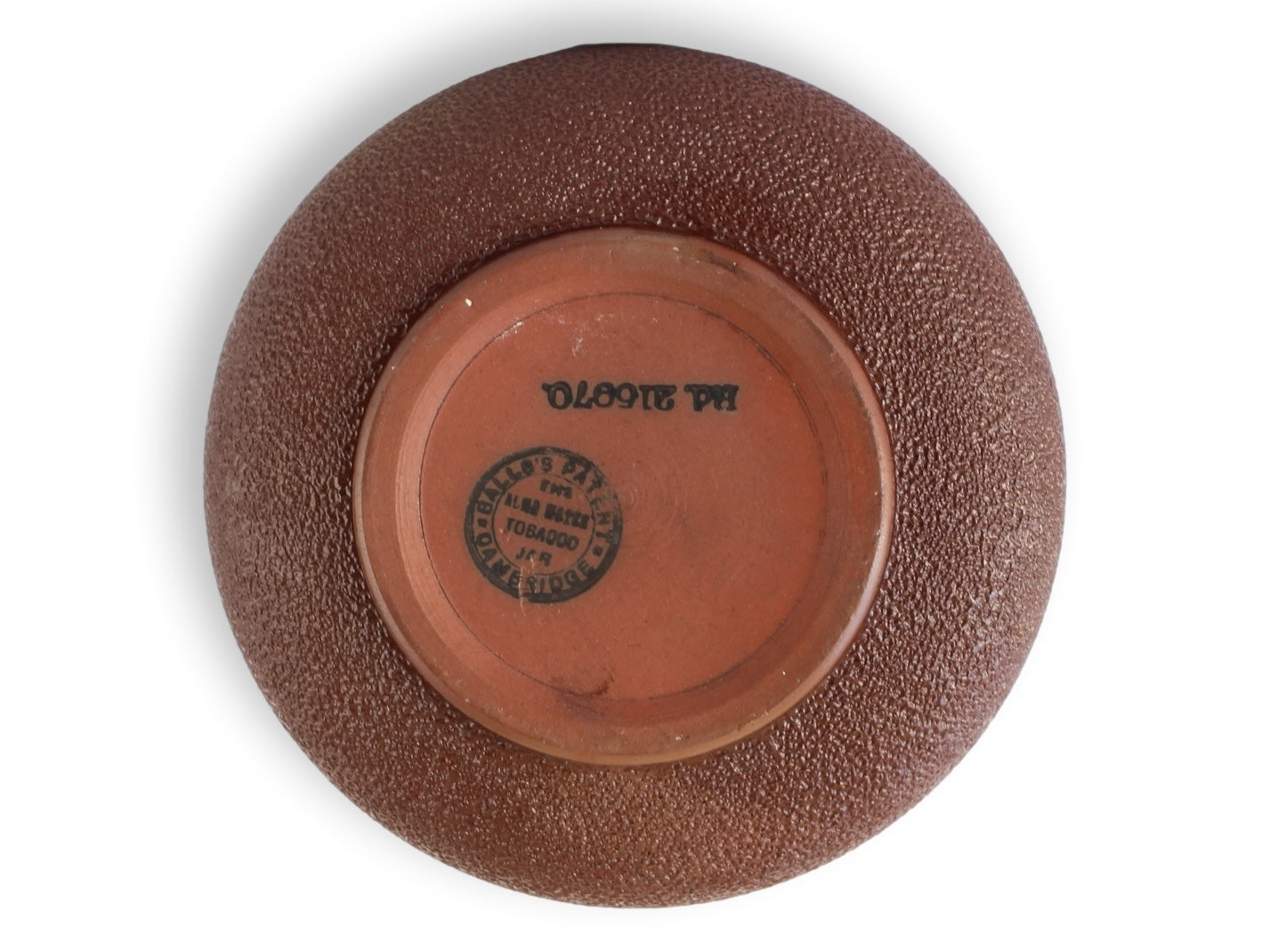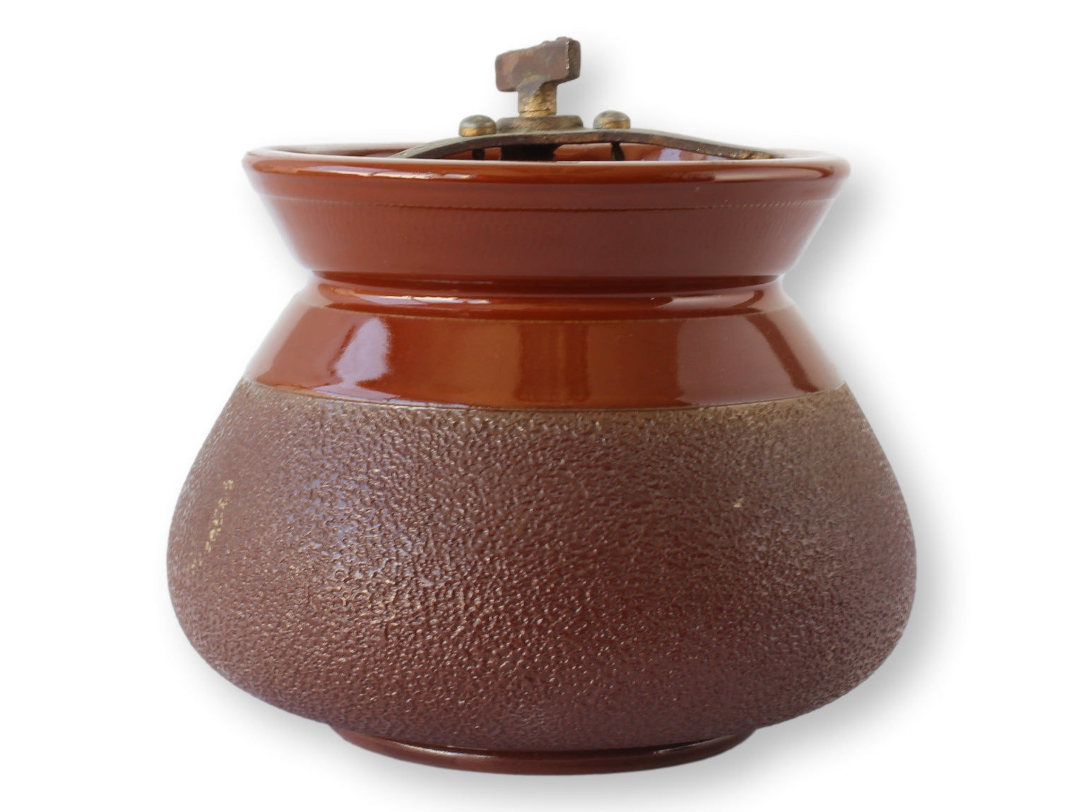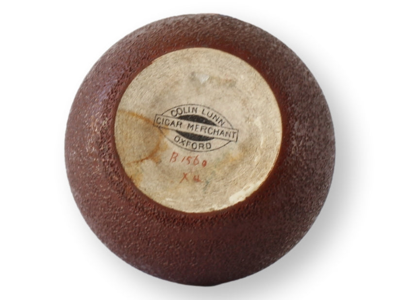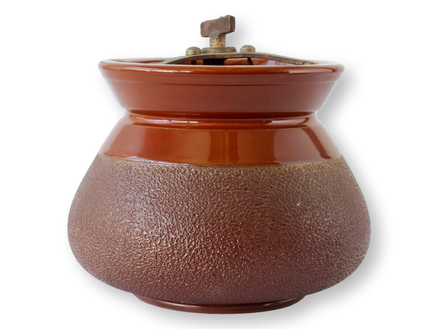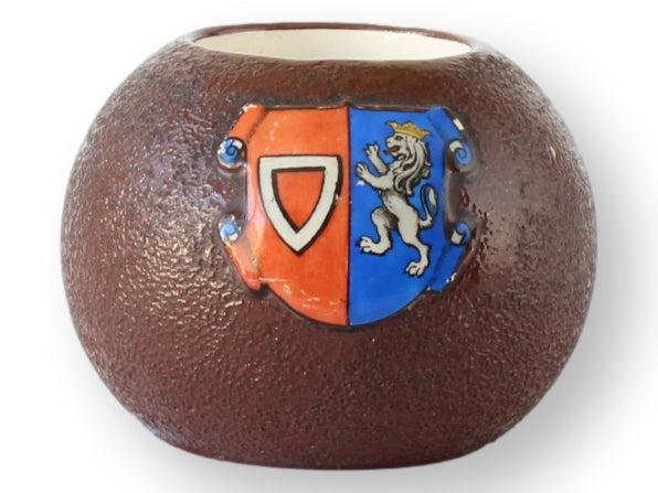 Charming English stoneware smoking set, early 20th century, comprised of a large tobacco jar and companion match holder/striker. The jar features a textured salt-glazed body with smooth glazed collar, while the smaller piece is decorated with a colorful heraldic crest bearing a lion and shield, evocative of Oxford University souvenir ware. Rich two-tone finish with warm patina throughout. Both pieces marked on underside.