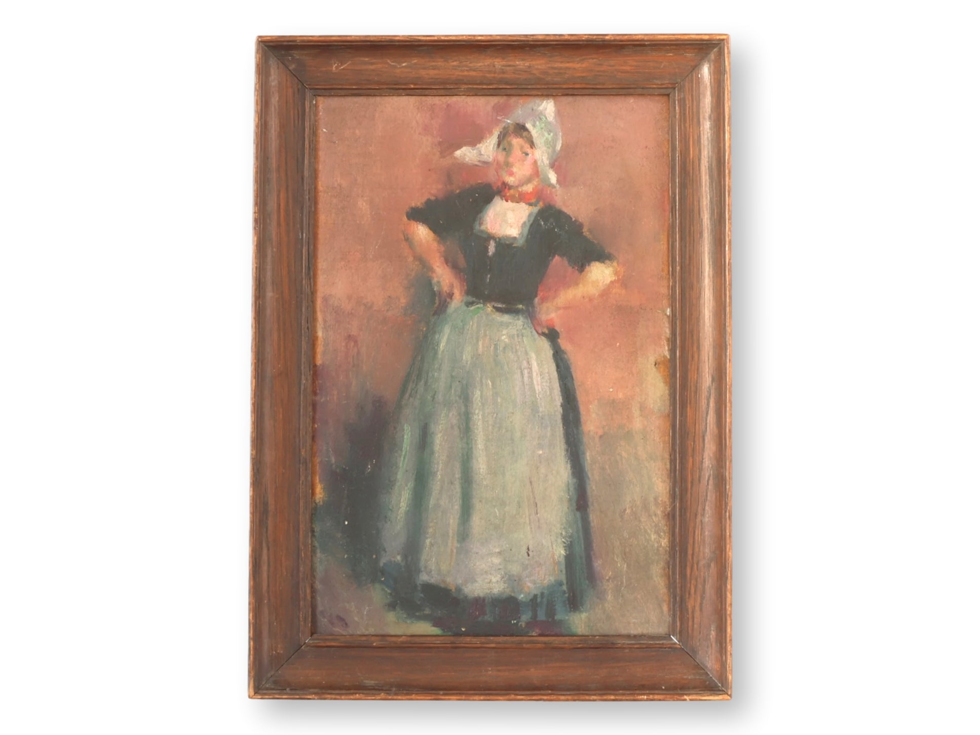 Charming antique painting on board of a Breton woman in traditional regional dress, likely from Brittany, France. Her stance conveys both strength and dignity, with classic details including apron, bodice, and white coiffe headdress. Soft, impressionistic brushwork adds warmth and character to the portrait. Housed in its original wood frame, as found, lending authentic vintage appeal. A wonderful decorative piece celebrating French folk heritage.