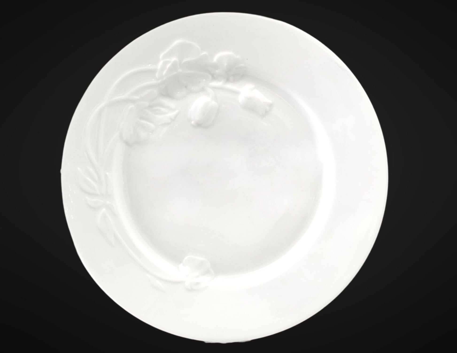 Nine Elegant white porcelain oversized European dinner plates by Haviland Limoges for the Champagne house of Perrier-Jouët. It is a very rare pattern featuring a refined raised pattern mimicking their long stem floral logo motif. Made in France for the iconic Champagne Maison, each piece bears the Haviland Limoges and Perrier-Jouët mark.