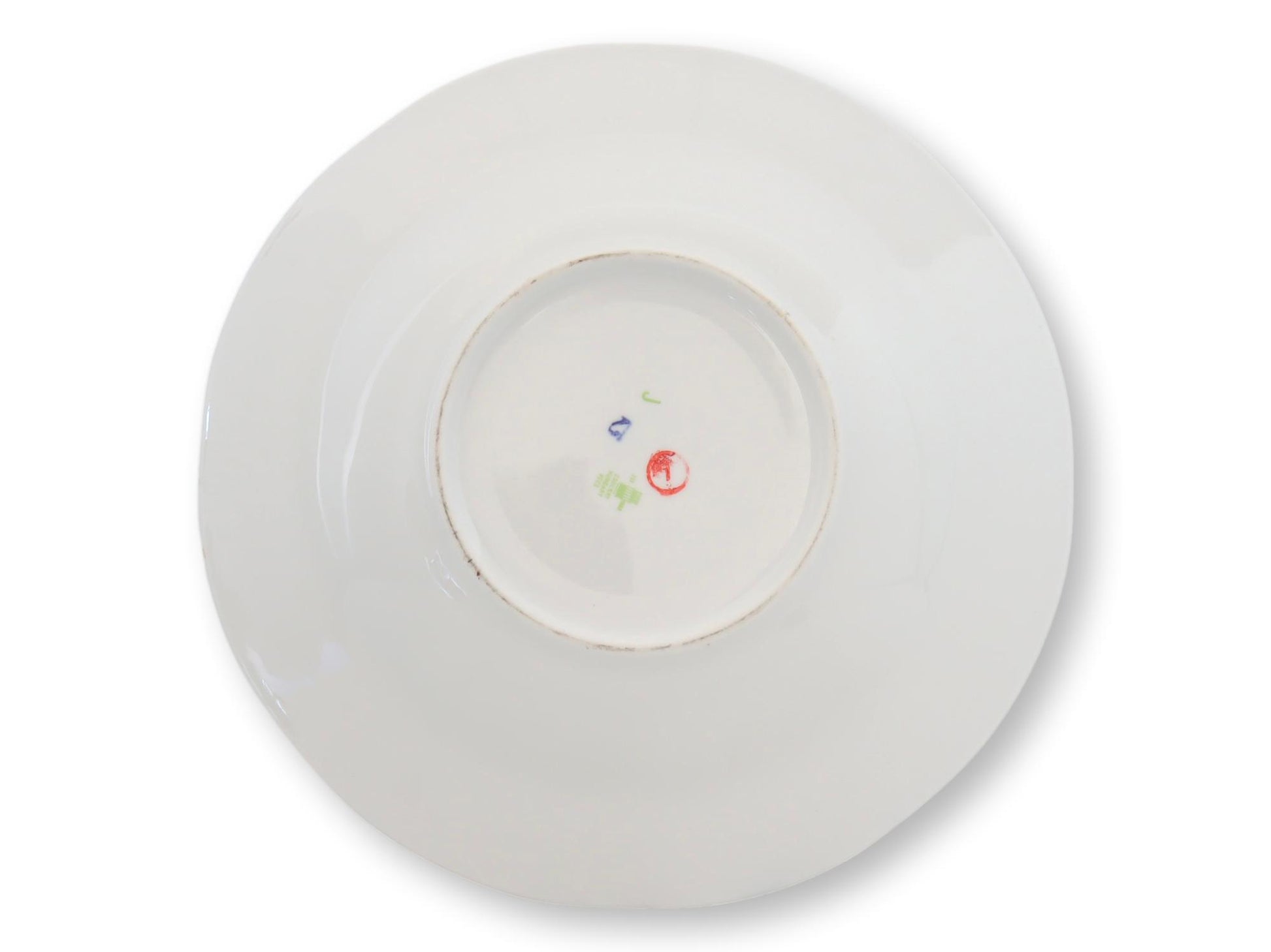Set of seven Zsolnay pompadour III bread plates, a set designed to bring a touch of luxury to your table. Each plate, measuring 6.5 inches, is framed by a lustrous cobalt blue rim, accented with hand-painted 18K gold scrolls. Perfect for serving bread or small appetizers, these plates are not only functional but also enhance the aesthetic of your dining experience with their rich, elegant design. Makers mark on bottom.