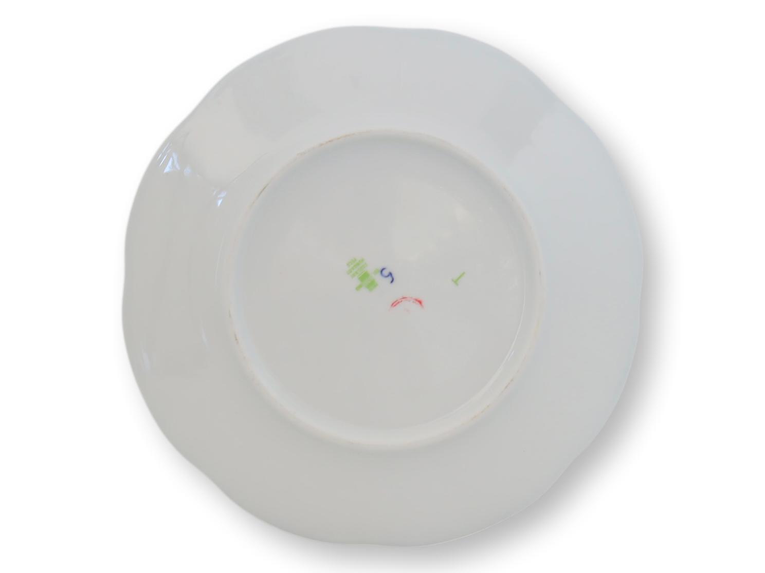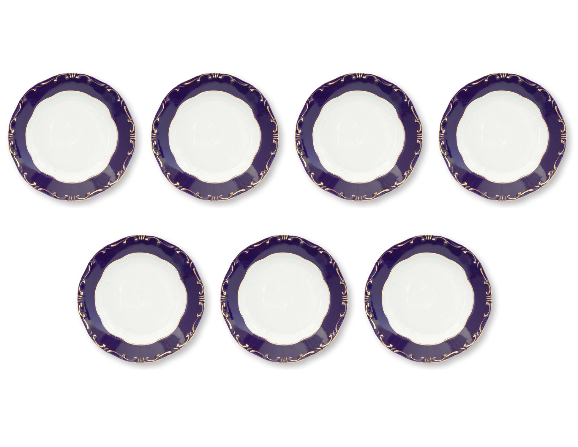 Set of seven Zsolnay pompadour III bread plates, a set designed to bring a touch of luxury to your table. Each plate, measuring 6.5 inches, is framed by a lustrous cobalt blue rim, accented with hand-painted 18K gold scrolls. Perfect for serving bread or small appetizers, these plates are not only functional but also enhance the aesthetic of your dining experience with their rich, elegant design. Makers mark on bottom.