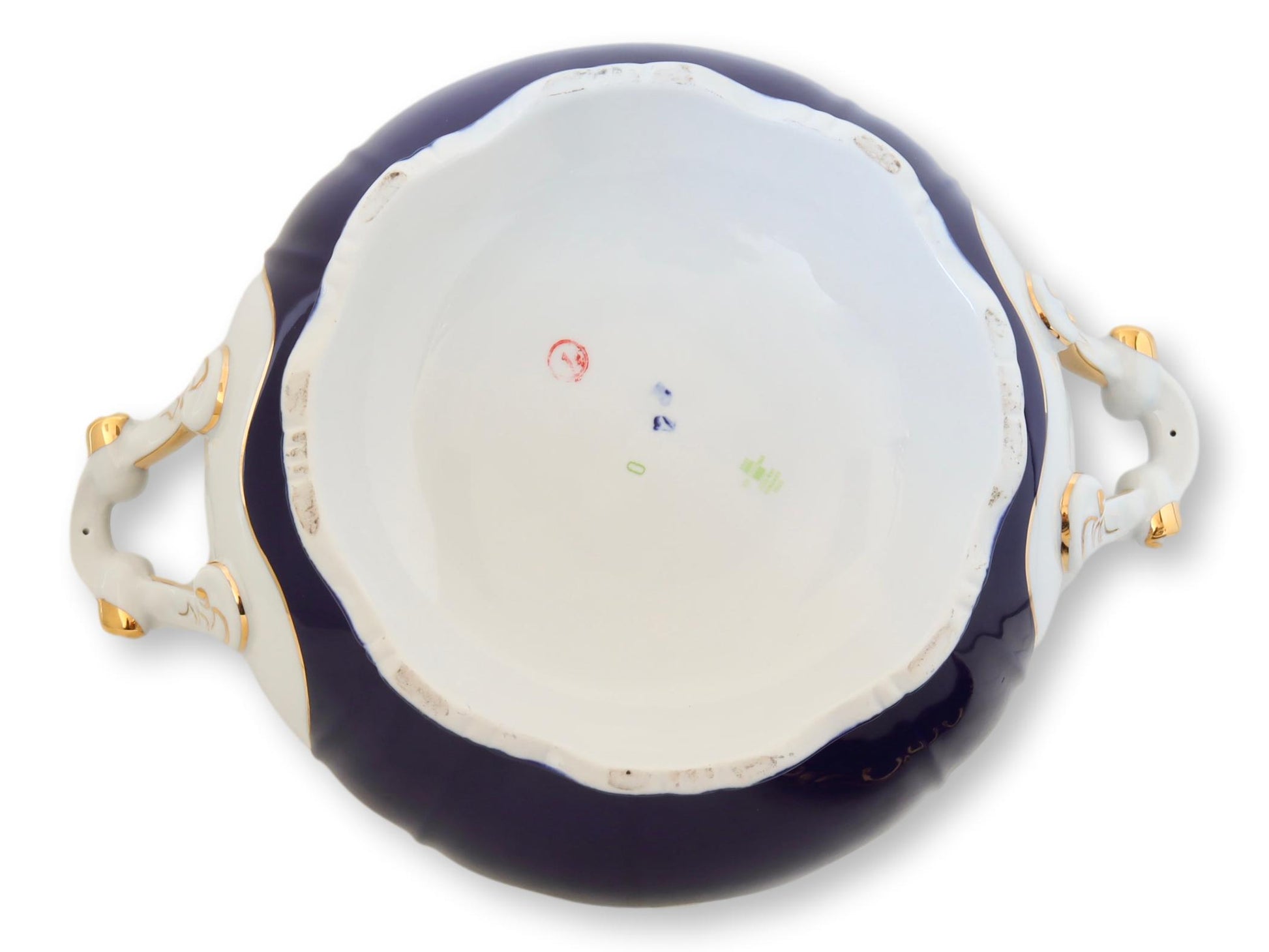 Indulge in the exquisite craftsmanship of the Zsolnay Pompadour III Soup Tureen. This stunning piece features a white body with a deep cobalt blue glaze and lavish 18K gold scrollwork. Its elegant handles and ornate lid finial reflect a tradition of luxury. Perfect for serving soups or stews, it doubles as an ornamental centerpiece, adding a touch of regal charm to your dining experience. Maker's mark on bottom.