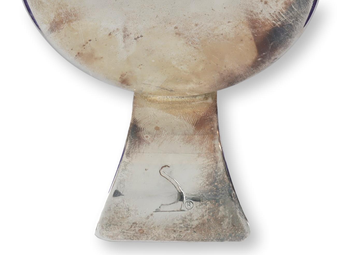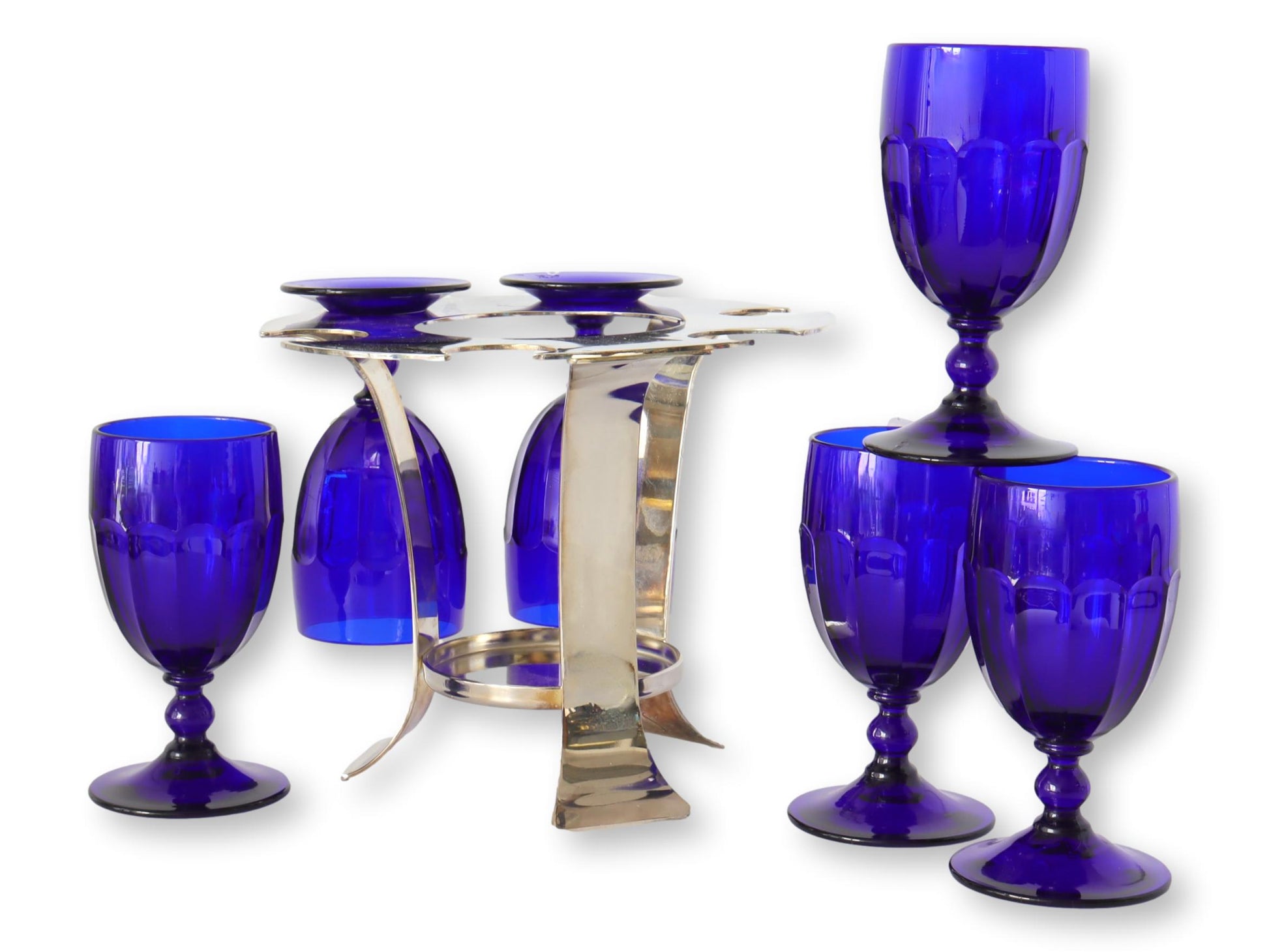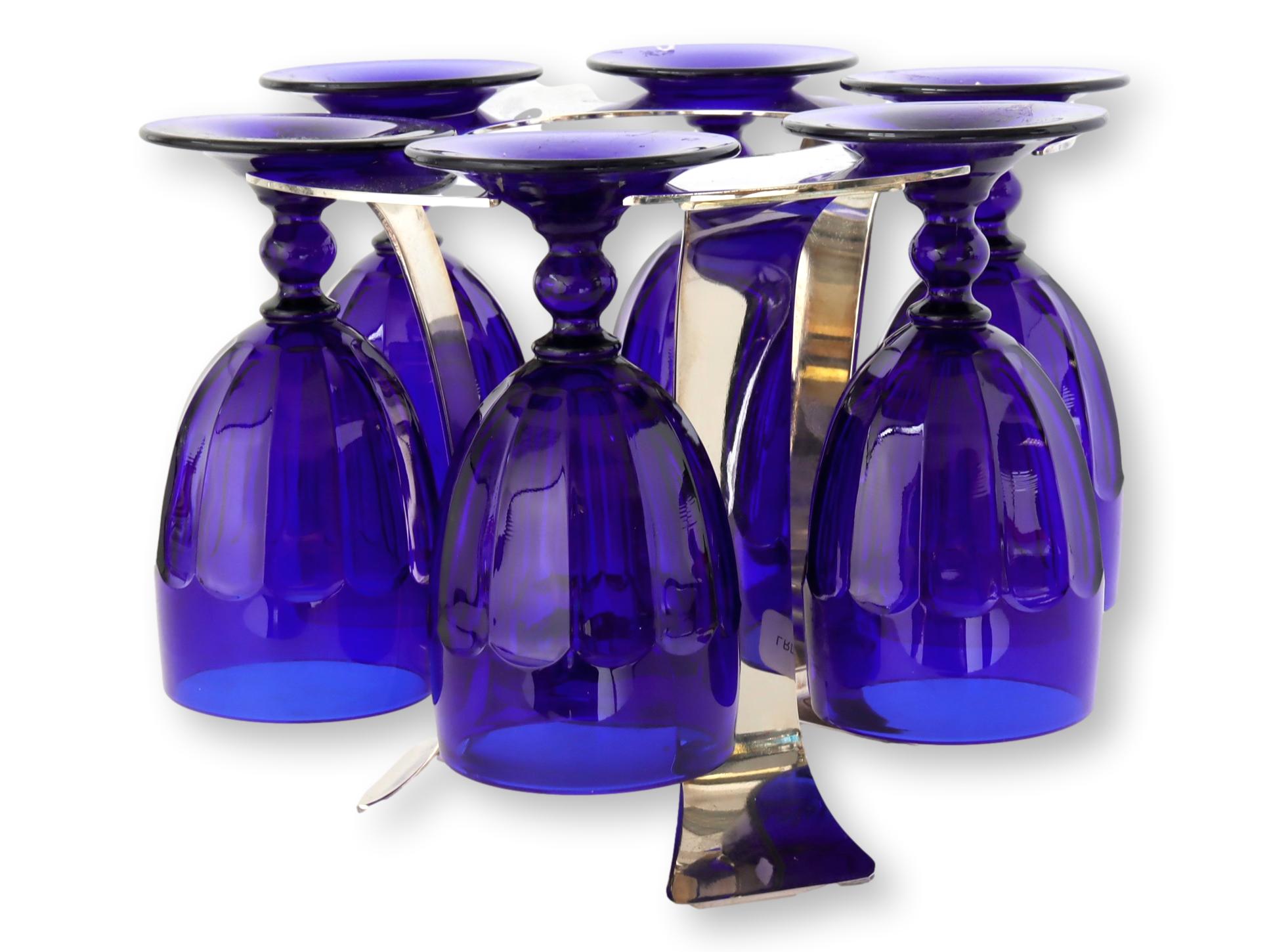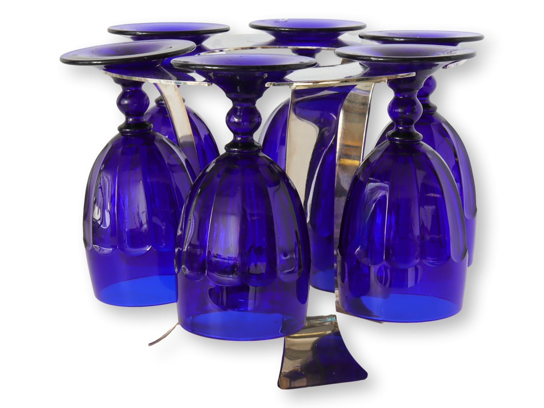 Beautiful quality English silver-plate rack in Art Deco style, complete with stunning cobalt blue glasses. Perfect for entertaining, it combines functionality with timeless elegance, reflecting the sophistication of the era. A must-have for lovers of unique vintage finds. The glasses are antique, the rack is circa late 20th century.