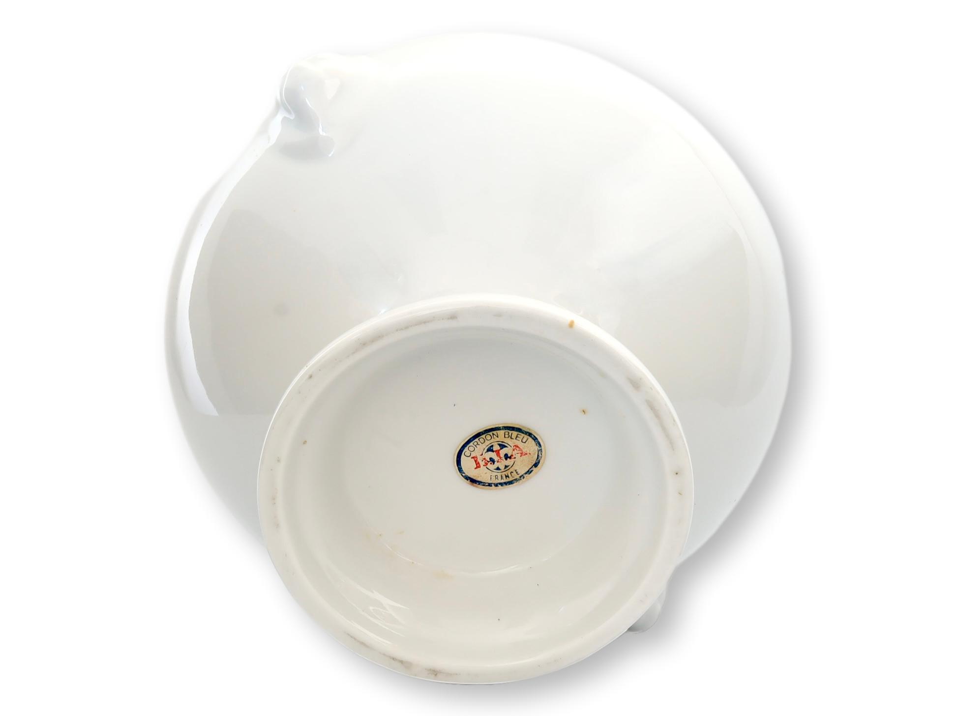 Embrace French sophistication with this vintage Cordon Bleu white porcelain tureen, graced with lion's head motifs and a unique tulip-shaped handle. This exquisite piece is perfect for serving with flair or adding an elegant touch to your decor collection.