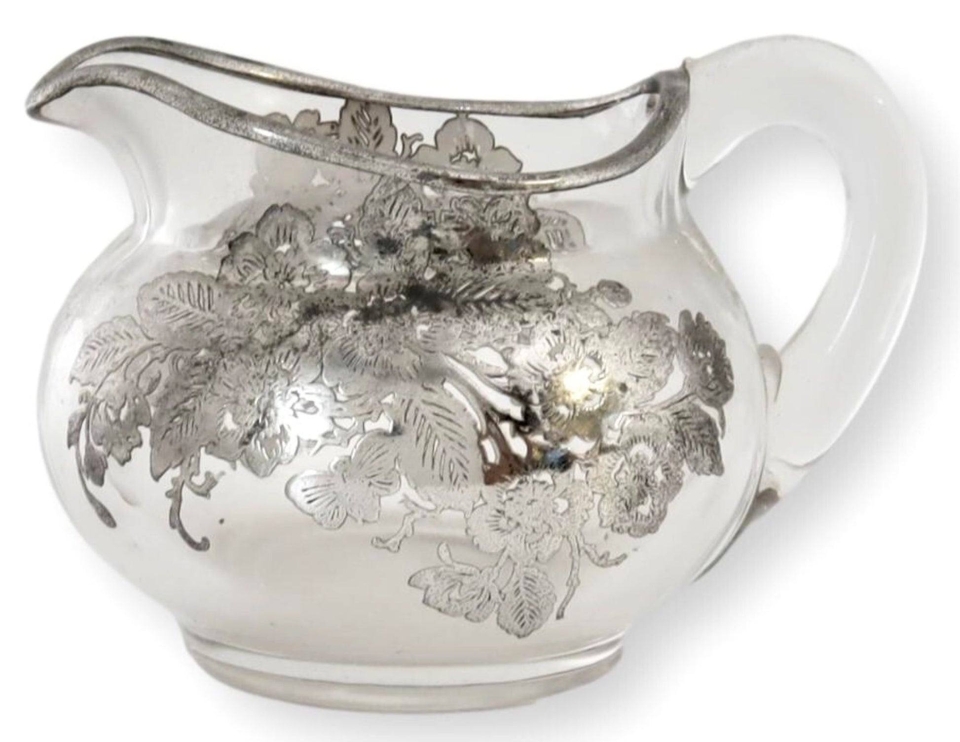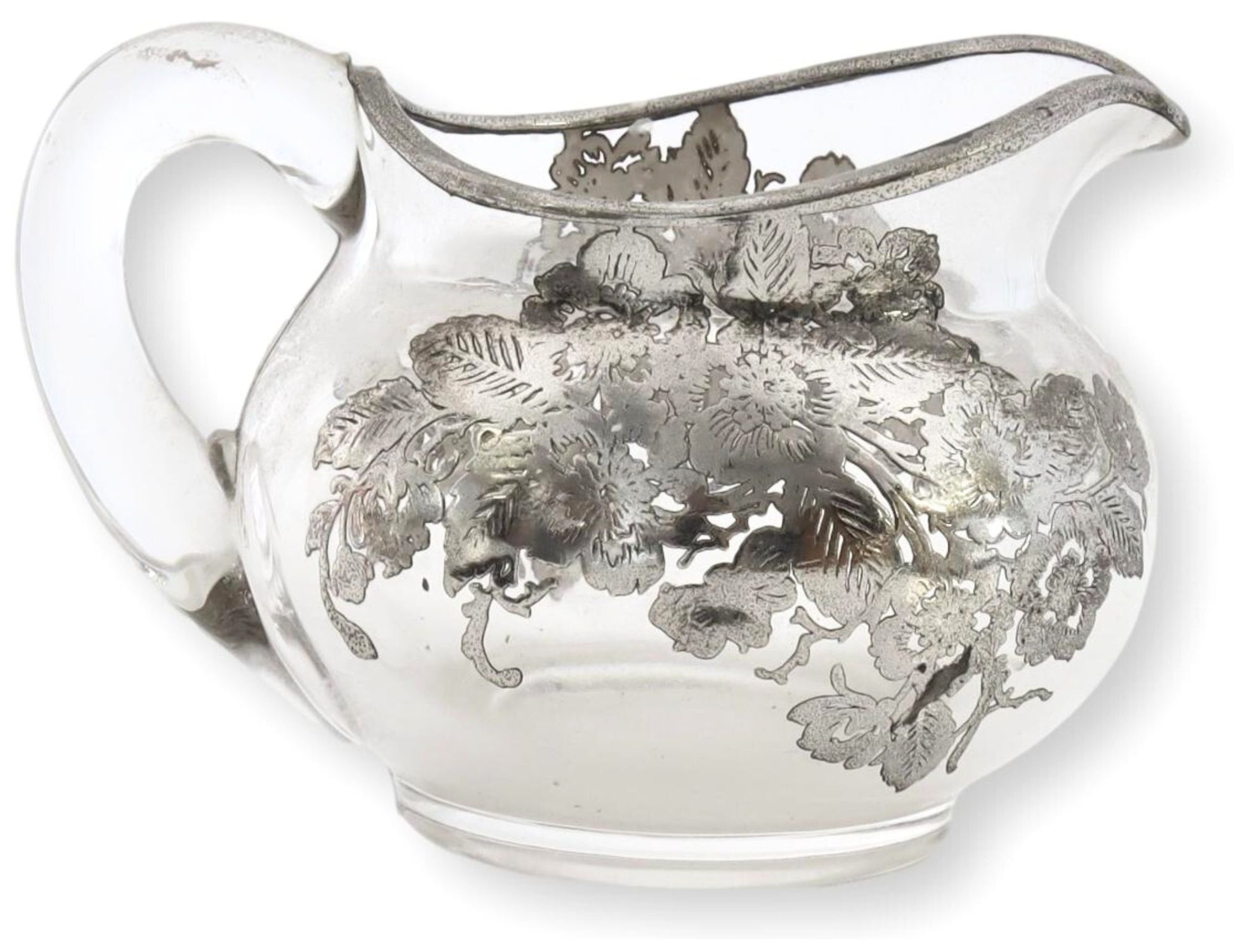 Sterling silver overlay cream jug. Its delicate craftsmanship and elegant design capture the sophistication of the era, making it a timeless addition to any table setting. Perfect for collectors or as a unique gift. Polishes to a high shine with mild silver polish.