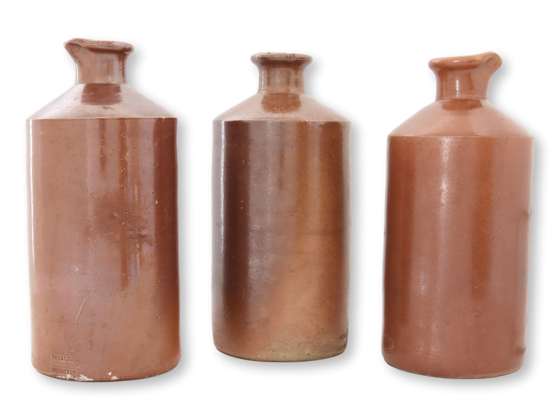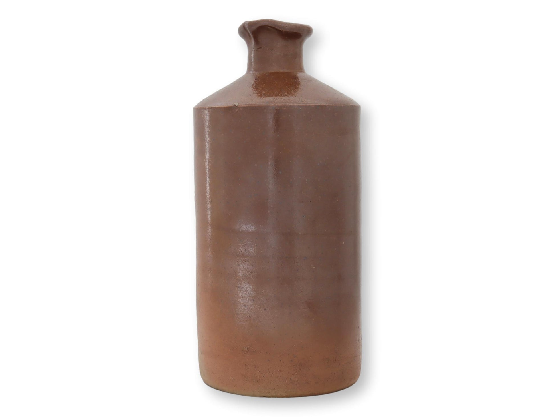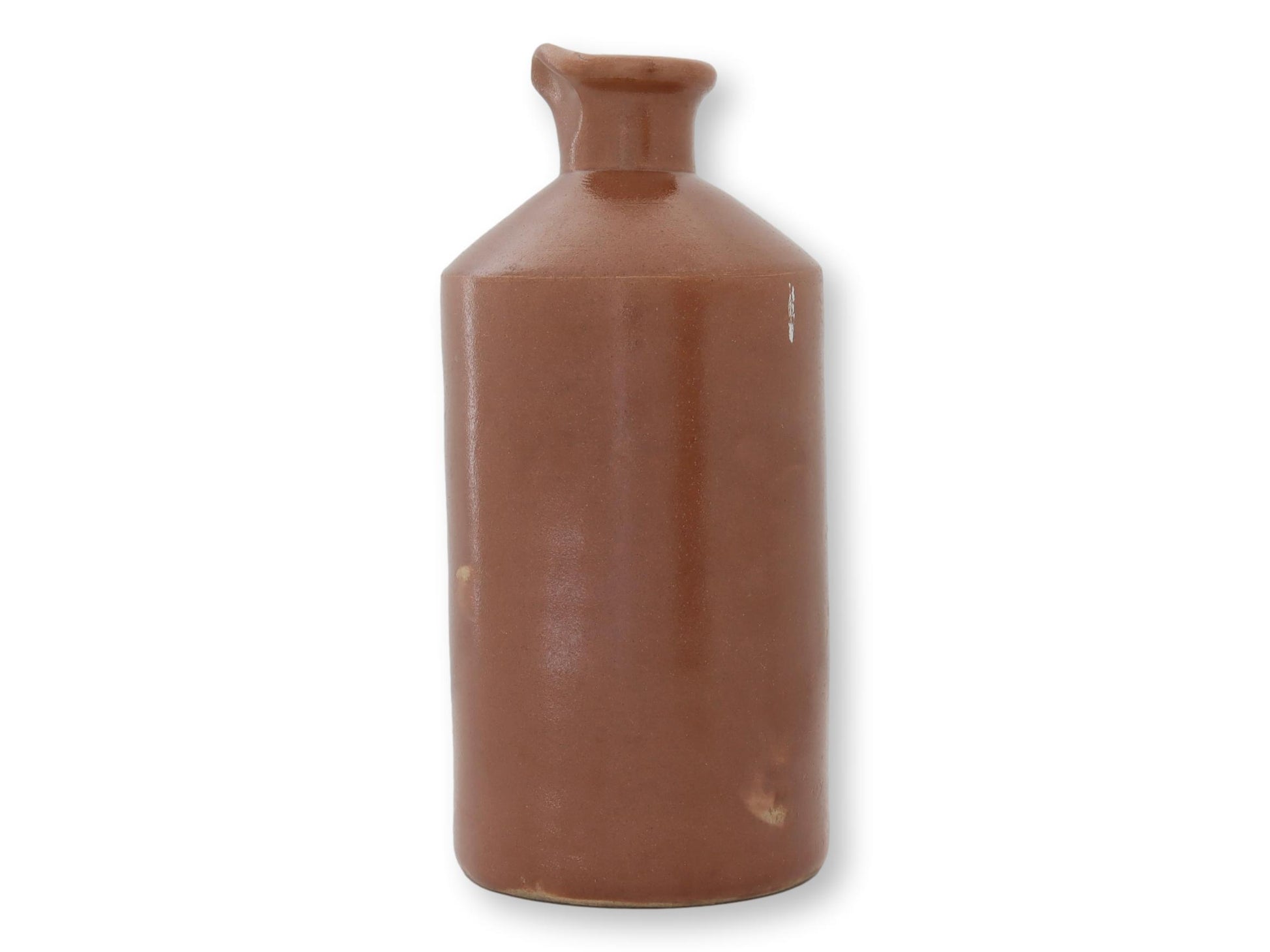 These robust stoneware ink bottles, with their rustic charm and glazed finish, now serve beautifully as unique flower holders or decanters. Their sturdy design and warm tones provide a vintage touch to any space.