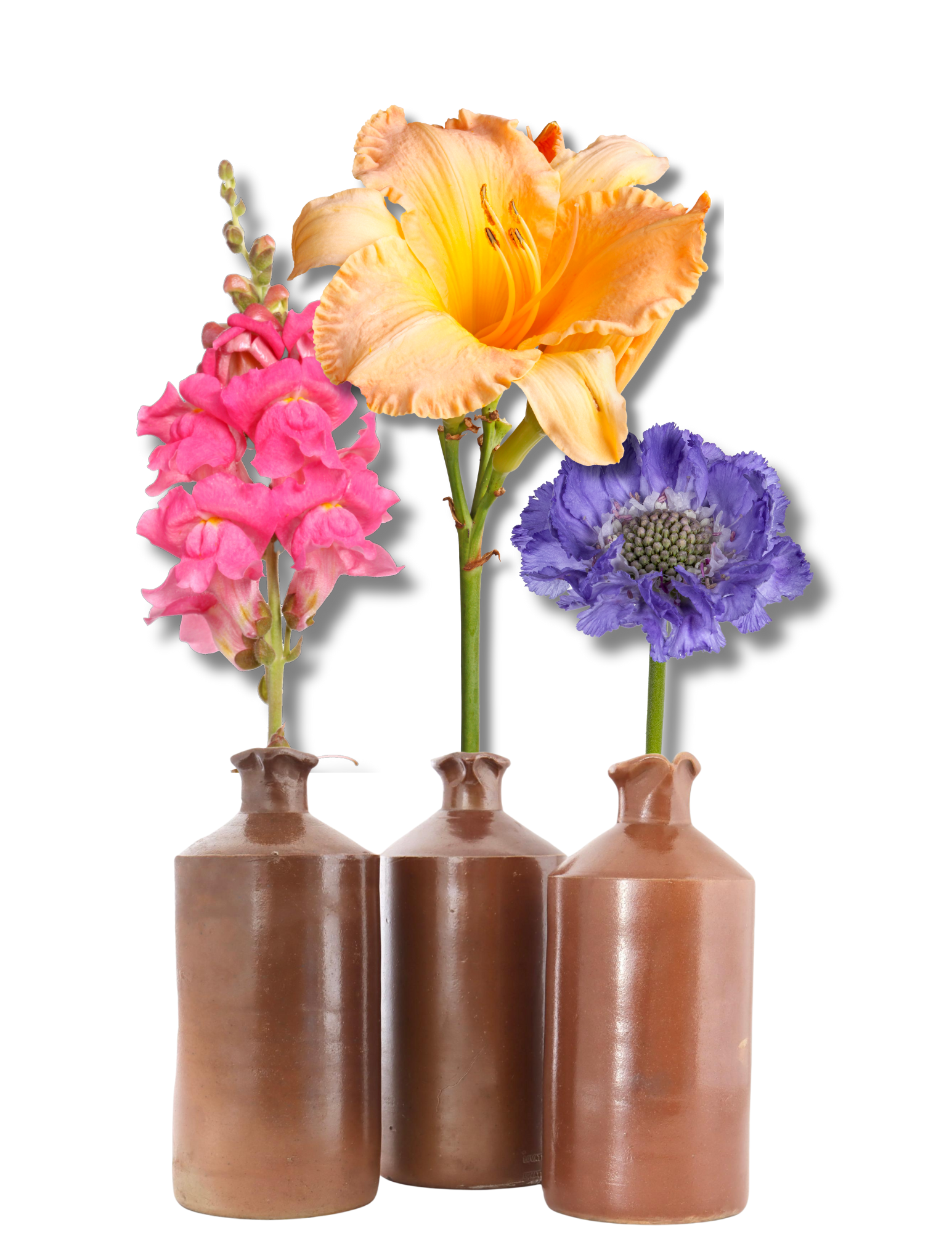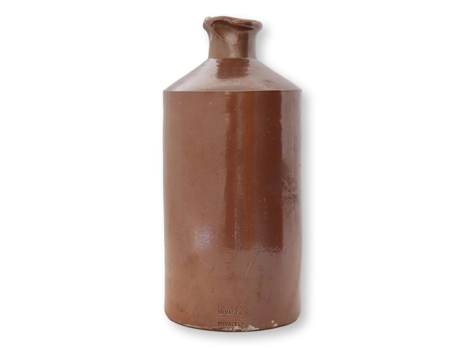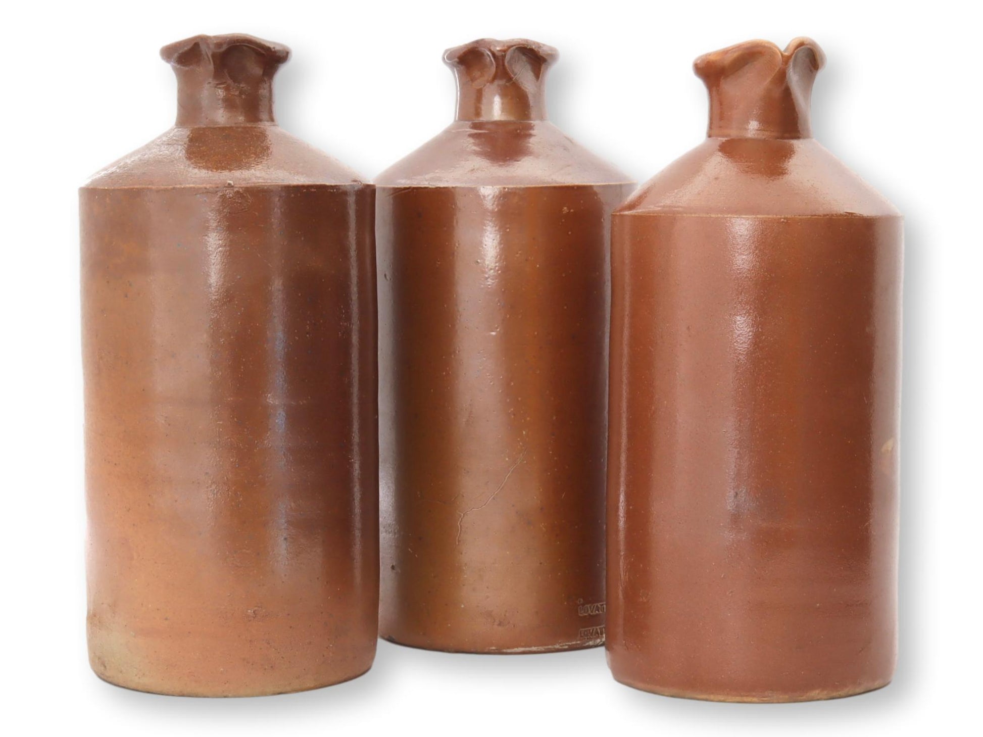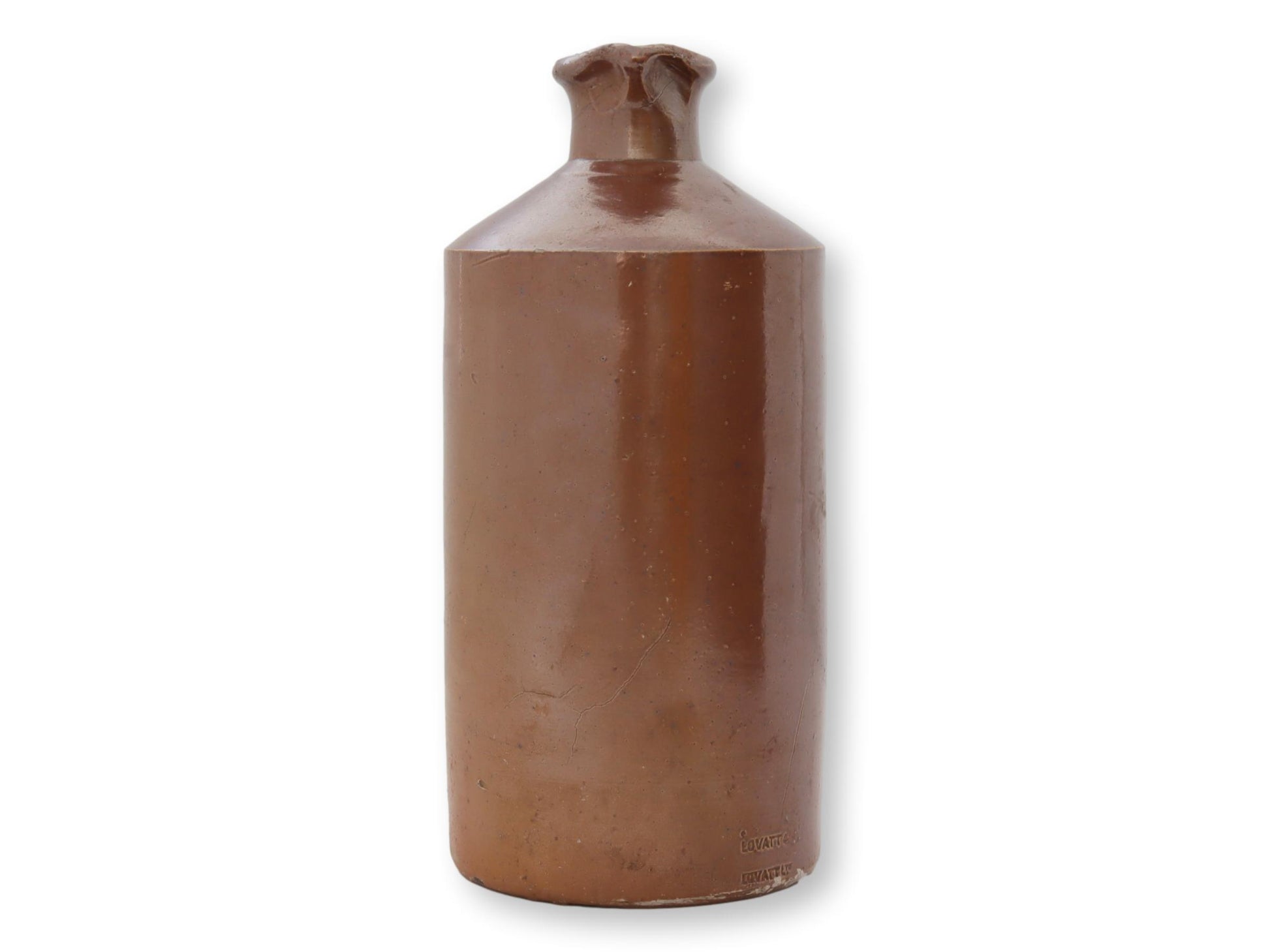 These robust stoneware ink bottles, with their rustic charm and glazed finish, now serve beautifully as unique flower holders or decanters. Their sturdy design and warm tones provide a vintage touch to any space.