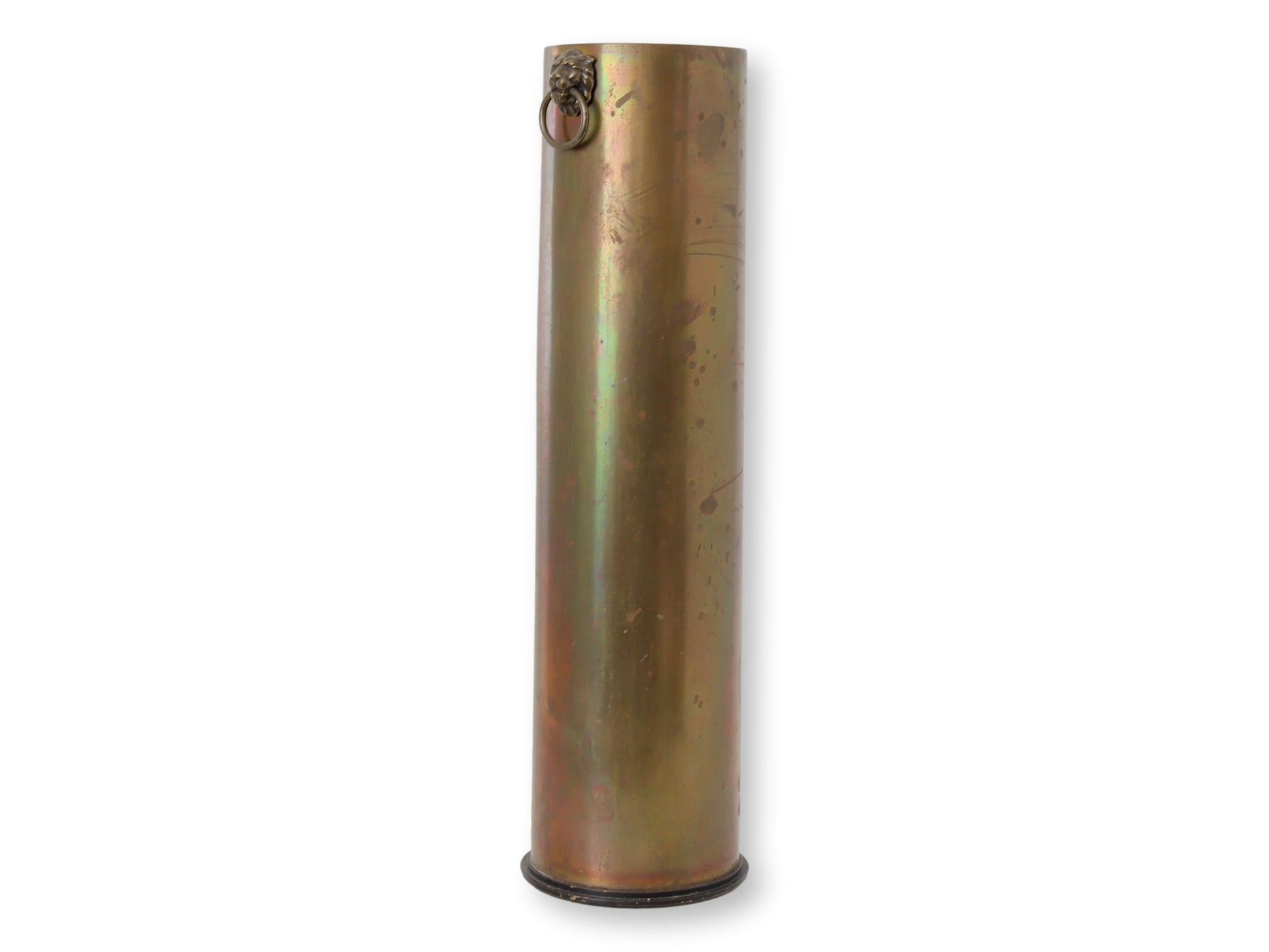 French WW1 trench art cane stand, a unique and historically significant piece with regal lion handles. Trench art refers to objects created by soldiers, prisoners of war, or civilians from the remnants of war, such as spent shell casings, and other materials found on the battlefield. These items were often made during downtime in the trenches or in convalescent hospitals,