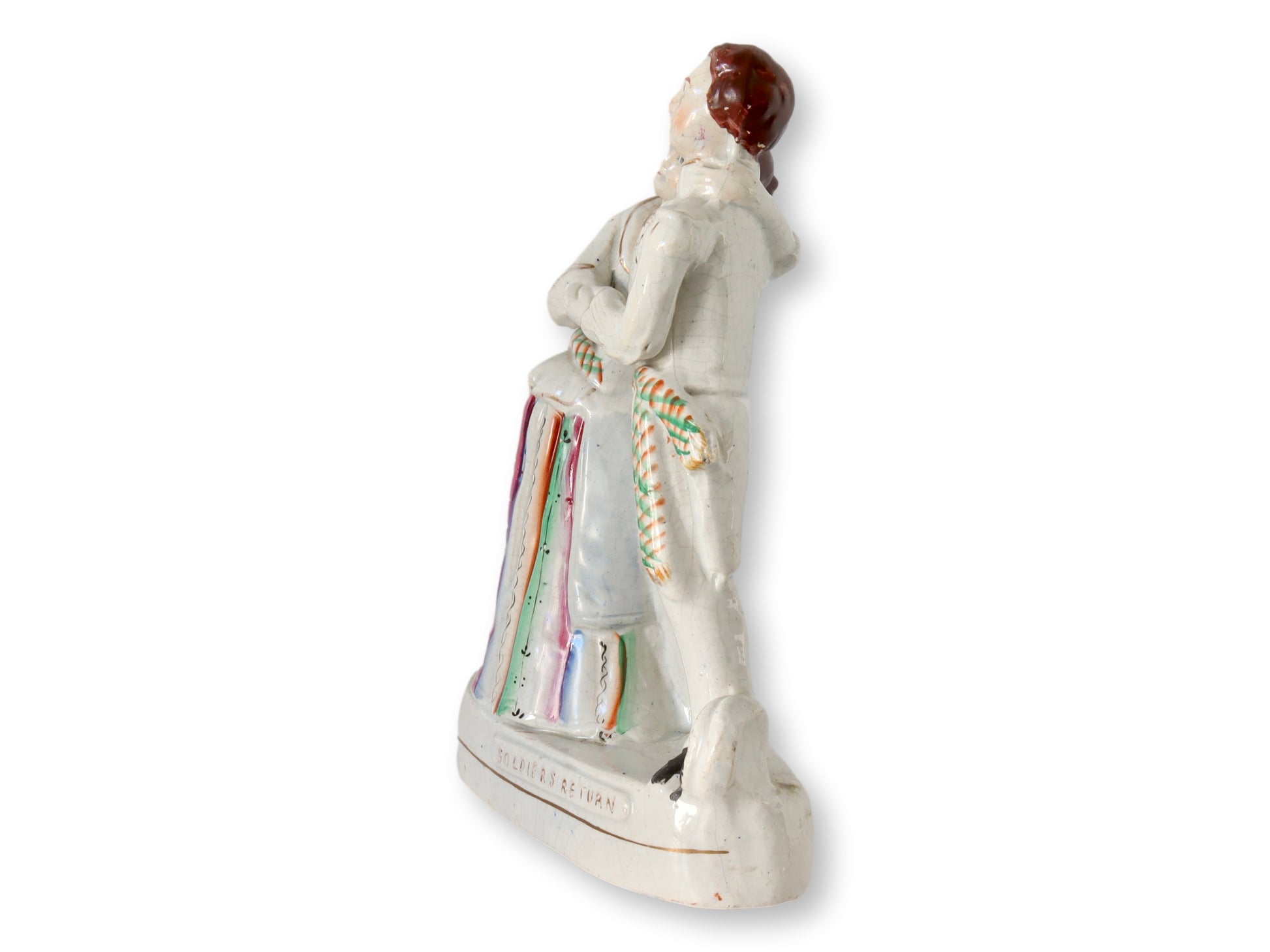 This antique Staffordshire figure, titled "Soldier's Return," beautifully captures the romantic moment of a soldier embracing his loved one upon returning home. The detailed craftsmanship and vibrant colors reflect the emotional depth and historical significance of this piece. A poignant representation of love and reunion.