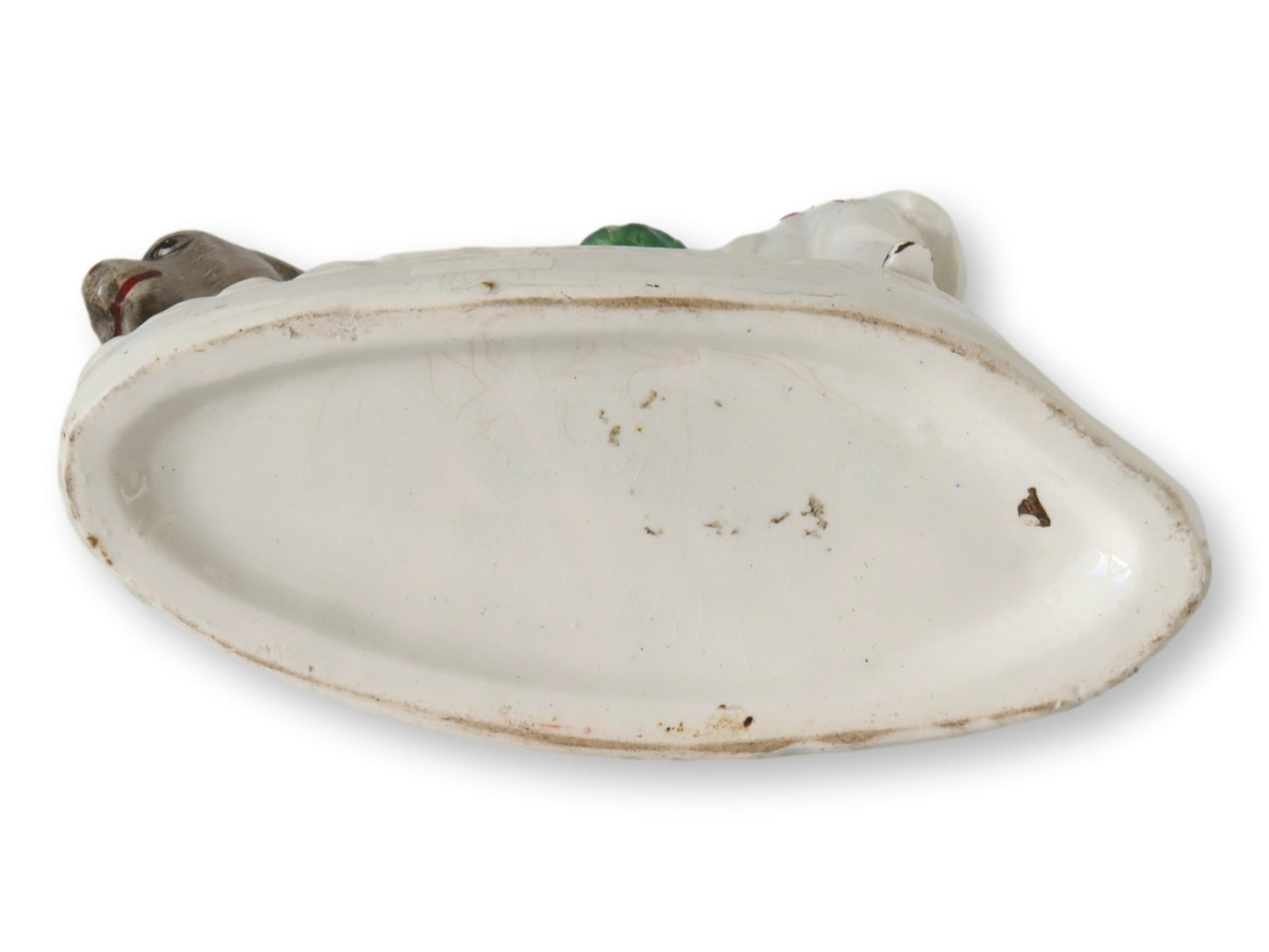 This rare English Staffordshire figurine, depicting a boy with a mule, is a charming example of traditional Staffordshire pottery. Despite the typical flaws and flakes that come with age, this piece retains its unique charm and historical value. The hand-painted details and expressive figures make it a standout addition to any collection of antique ceramics.
