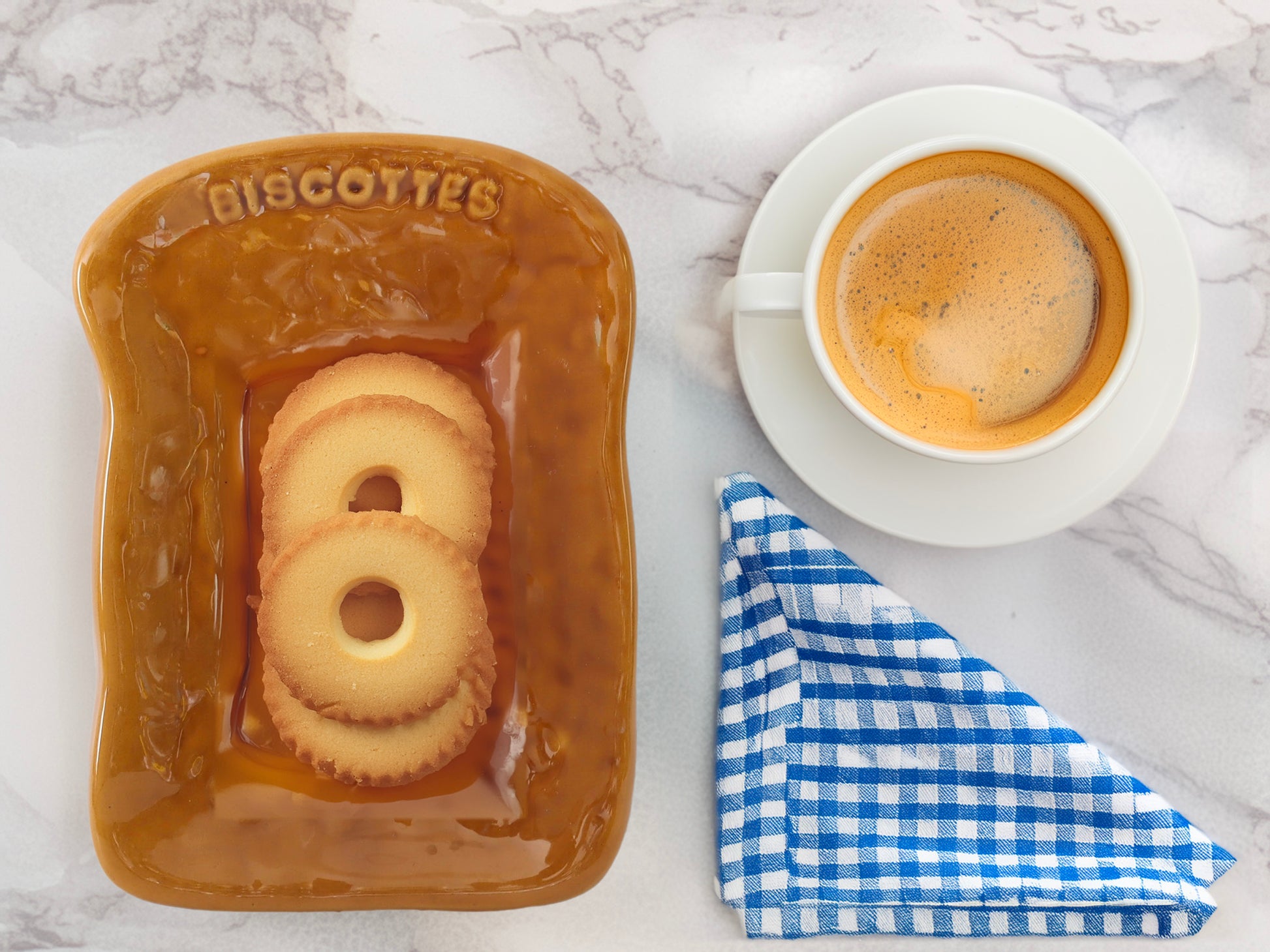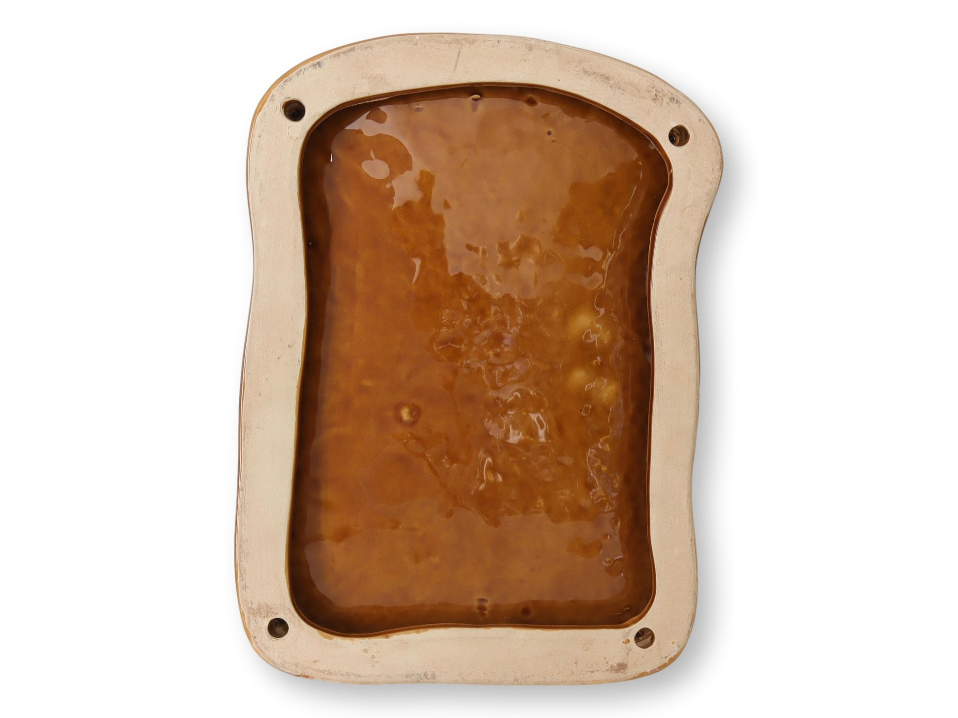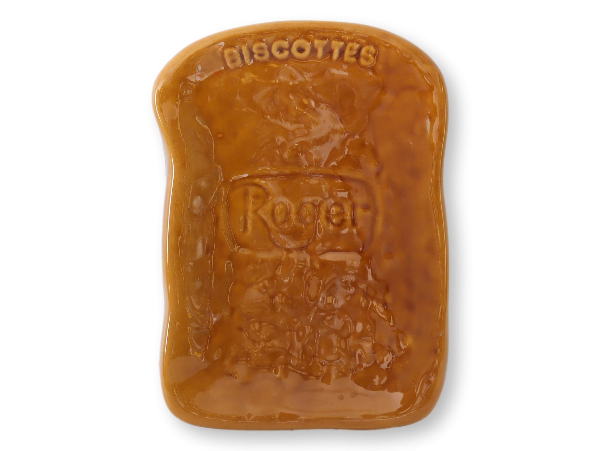 Unique French majolica advertising plate is a charming and rare find, perfect for collectors of vintage advertising memorabilia. Shaped like a slice of toast, this plate prominently features the word "Biscottes" along with the brand name "Roger," showcasing the delightful and creative design typical of French majolica. A nostalgic tribute to early 20th-century French advertising. Perfect for serving morning toast or a selection of cookies.