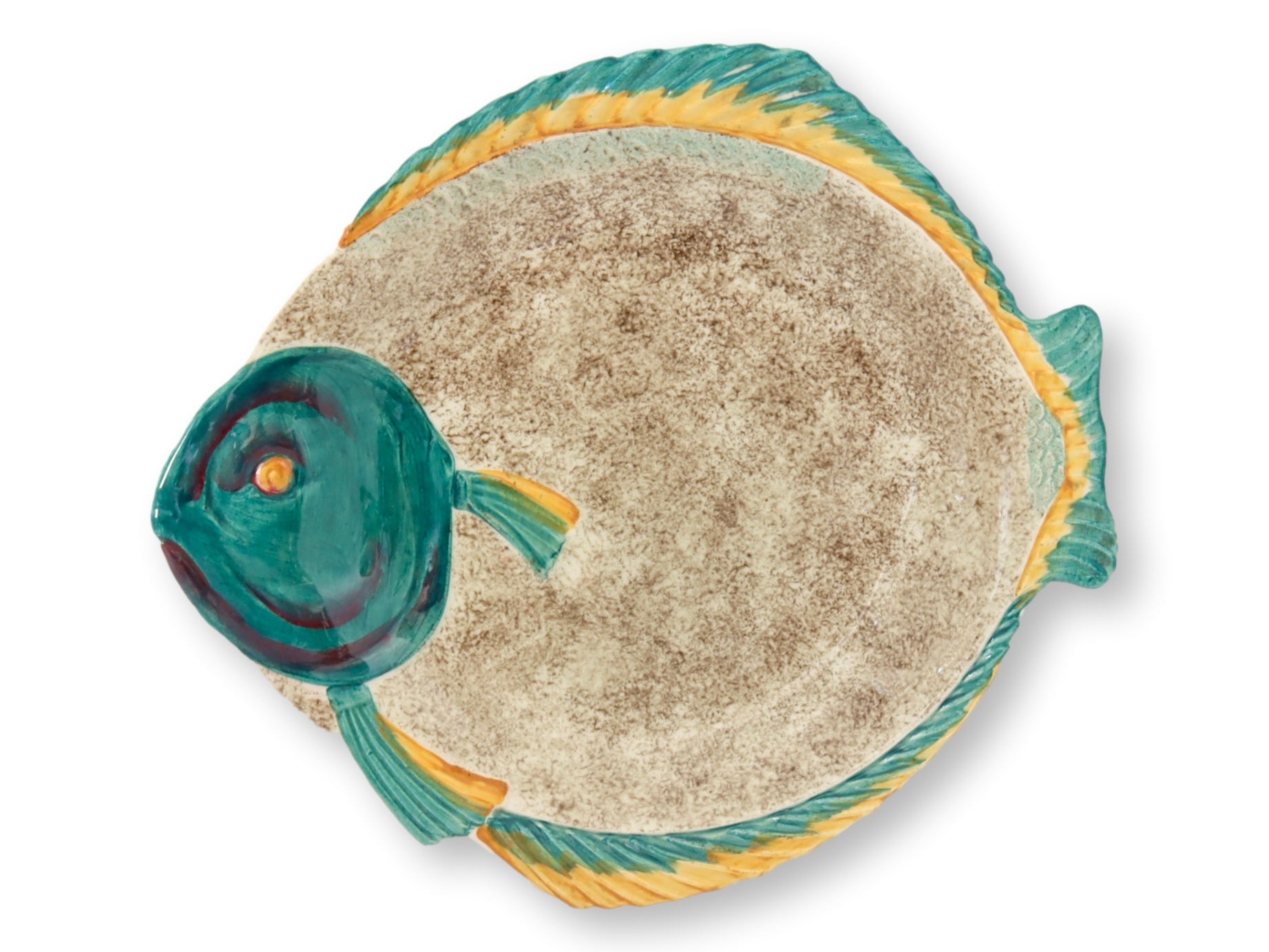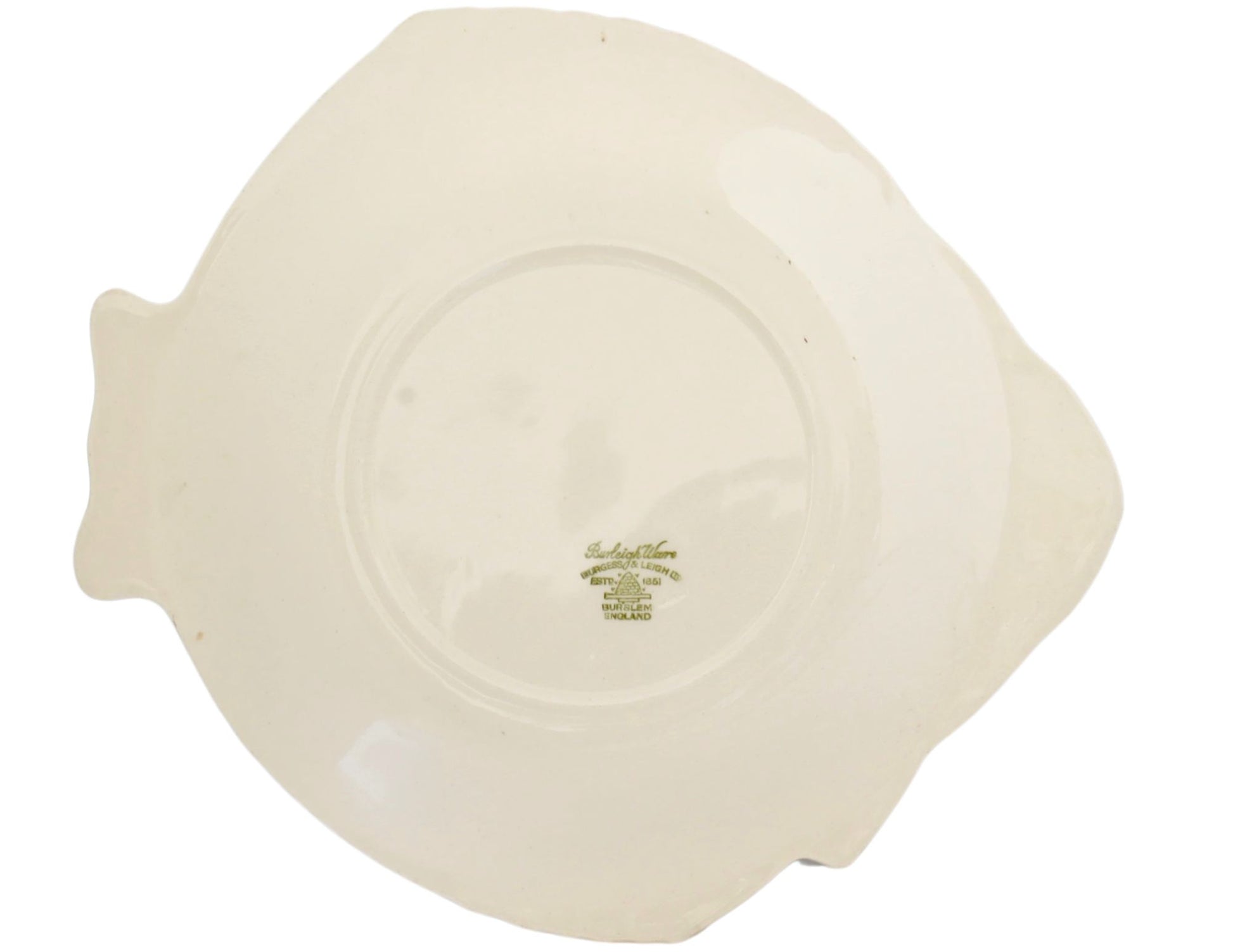 Vibrant midcentury English Burleigh Ware fish set, a striking example of colorful ceramic artistry. Includes beautifully crafted fish-shaped plates and matching sauce boat, adorned with vivid teal and yellow accents that bring the underwater theme to life. Perfect for serving seafood or adding a playful touch to your table setting, showcasing the whimsical charm of Burleigh Ware.