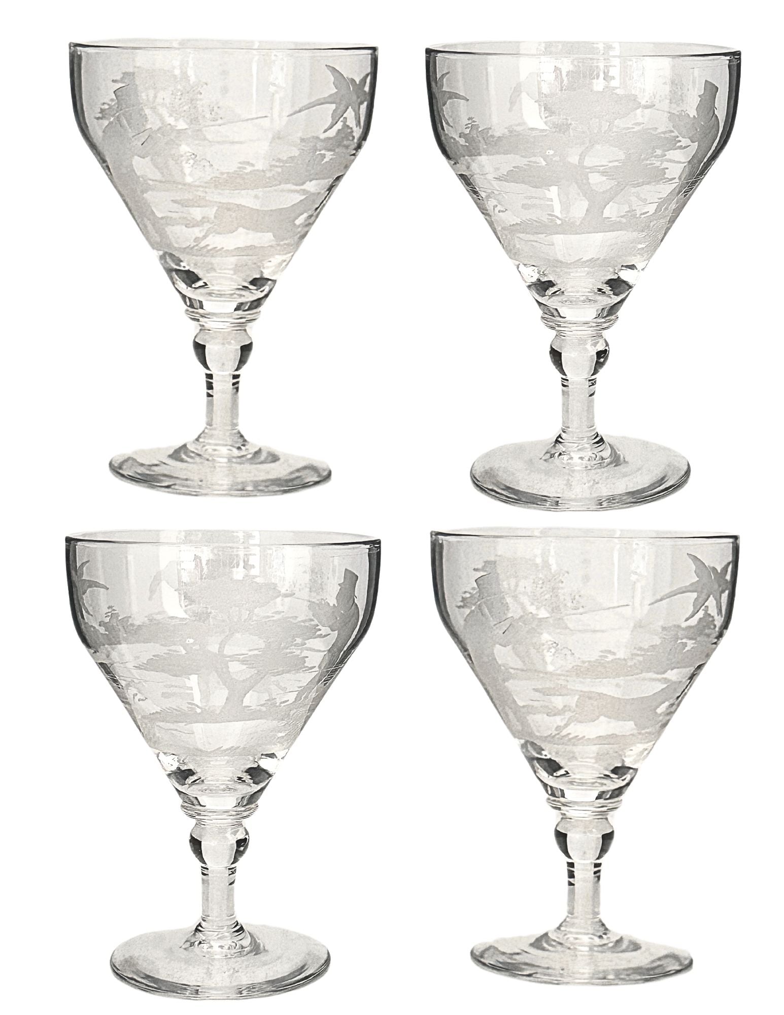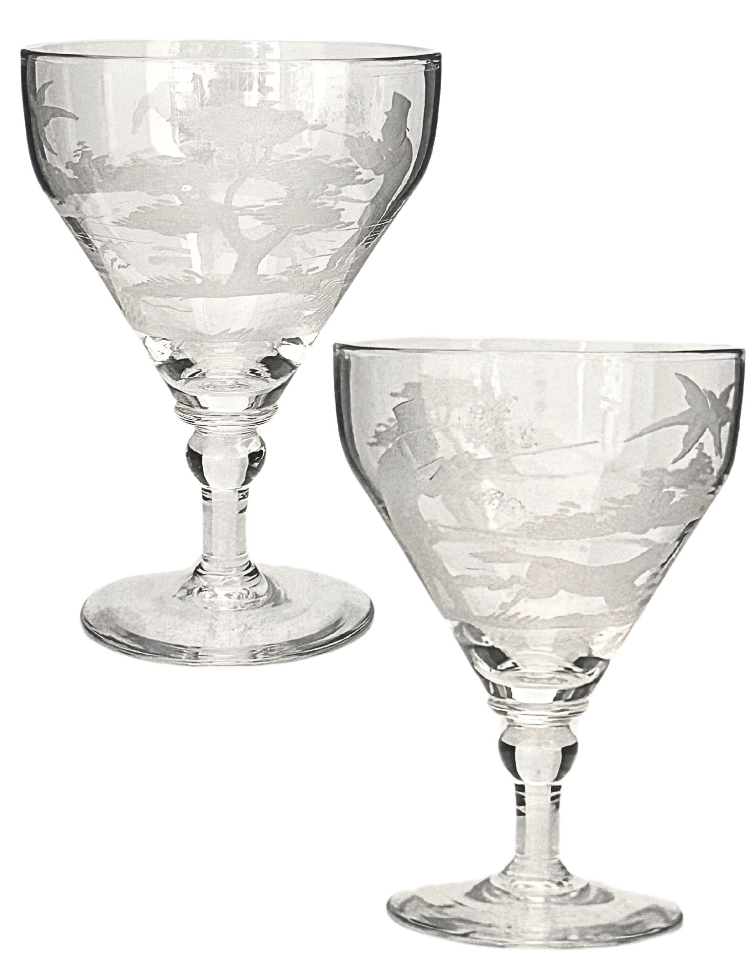 This set of four large rummers, dating to the late Georgian period, showcases beautifully etched pheasant hunting scenes. The intricate engravings capture the dynamic energy of the hunt, set against a backdrop of trees and wildlife. Their generous size and historical charm make them perfect for serving wine or punch, adding a touch of timeless sophistication to any gathering. An elegant tribute to the sporting traditions of the era, these rummers are a collector's dream.