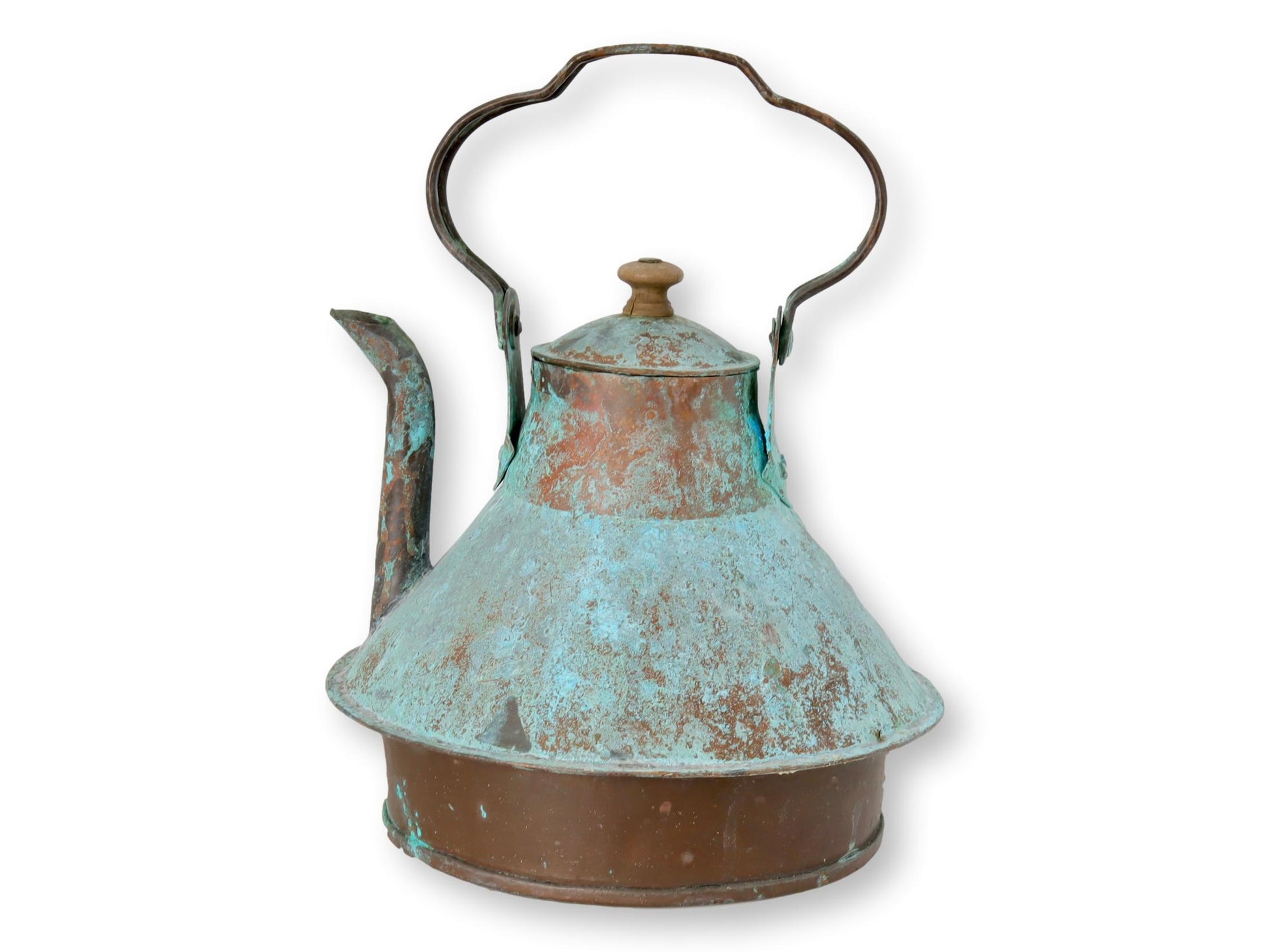 This vintage copper kettle with a striking verdigris patina is a decorative piece that adds rustic charm and antique appeal to any space. The naturally aged copper and verdigris give it a unique, weathered look, perfect for enhancing a farmhouse or vintage-inspired decor. While not functional for boiling water, its timeless design makes it a beautiful display item, ideal for adding character to a kitchen shelf, mantle, or dining area. A perfect find for collectors of vintage copperware.