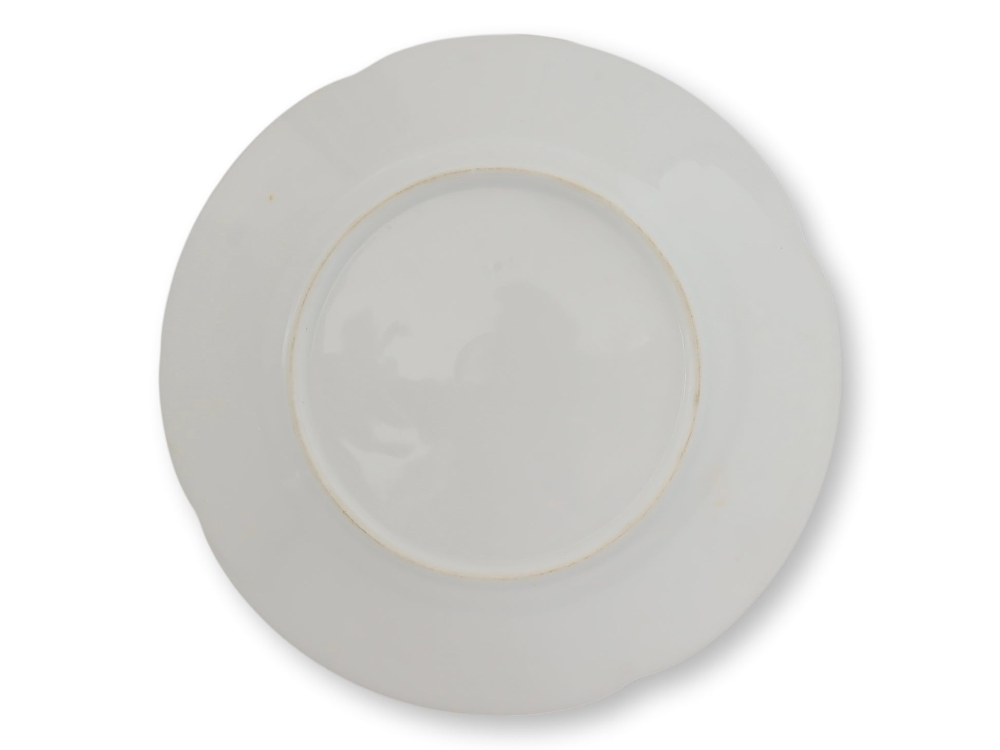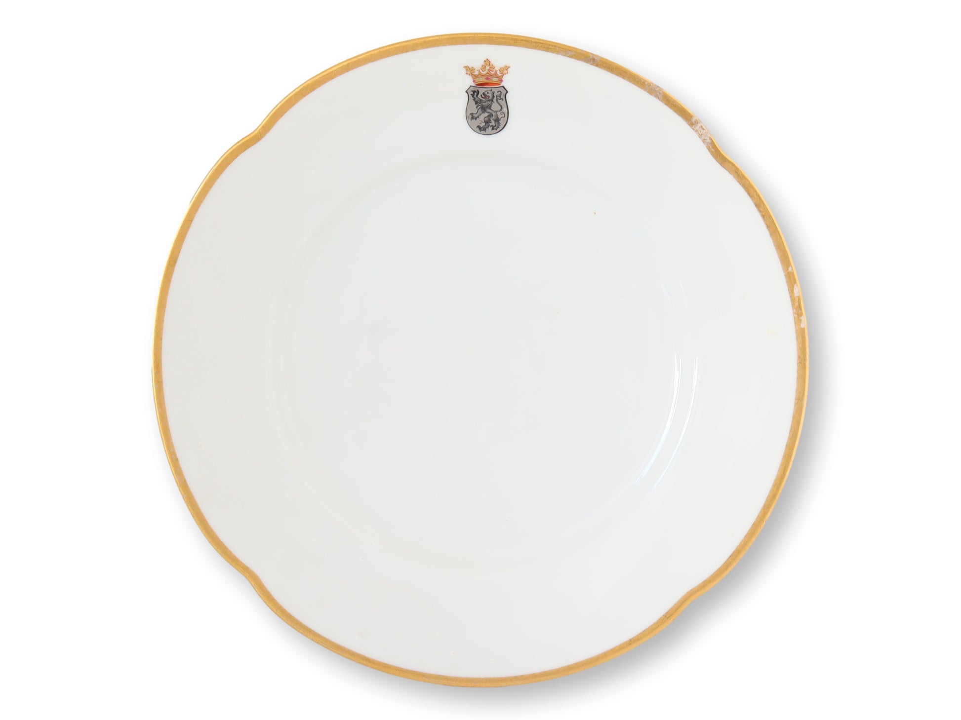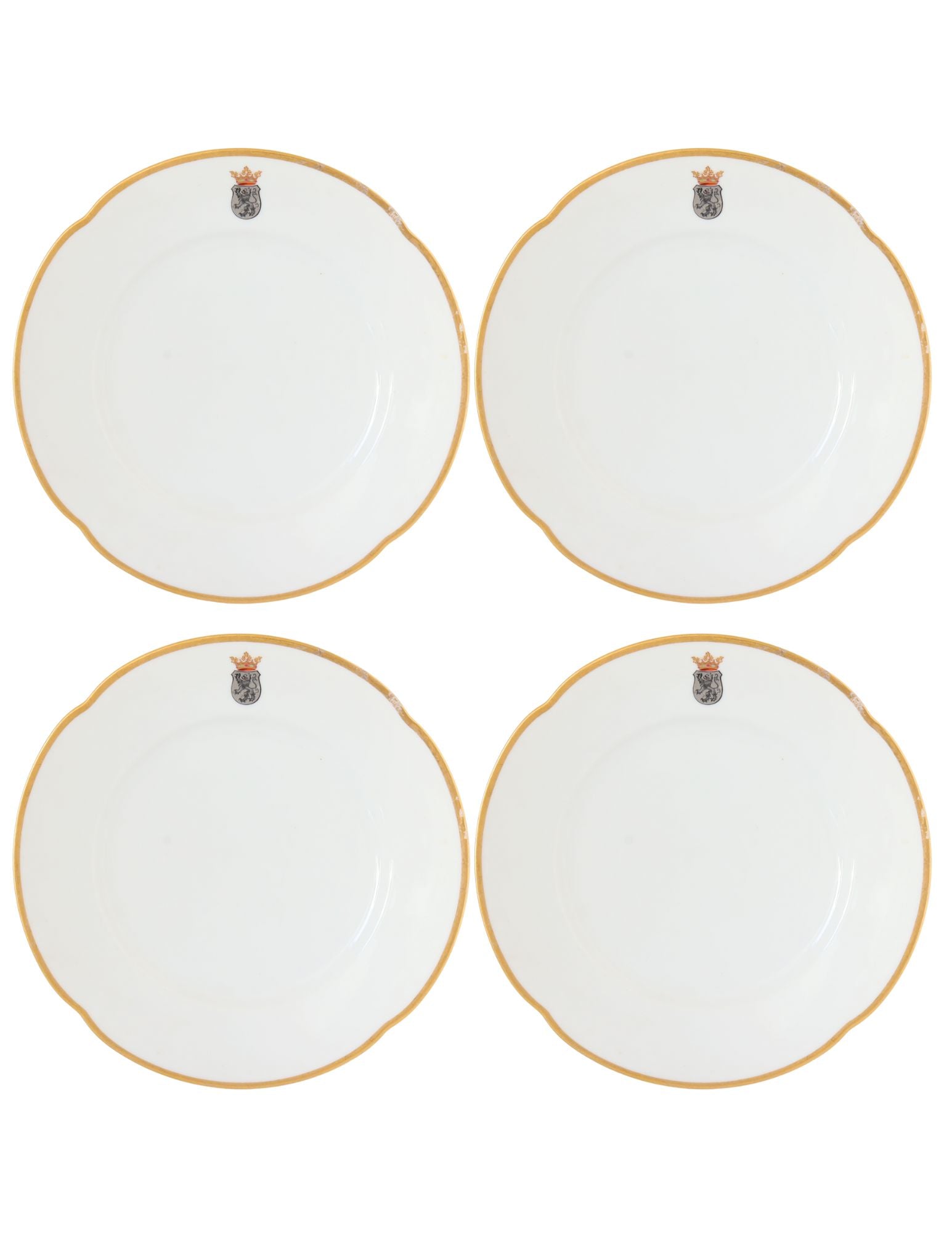 Set of four English porcelain plates, circa 1880, each bearing a gold-rimmed border and noble family crest crowned in red. Scalloped rims and faint impressed English mark on reverse. Elegant for display or formal entertaining.