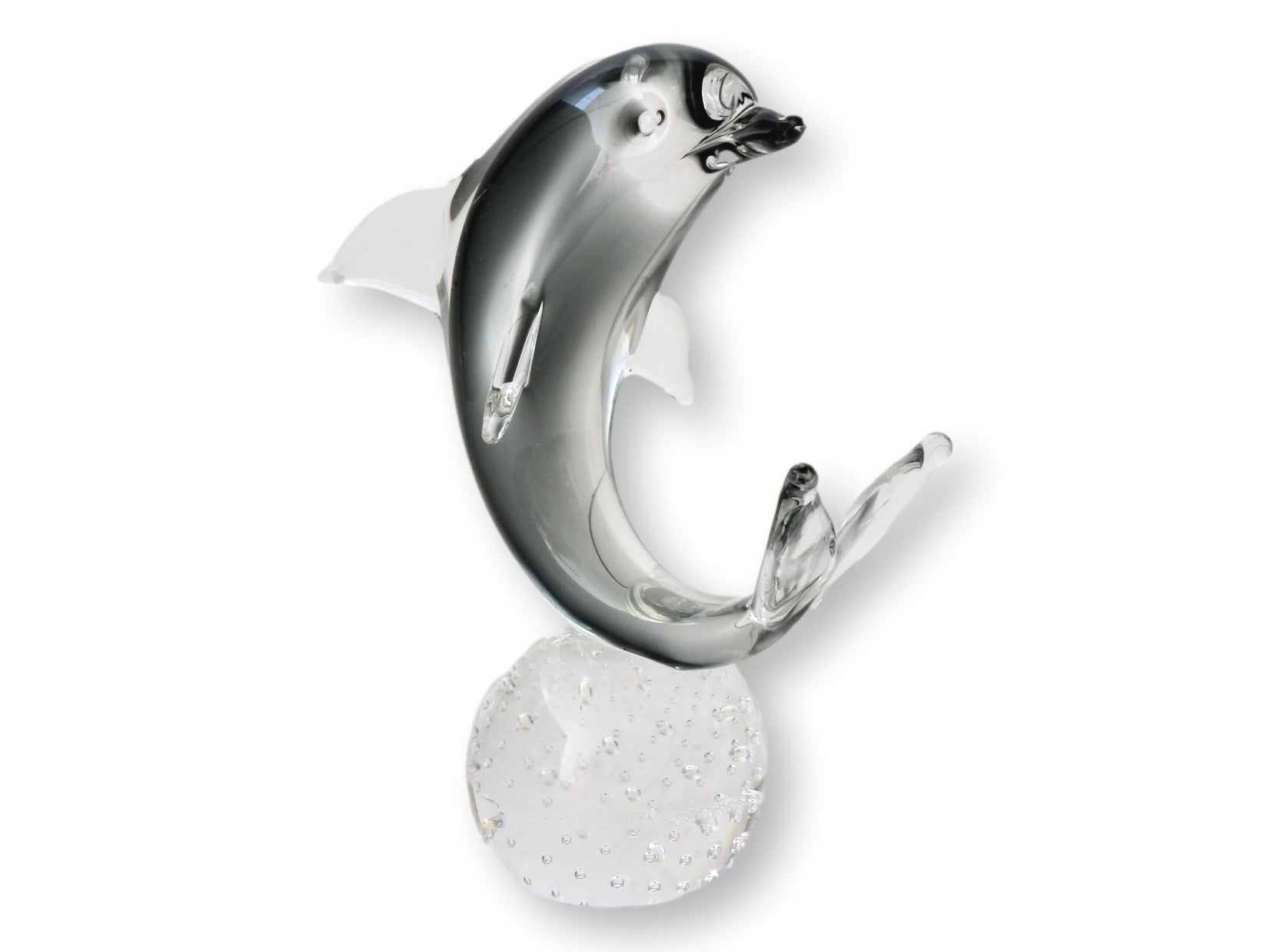 Striking handblown art glass dolphin poised on a bubble-filled glass sphere base. Sculpted in clear, heavy crystal-like glass with subtle reflective highlights, the form captures the movement and grace of the leaping dolphin. A beautiful display of balance and craftsmanship, perfect for coastal interiors or midcentury-inspired décor.