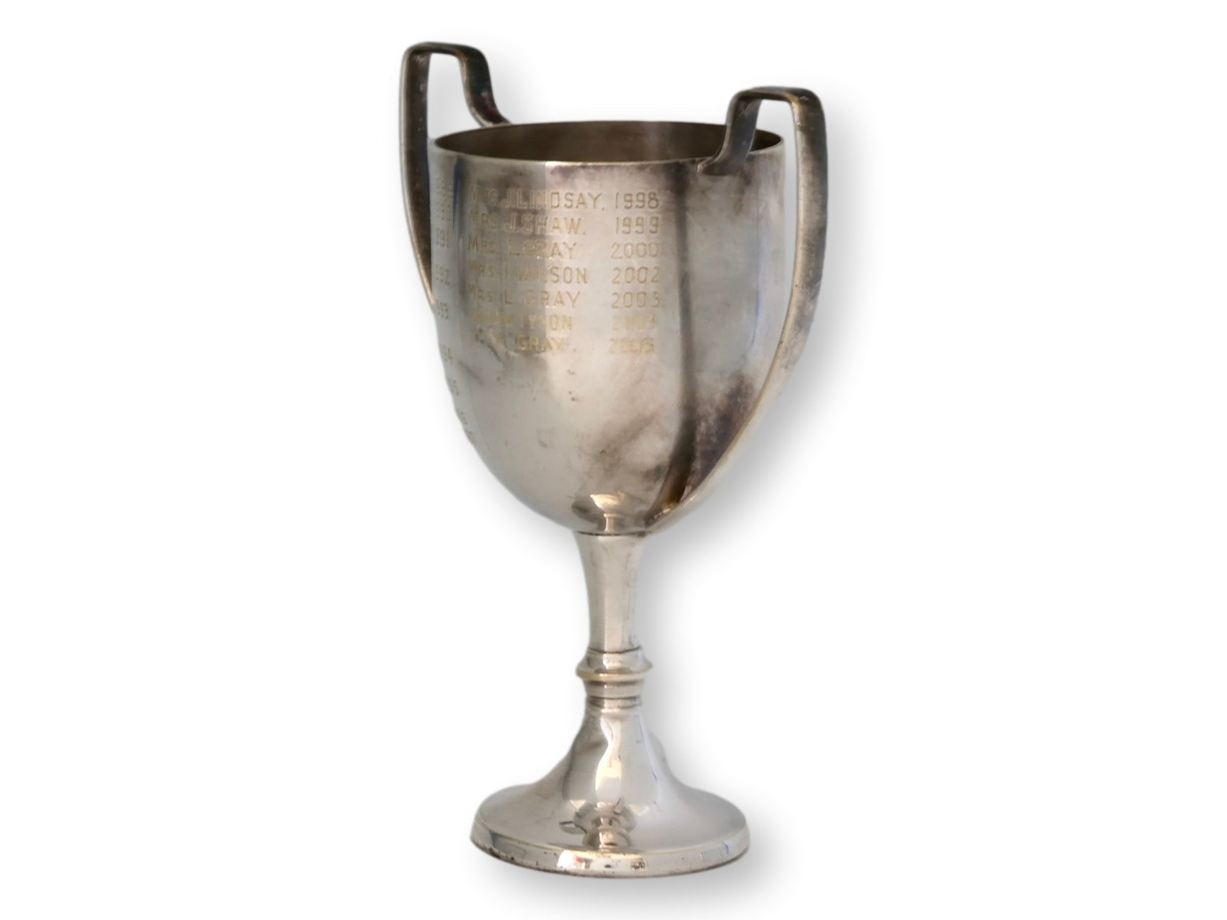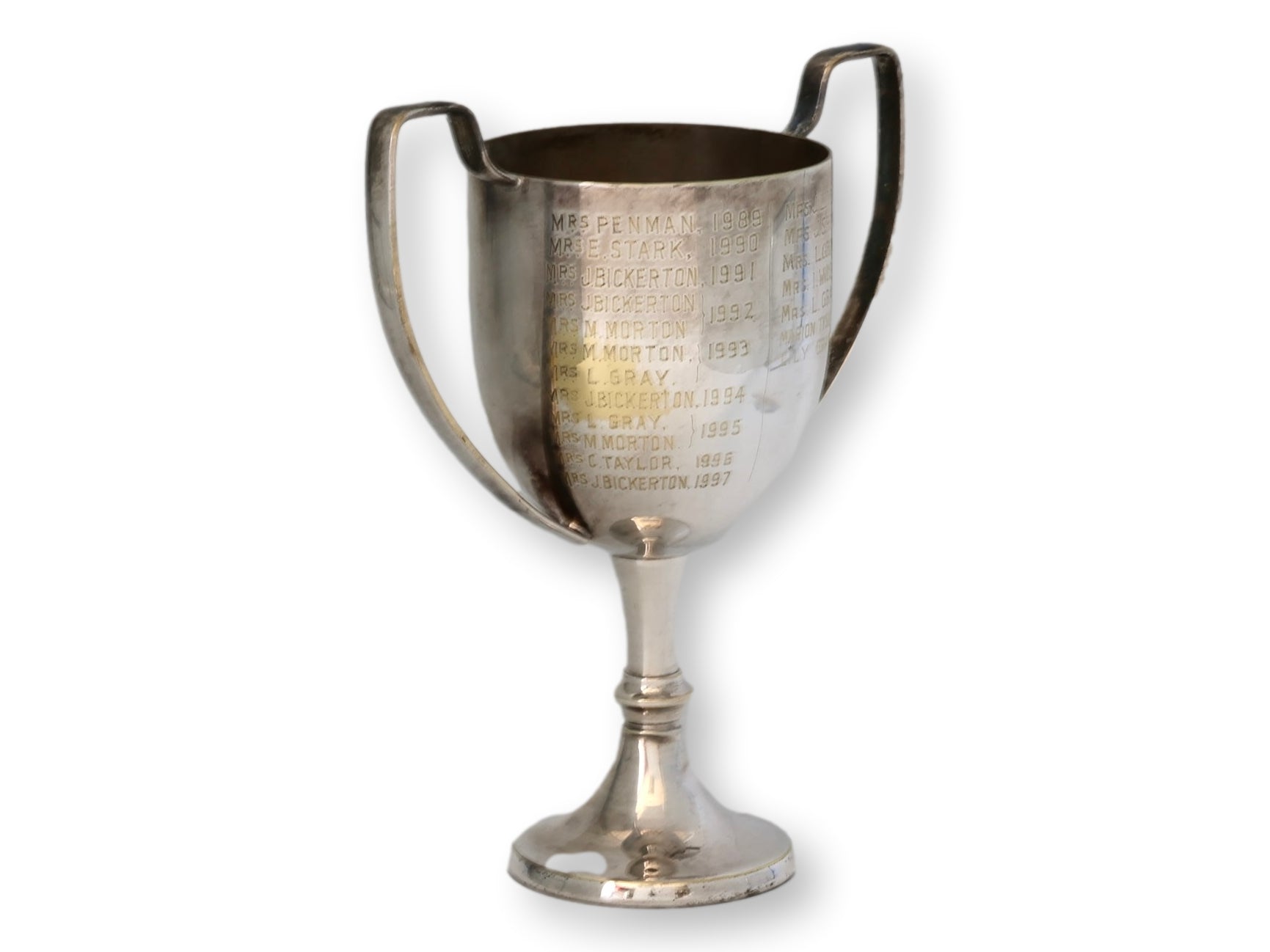 Elegant 1930s English silver-plate trophy cup engraved for a Waltzing Competition, with winners listed from 1929–1936. Tall, goblet-style form with a beaded base and gently tapered silhouette. A refined and charming addition to your display shelf, bar tray, or floral vignette. Silver-plate hallmarks on rim of the cup.