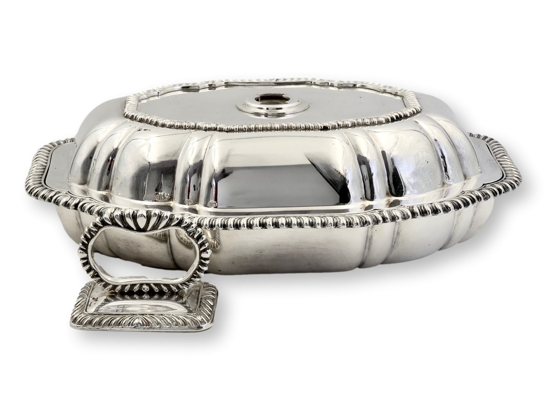 With softly fluted sides, bold gadroon edging, and a removable handled lid, this piece was designed for formal tables—but adapts beautifully to modern entertaining. The clever construction allows the lid to lift off and double as a second serving dish, creating an elegant two-tier moment for your spread.