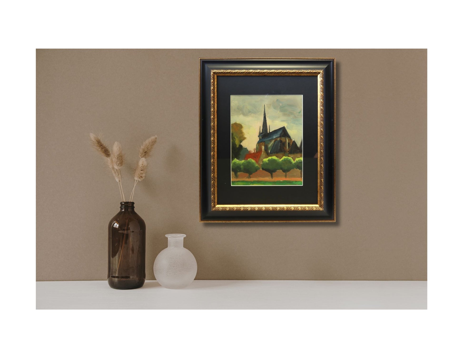 Add a touch of charm with this small vintage French rural church painting. Featuring vibrant colors typical of the early to mid 20th century, this newly framed artwork captures the serene beauty of the countryside. Perfect for art enthusiasts and collectors, it brings a unique, timeless appeal to any room. The trees in the painting appear to be deciduous trees, likely typical of the French countryside, with lush green foliage.