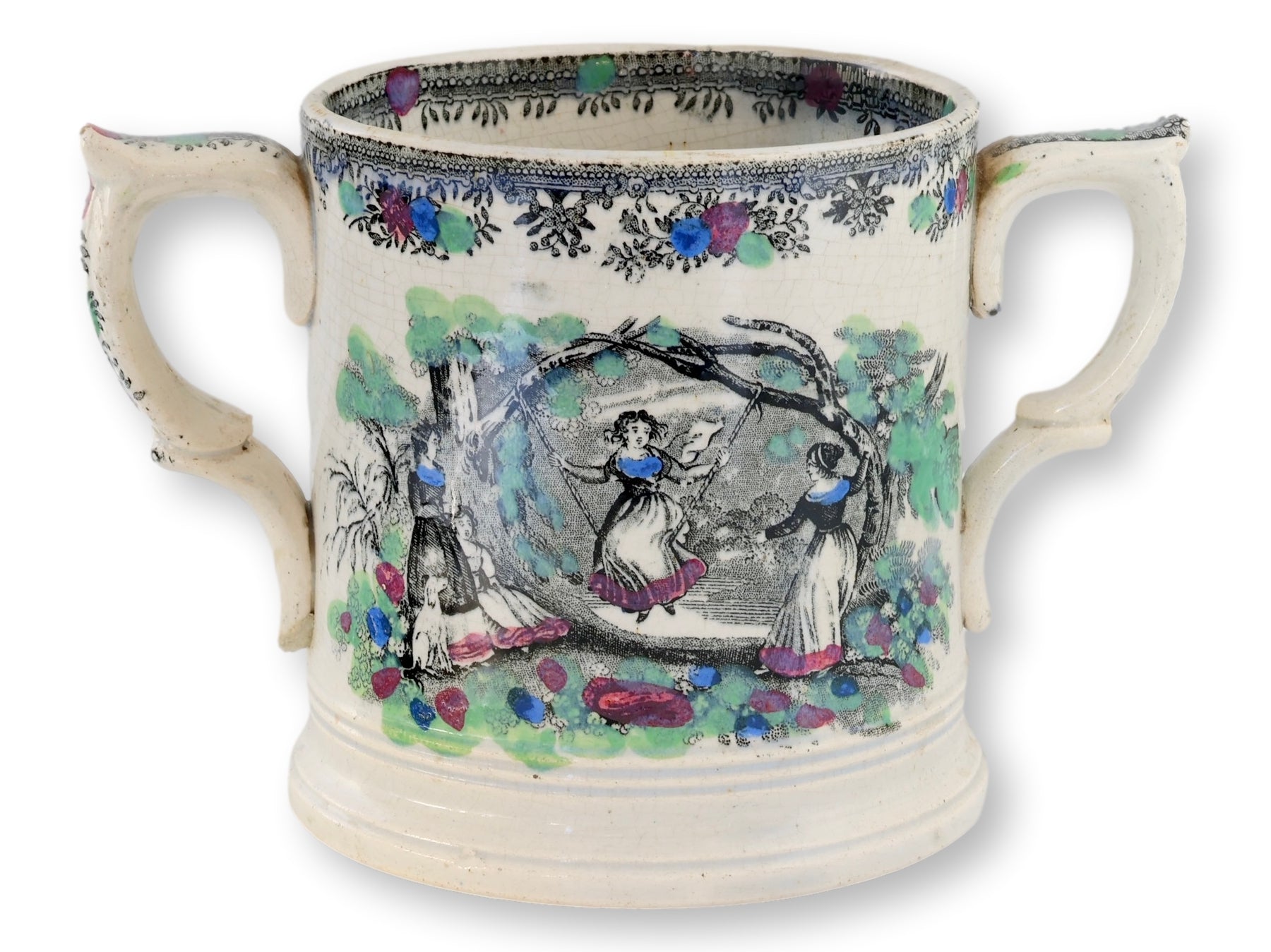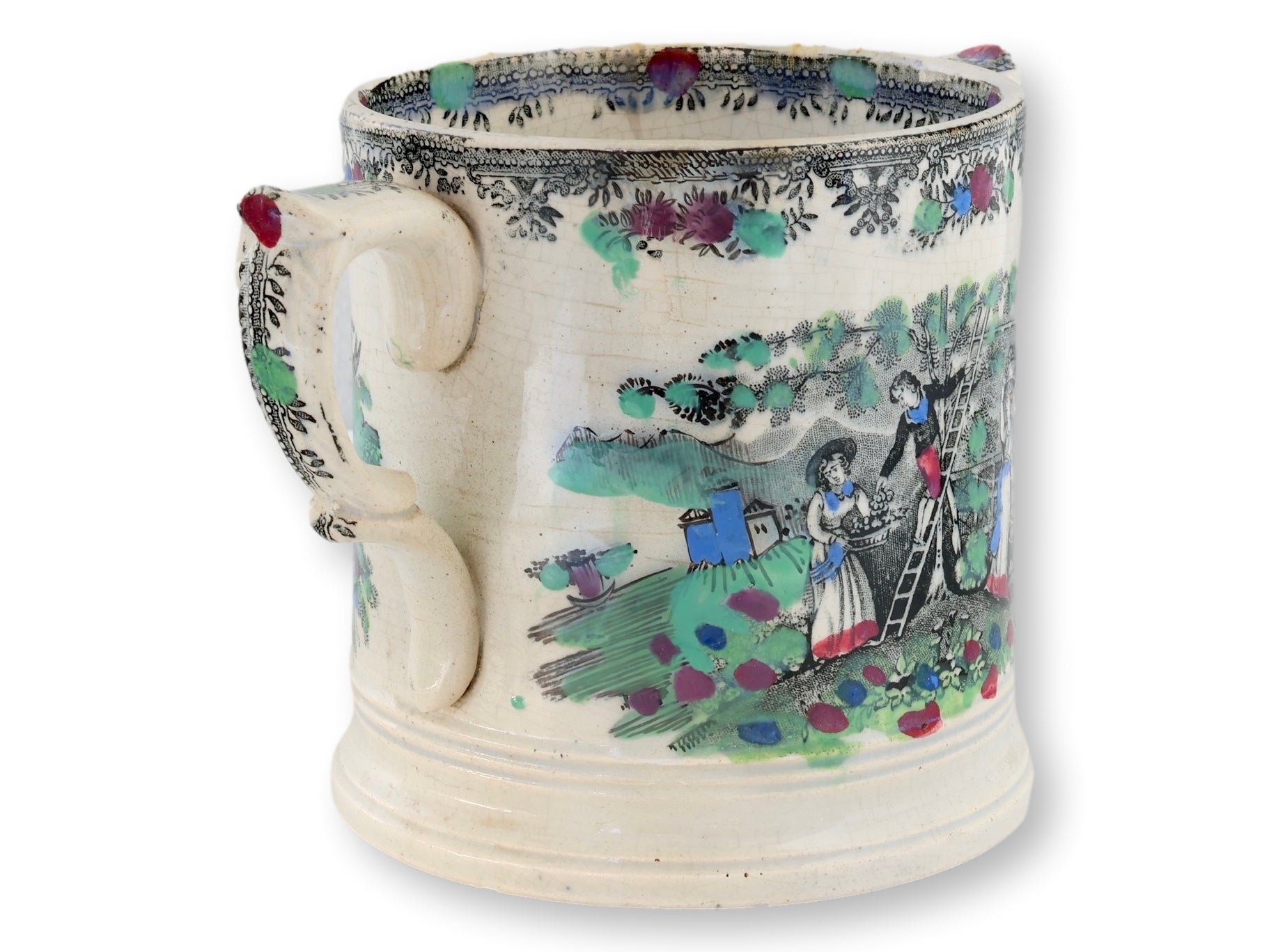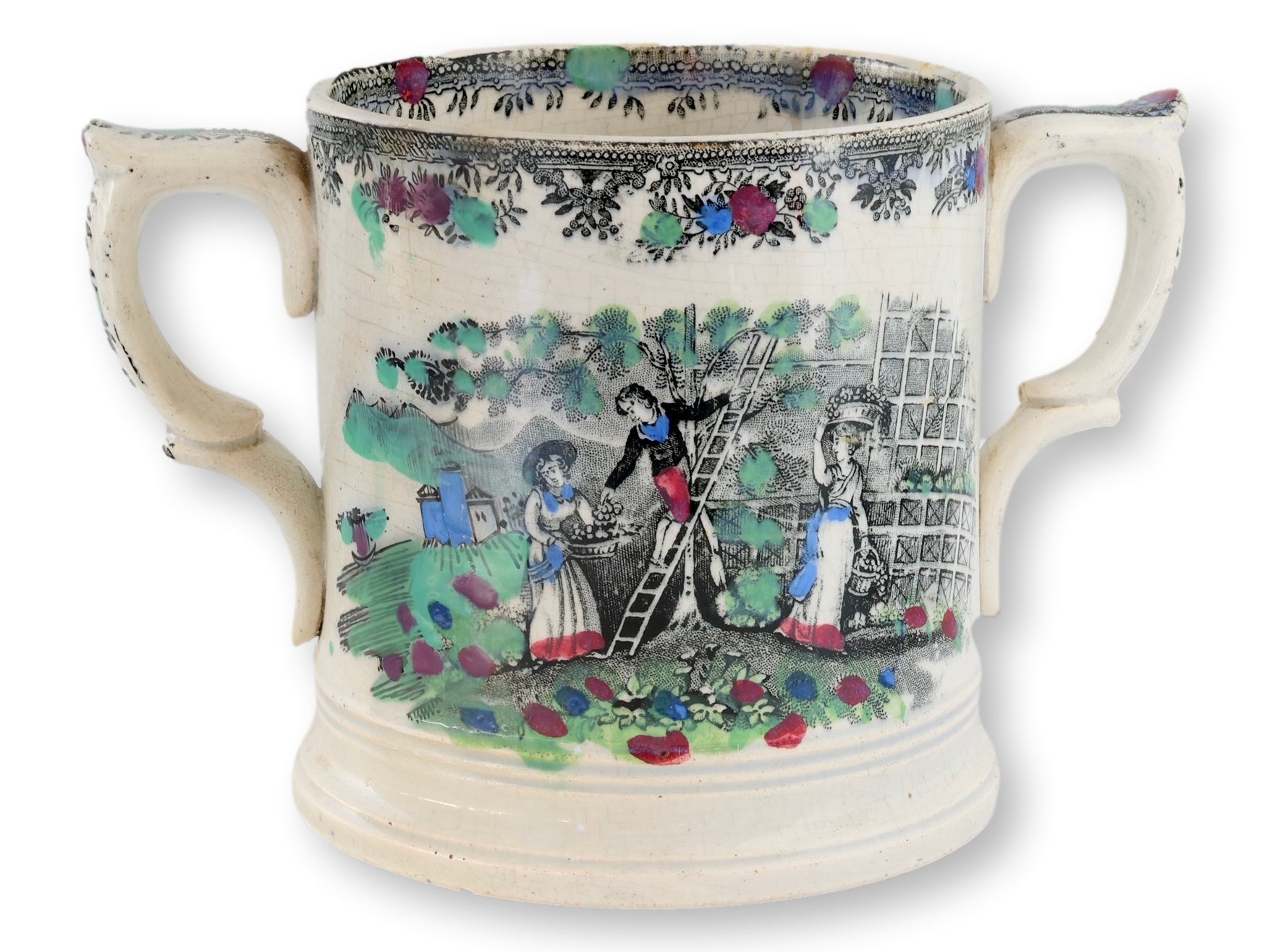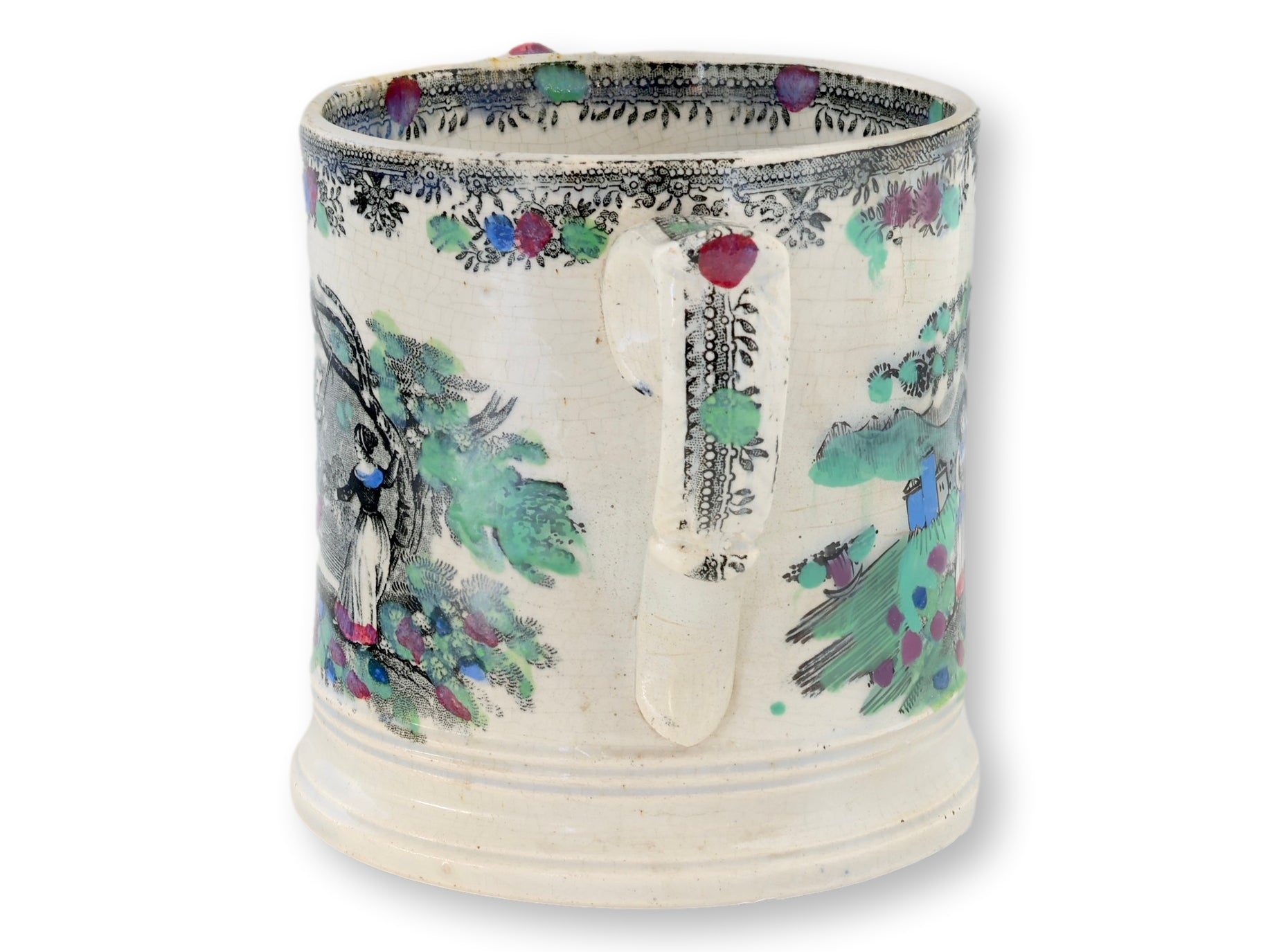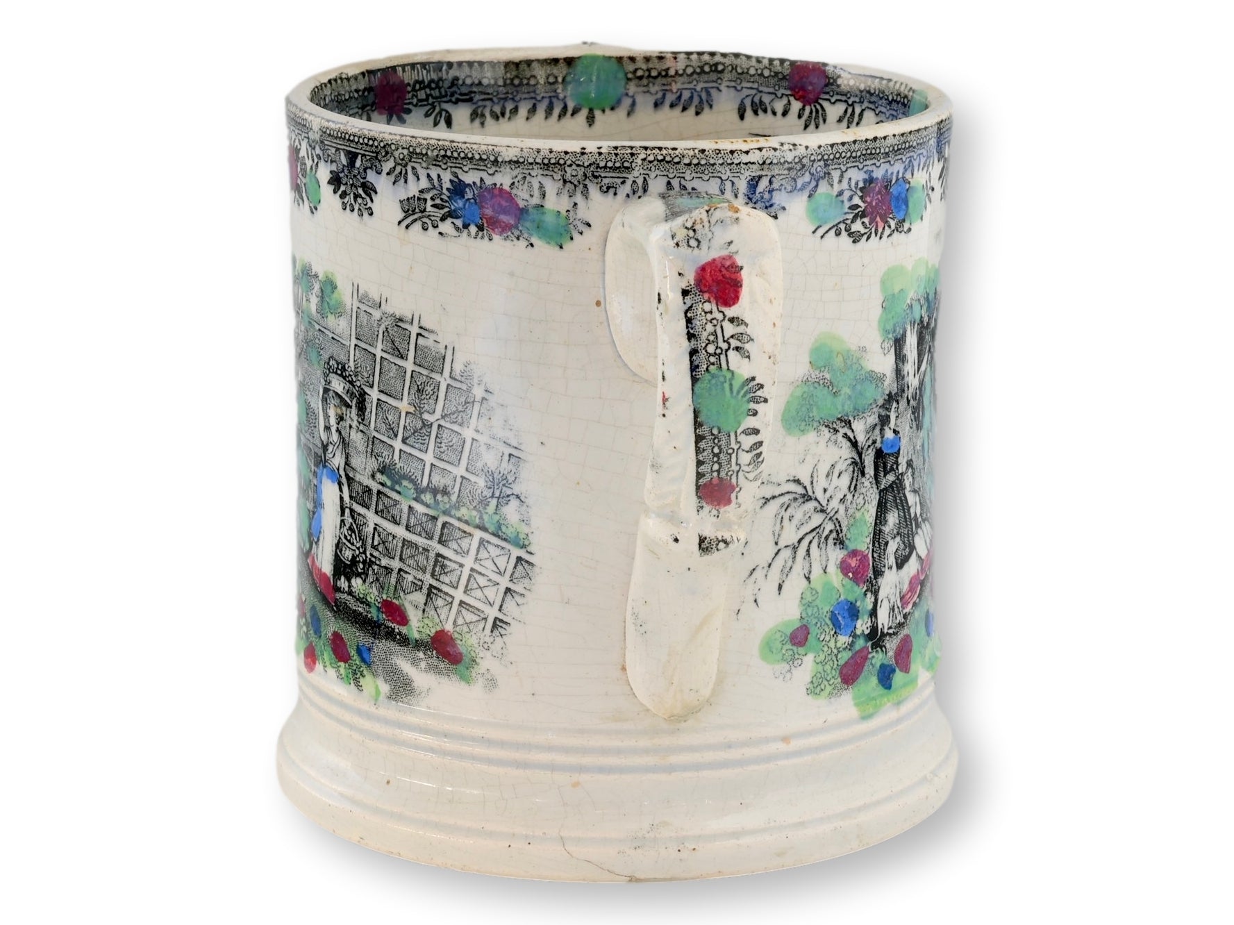 Mid-19th century English frog mug featuring classic black transferware decoration with hand-painted enamel highlights and a pearlware glaze typical of the 1840s–50s. The surprise inside: a molded and painted 3D frog, cleverly hidden at the base of the cup to “greet” the drinker. Double handles and charming figural detail make this a collector favorite. No maker's mark, as is common for the period. Large, 1 pint size.