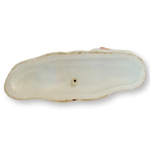 A classic bit of Victorian drama, frozen in ceramic. This mid-19th century Staffordshire figurine features a sleek greyhound (or perhaps a noble whippet) keeping close watch over a rather defenseless rabbit. Likely made around 1850, it’s unmarked—as most early Staffordshire pieces are—but rich in detail from the alert stance to the subtle hand-painted accents. A striking addition to any canine collection, or a perfect conversation piece for the bookshelf or mantel.