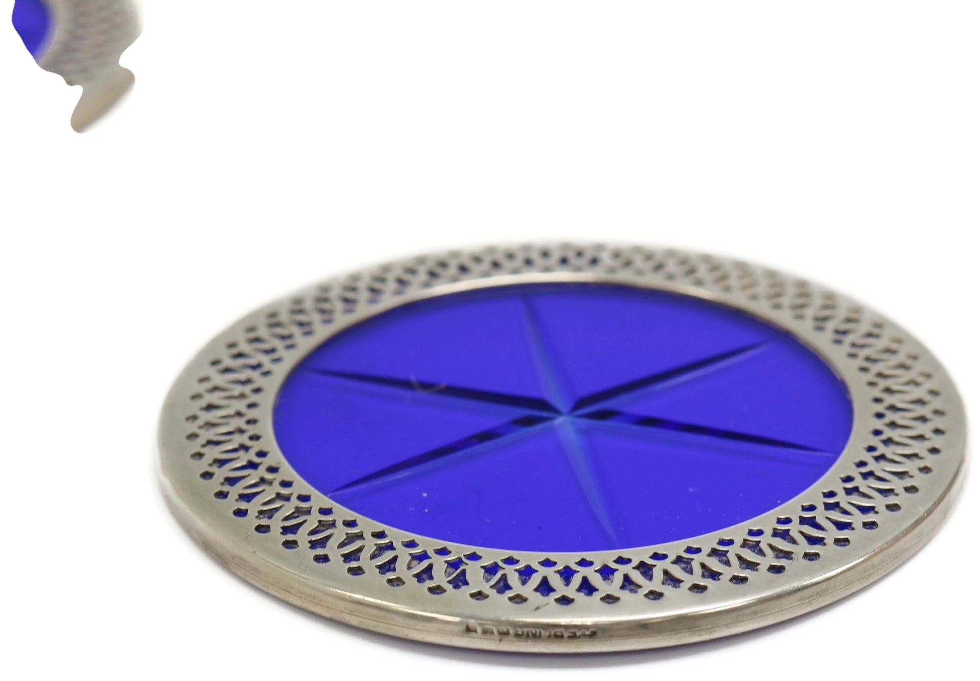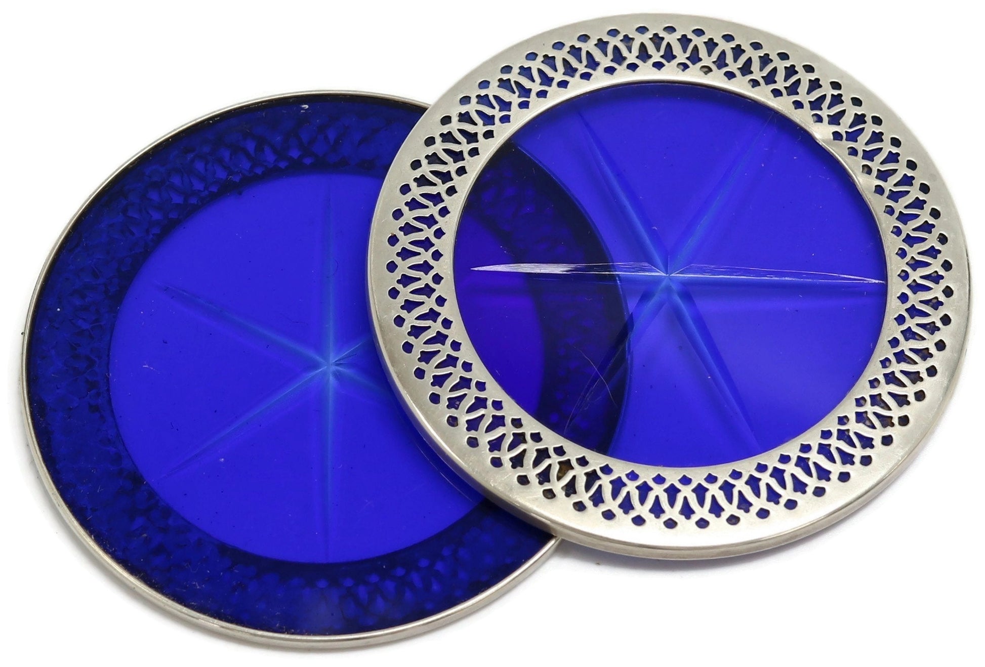 Pair of cobalt cut glass coasters with sterling rims. Sterling marks on sides.
