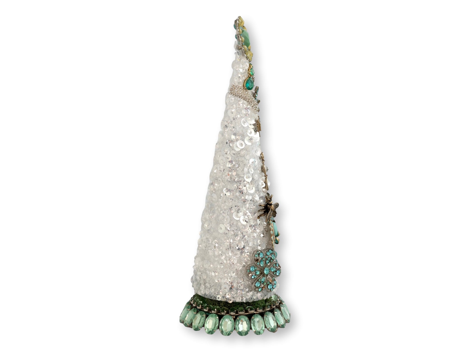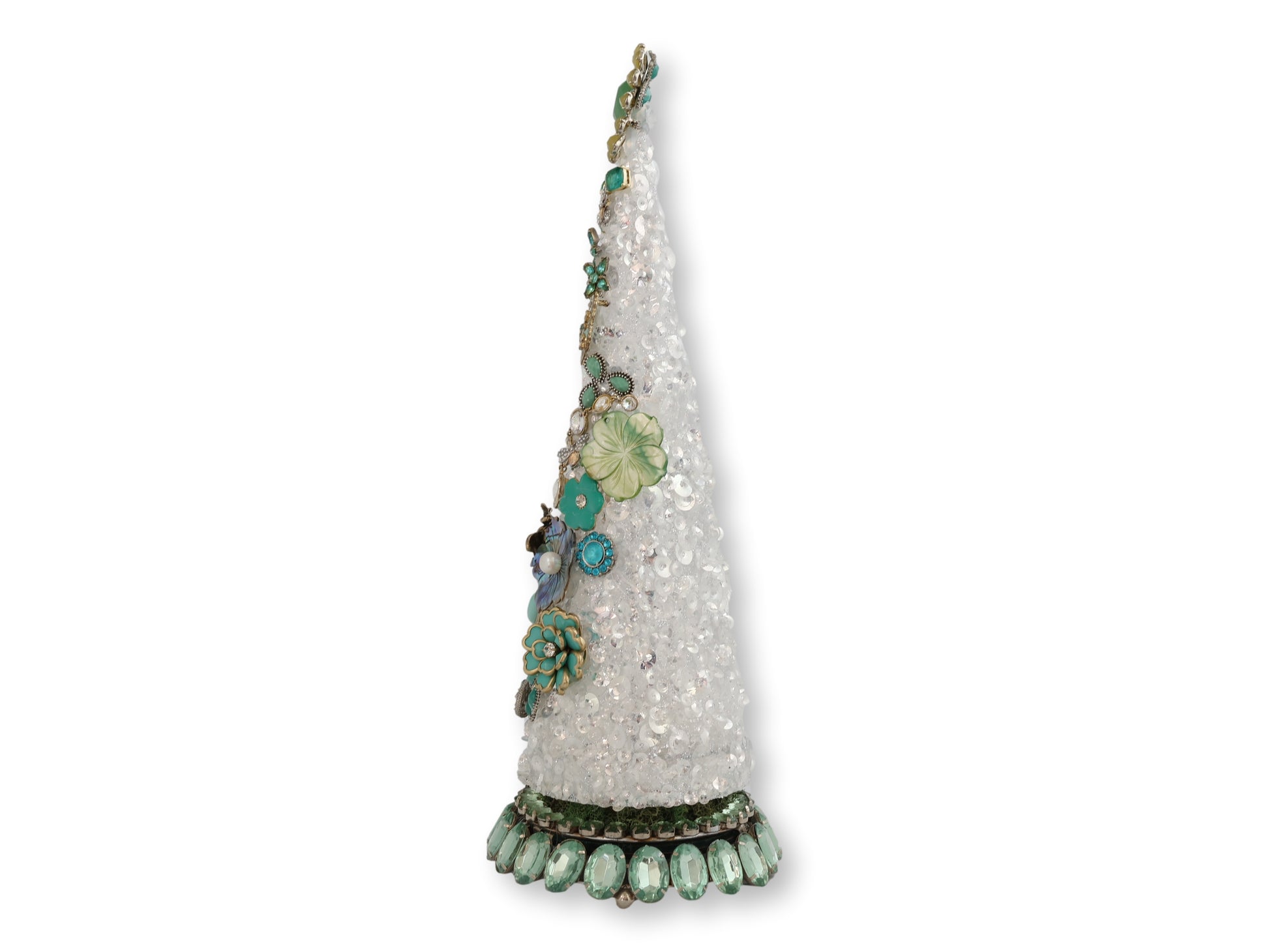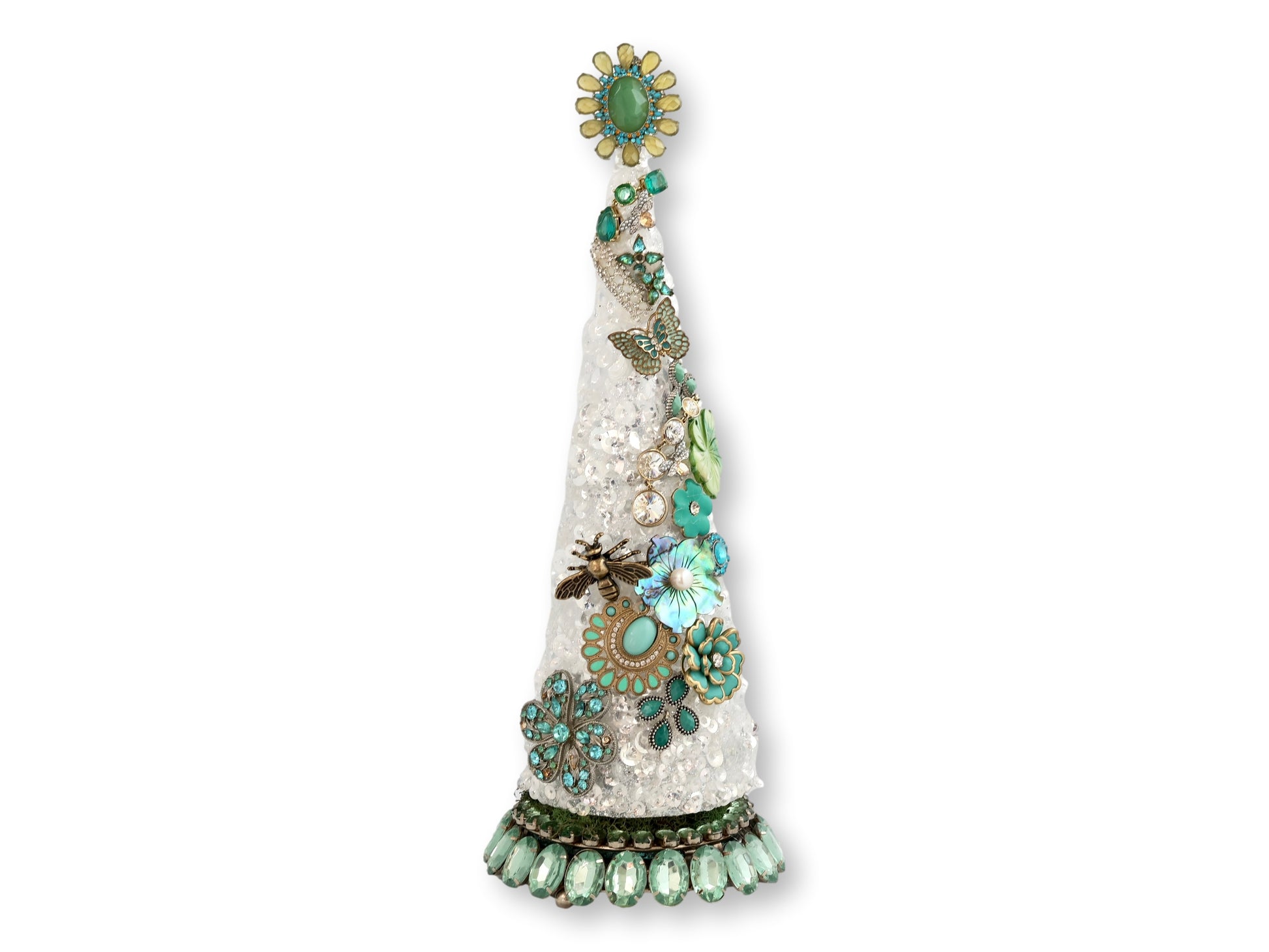 This sparkling holiday jewelry tree feels like a Tiffany’s window come to life. A frosted rhinestone-covered form is adorned with midcentury brooches and costume jewels in shades of teal, aqua, and mint — accented with butterflies, flowers, and a bold bracelet-style base. Crowned with a large statement jewel at the top, this one-of-a-kind creation radiates cocktail party glamour and Hollywood Regency charm, perfect for collectors who love their holiday décor with a luxe twist.