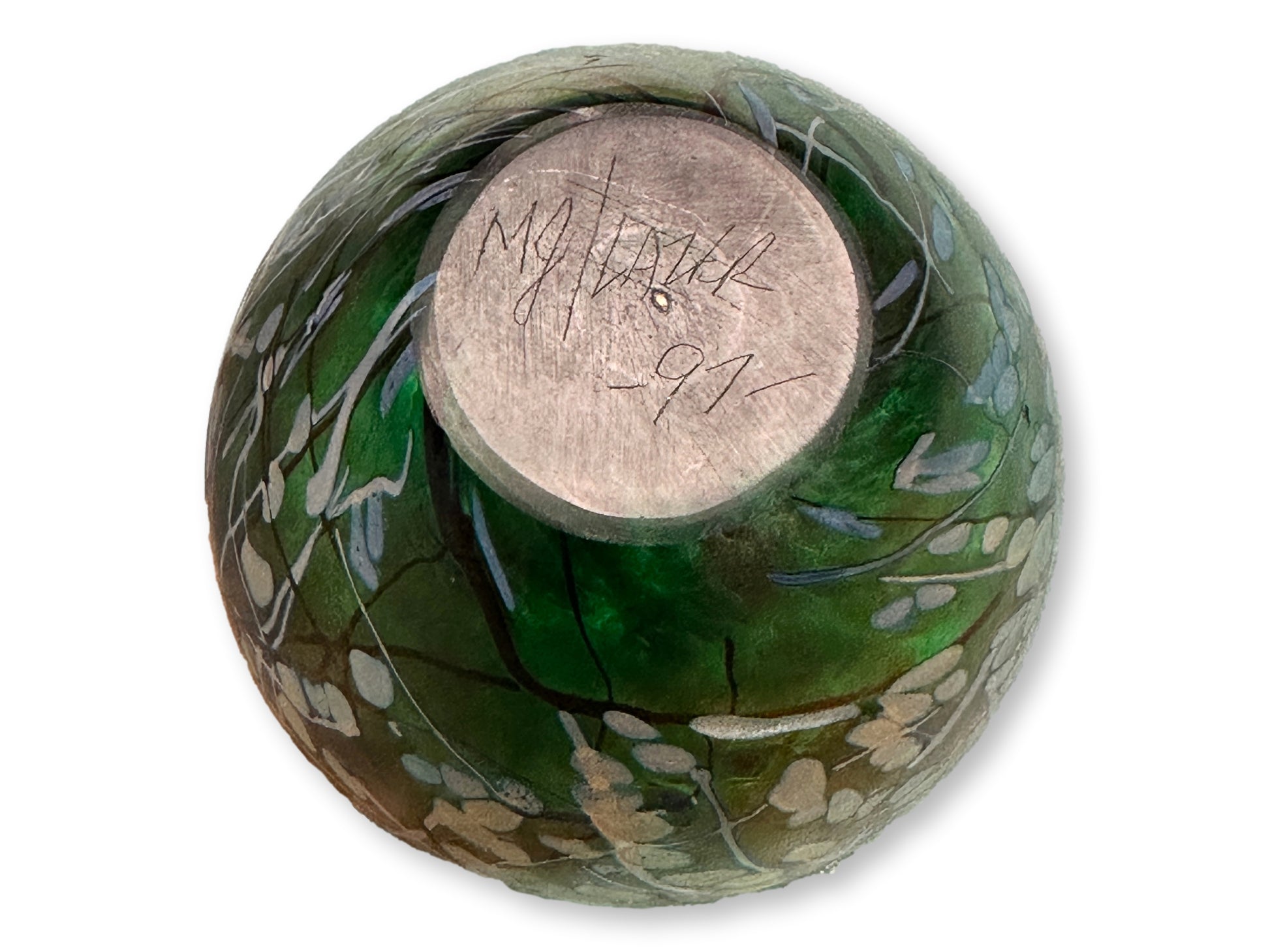 Vibrant handblown art glass paperweight by Tim Lazer, dated 1991. This striking studio piece features layered iridescent greens with abstract botanical-style trails in gold, blue, and black. The organic patterning and jewel-like finish showcase Lazer’s mastery of color and depth, reflecting the influence of late 20th-century American glass art. Signed and dated to the underside.