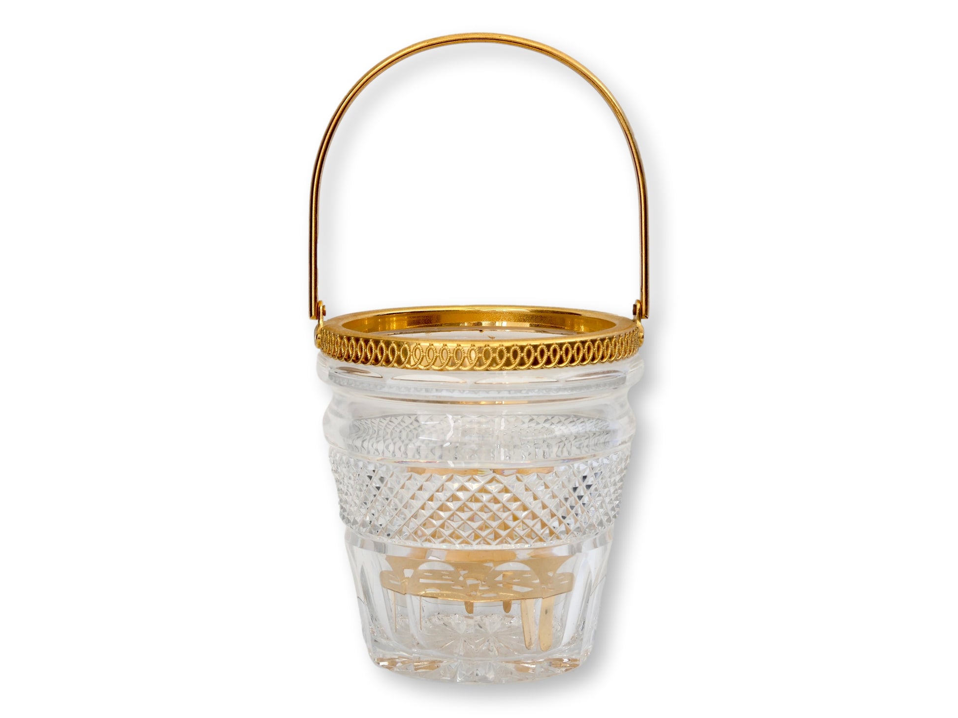 Effortless glamour for the cocktail hour set. This midcentury Val St. Lambert crystal ice bucket captures the golden age of entertaining in dazzling form. Deeply cut crystal sparkles beneath a gilt metal handle and removable insert, making it as functional as it is fabulous. A touch of Hollywood Regency refinement that begs for champagne—or peonies.