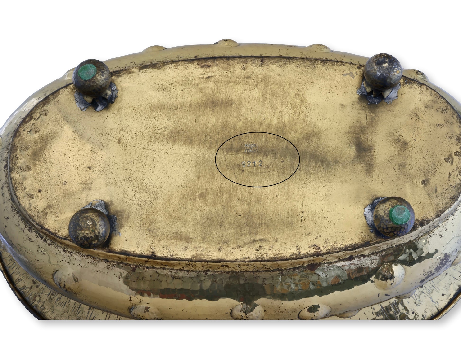 Baroque-style Italian brass planter, circa 1960s, with bold repouss scrollwork, domed rivet accents, and a hammered body that reflects its handwrought construction. Raised on ball feet, the oval form is both decorative and functional, with a wide flared rim for dramatic presentation. Retains a rich, aged patina with areas of tarnish and oxidation that highlight its vintage character. Perfect for use as a planter, centerpiece, or statement decorative accent.