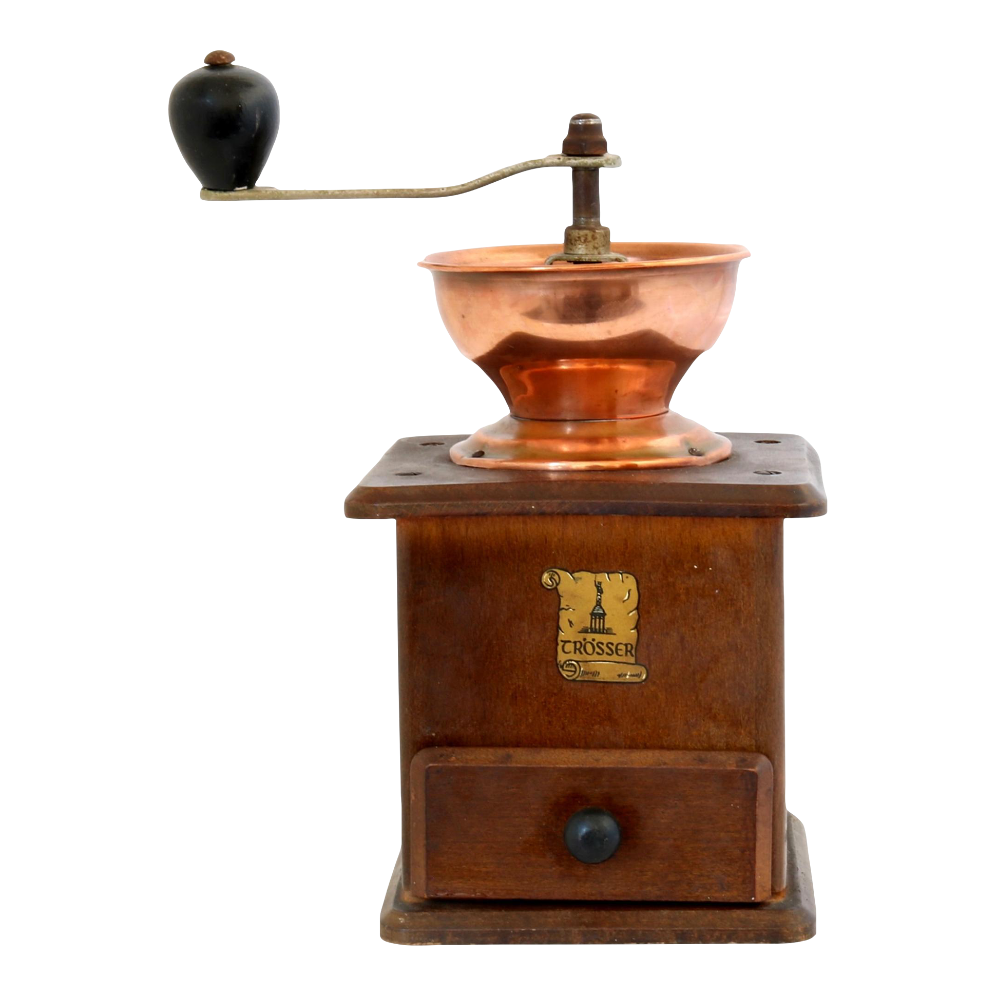 Vintage copper and wood coffee grinder. Appears to be in good working order. Maker's mark on front.