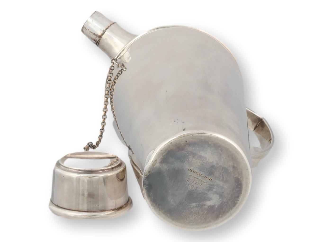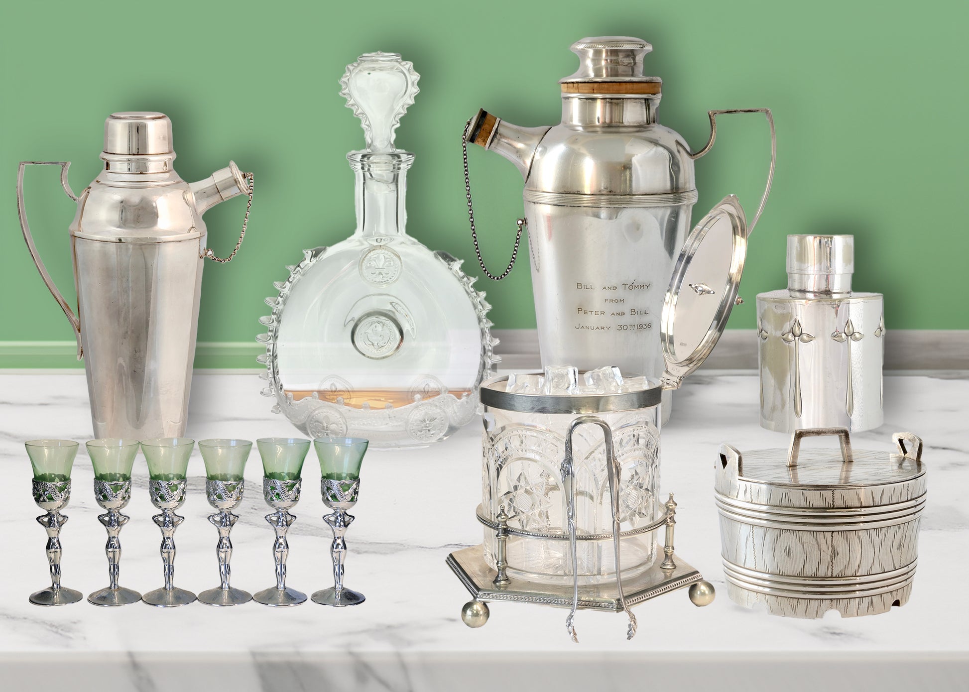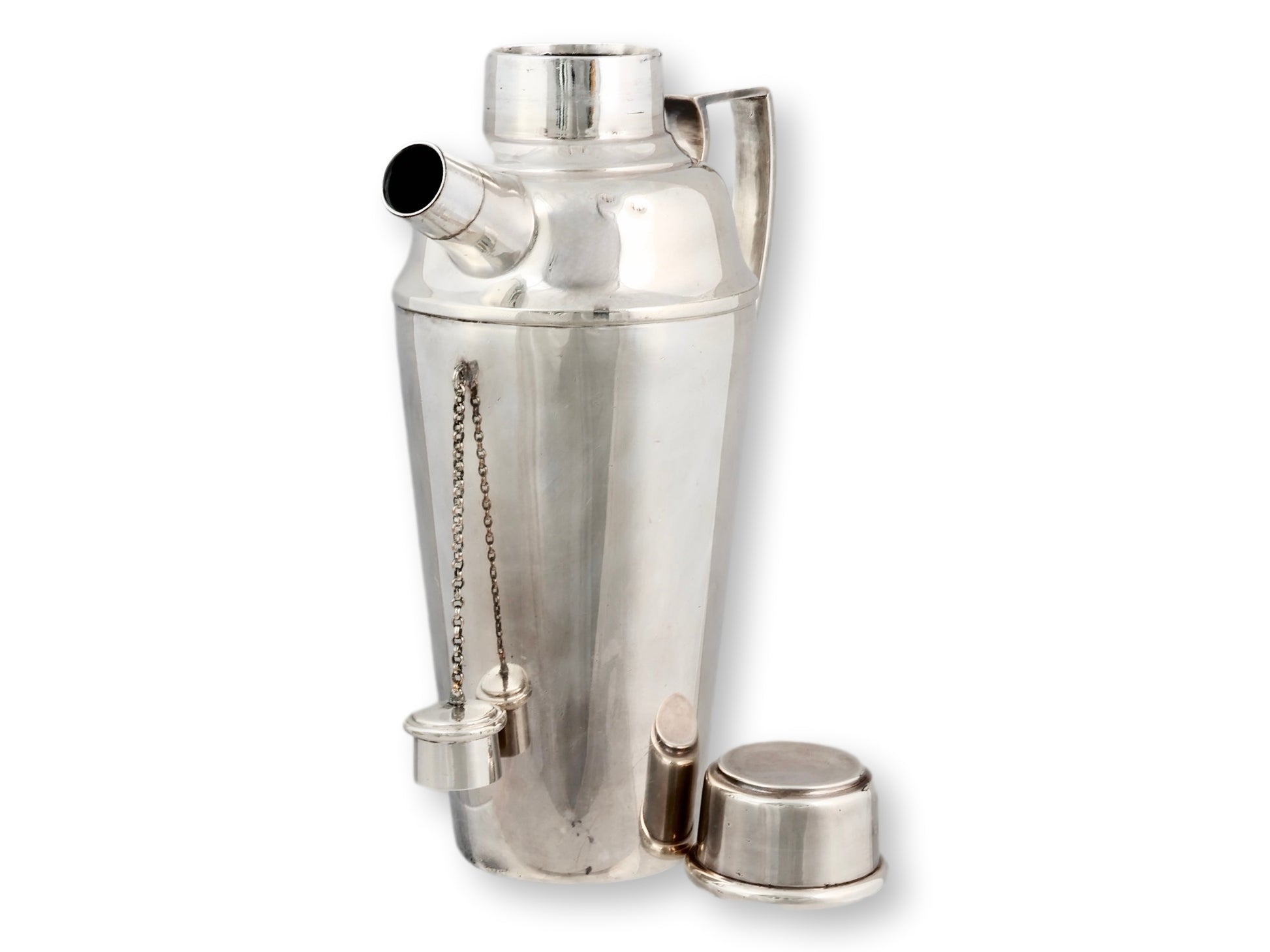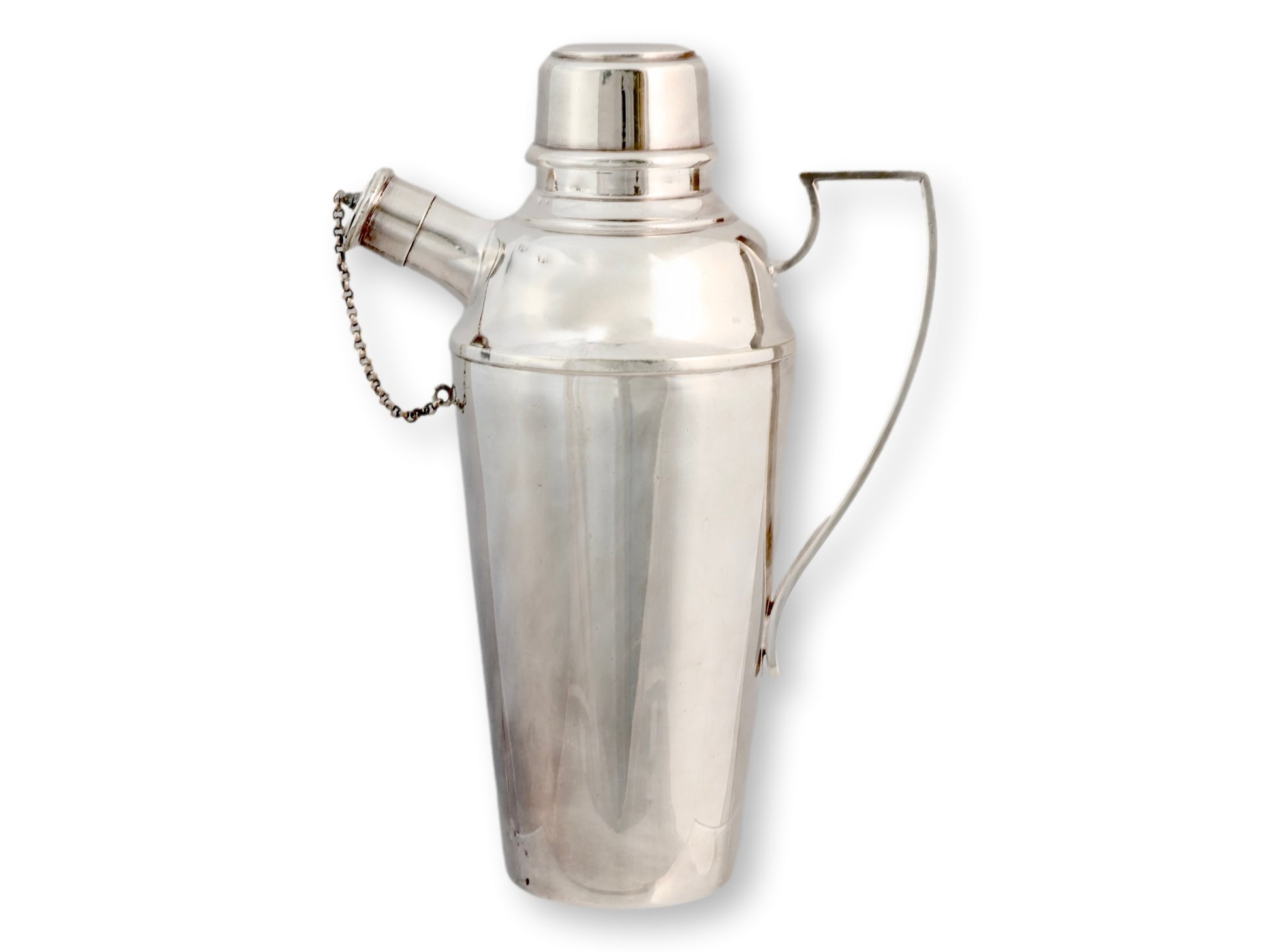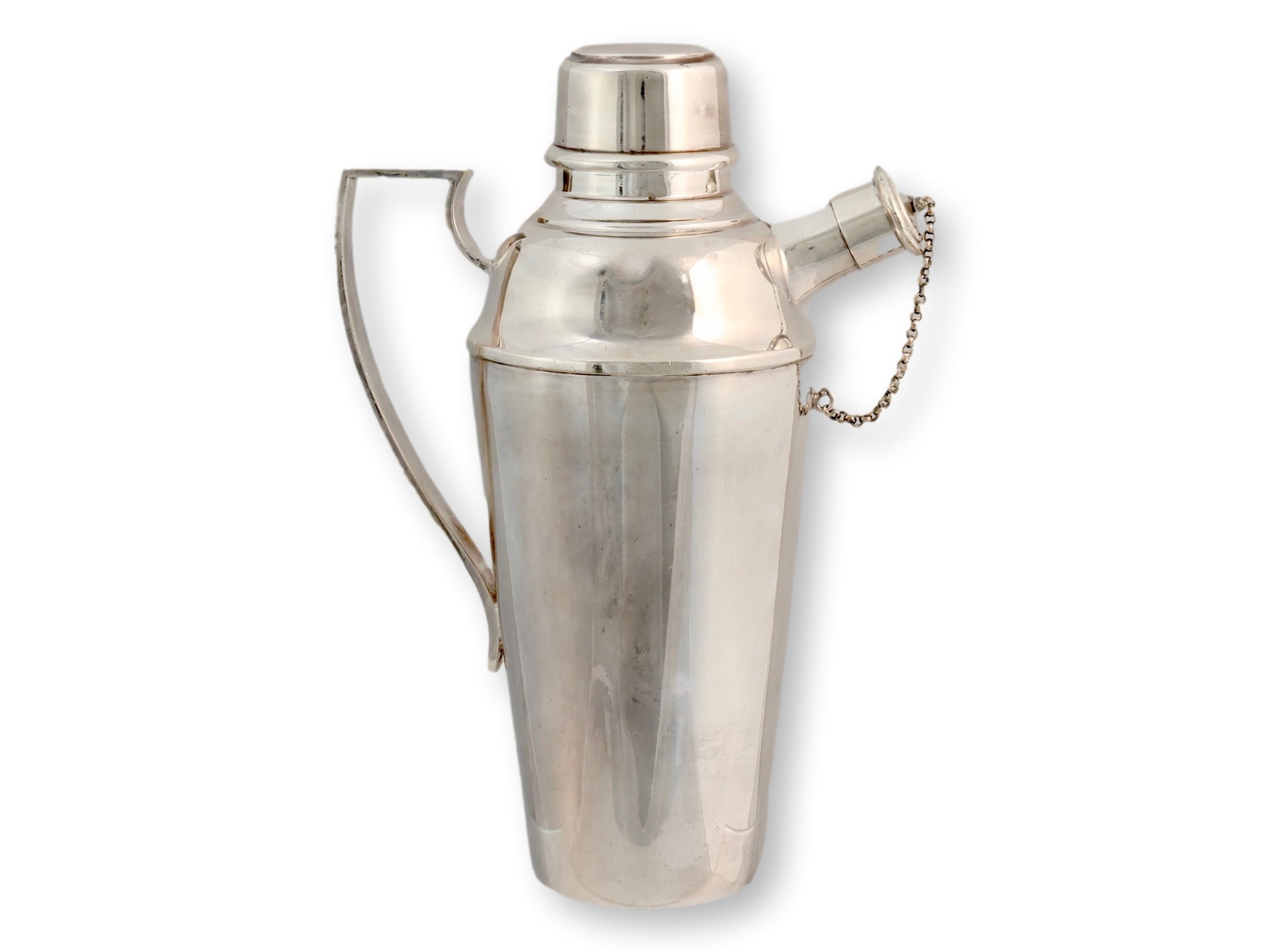 A striking Art Deco silver-plated cocktail shaker by the legendary Elkington & Co., made in England circa 1935. This tall, elegant form features a bold angular handle, curved spout with chain-linked cap, and a precision-fit lid. Pattern number 2101 stamped on underside along with the Elkington mark used during the 1930s. A quintessential barware piece from one of the most respected names in British silverplate—originally used in luxury hotel bars and ocean liner service.