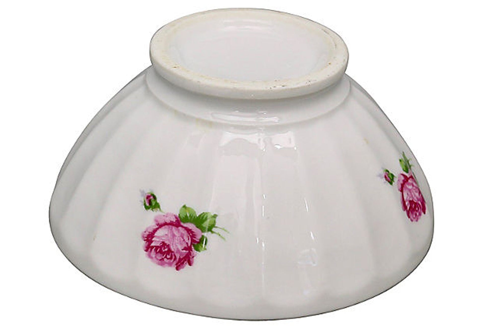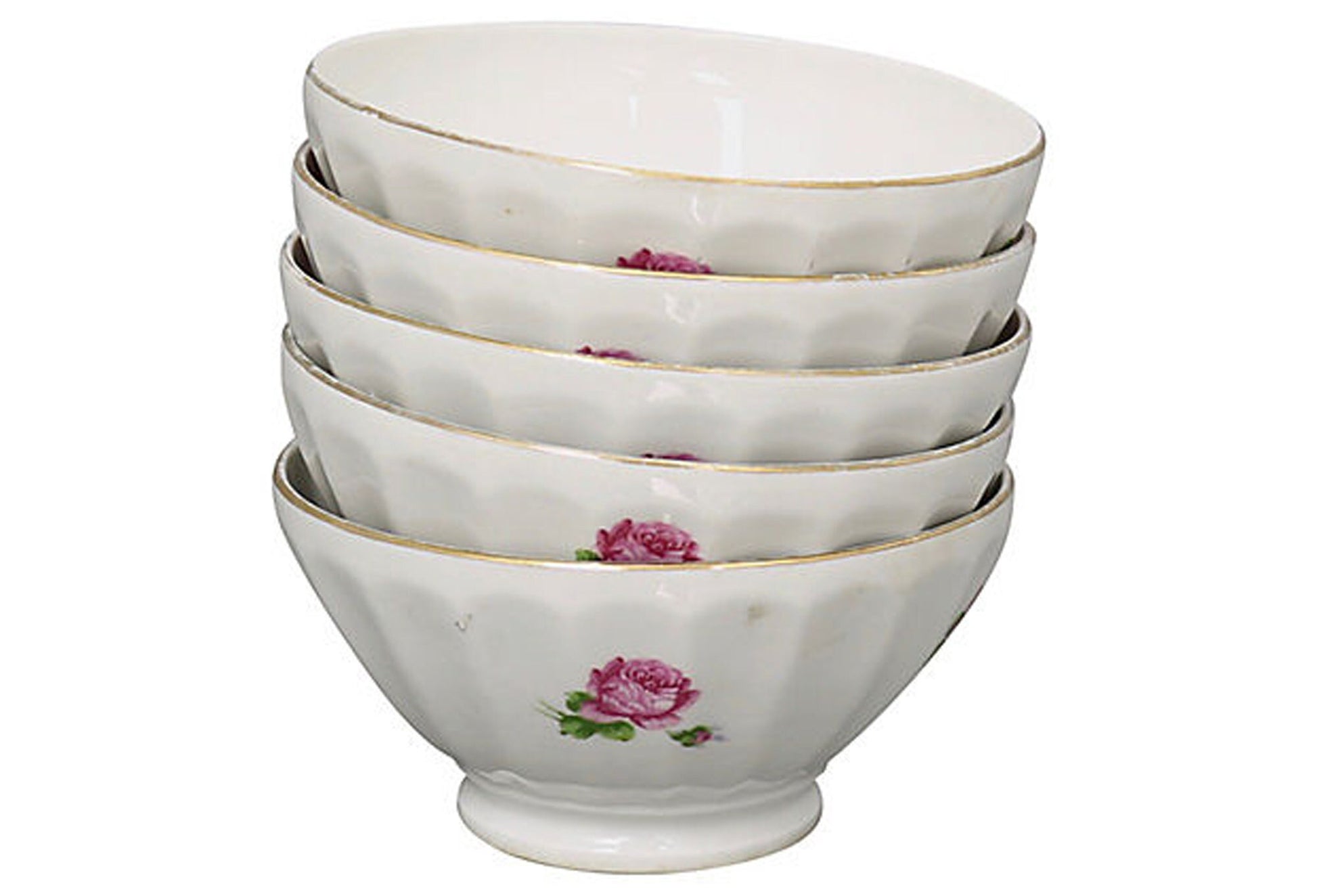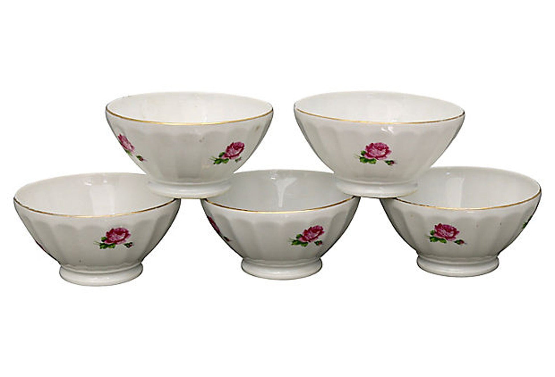 Channel the charm of a French bistro with this set of five vintage porcelain café au lait cups, each adorned with delicate floral motifs. Perfect for sipping your morning latte or serving a scoop of sorbet. Their generous size also makes them great as small dessert bowls. No maker’s mark.