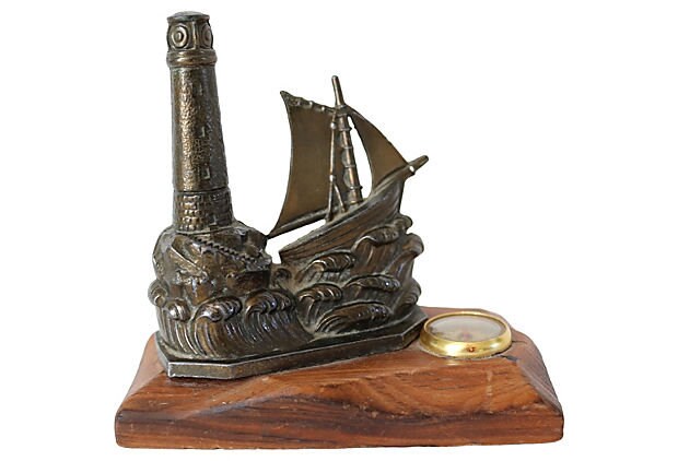 Ship and lighthouse desktop thermometer. No maker's mark.