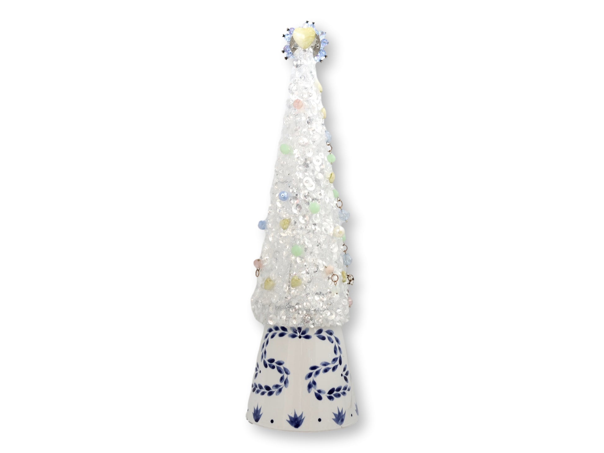 A one-of-a-kind holiday jewelry tree shimmering with vintage rhinestones, aurora borealis crystals, and pastel cabochons — all cascading in frosty brilliance. Crowned with a radiant starburst brooch topper, this dazzling tree rises from the iconic hand-painted ceramic base of a repurposed Clase Azul Reposado Tequila bottle in cobalt blue. Equal parts festive sparkle and cheeky sophistication, it’s a statement piece destined to dazzle on mantels, bars, or holiday tabletops.