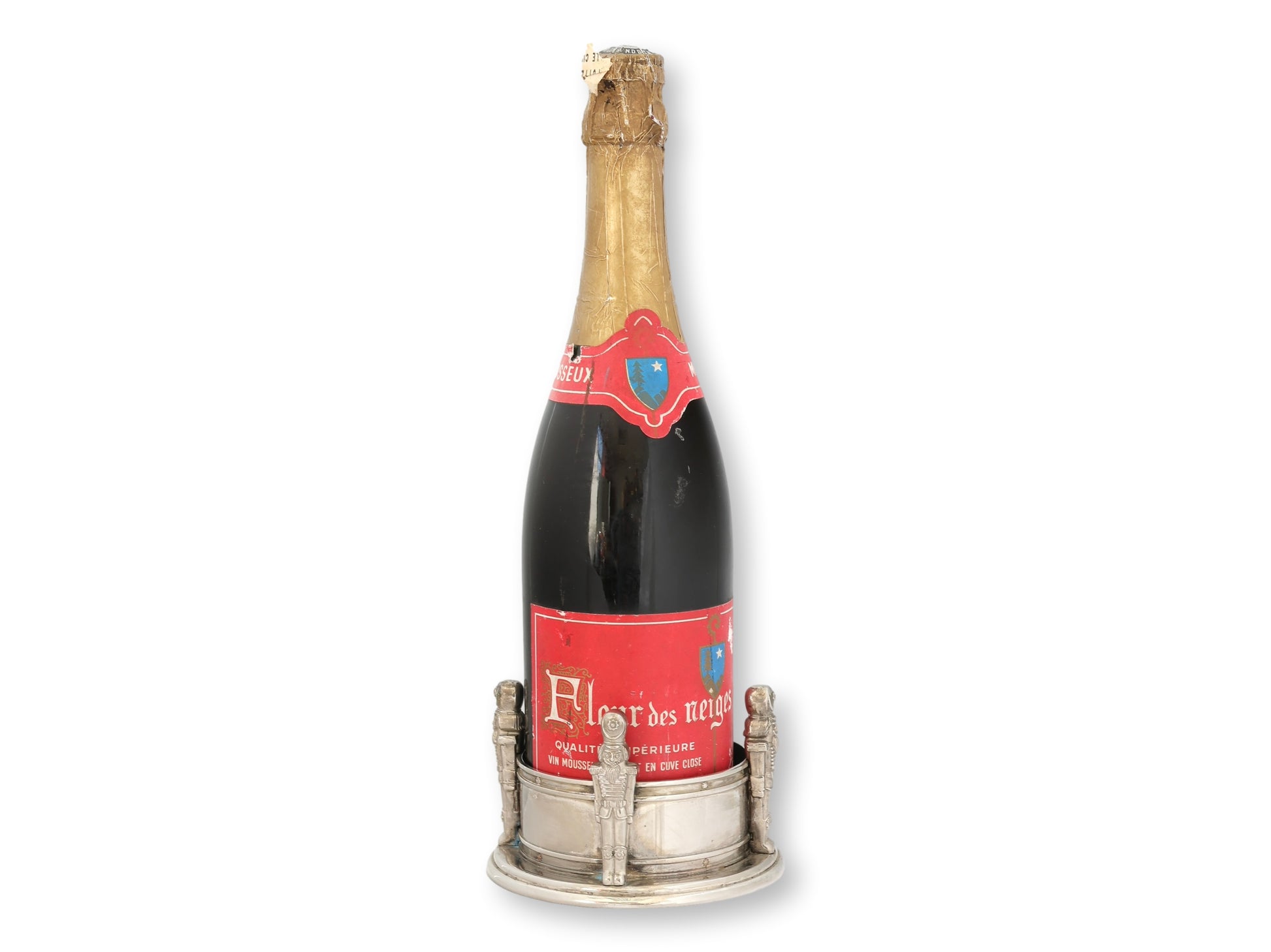 A festive vintage Godinger silverplate wine coaster encircled by four standing nutcrackers, each finely detailed in full relief with traditional soldier uniforms. Designed to hold and protect surfaces beneath a favorite bottle of wine or champagne, it features a felt-lined base stamped “Godinger.” The silverplate surface retains a bright polish with light tarnish consistent with age, adding depth and vintage charm. A collectible and functional accent for the holiday table or bar.