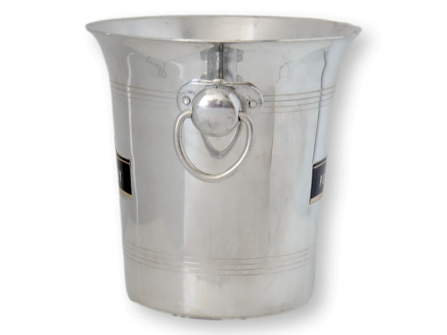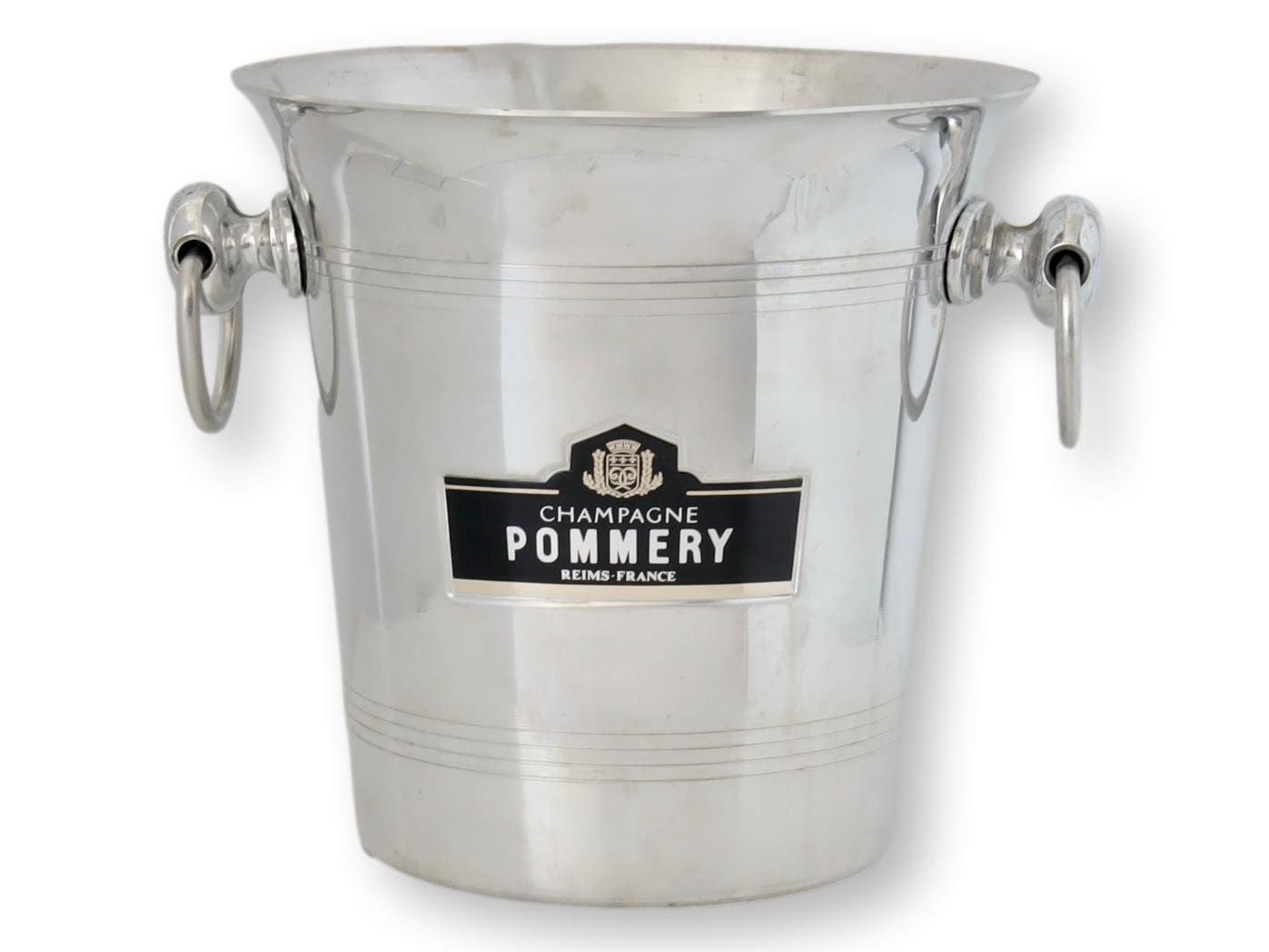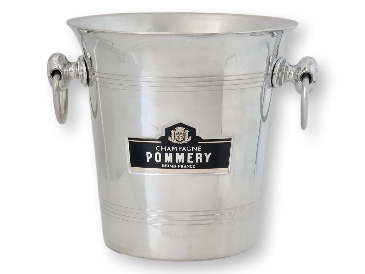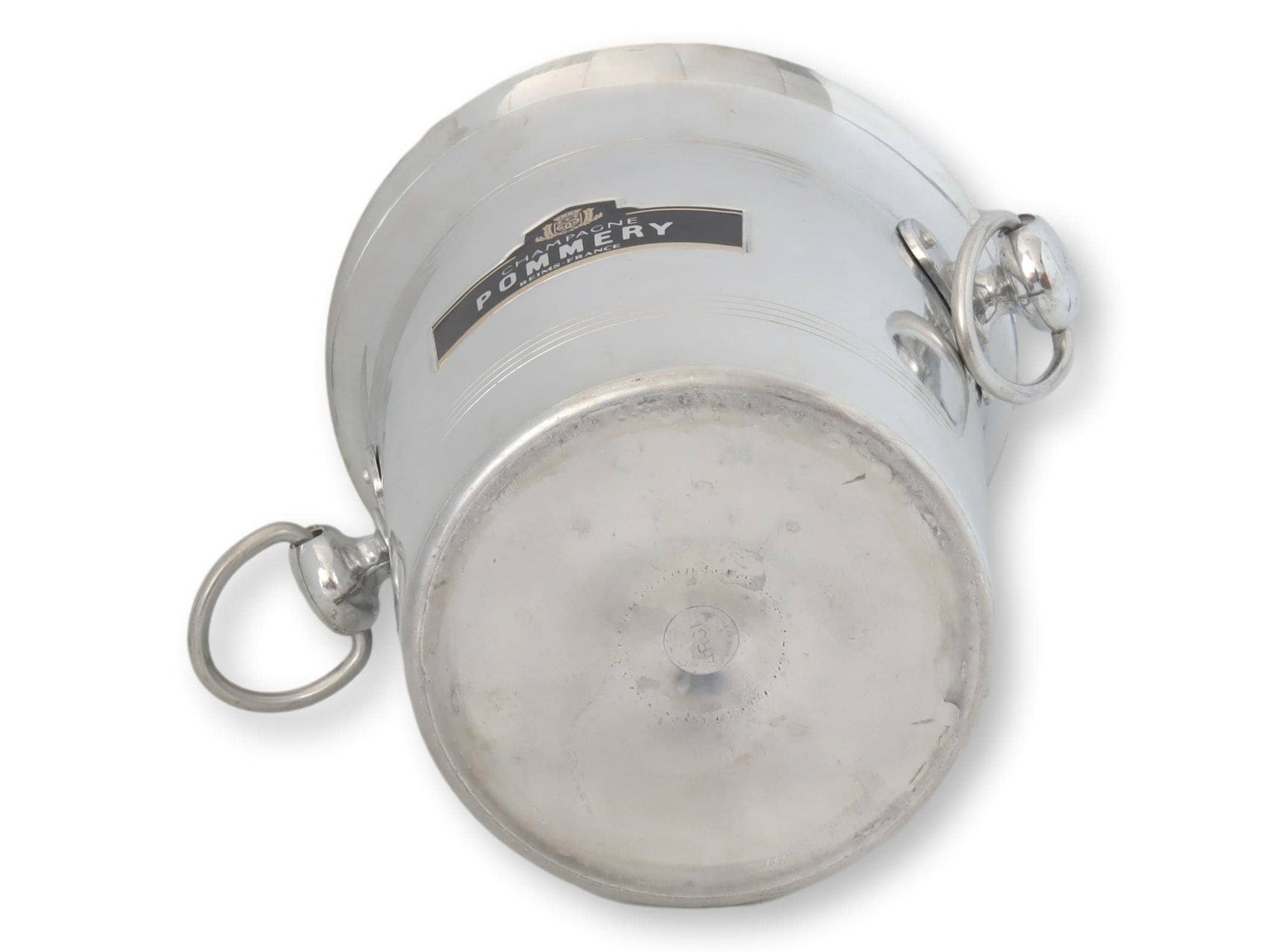 Durable and polished, this Vintage Pommery ice bucket from Reims, France, is both functional and decorative. Features the notable Champagne Pommery logo and sturdy handles. Ideal for keeping champagne chilled during gatherings or special occasions. Signed on the bottom.