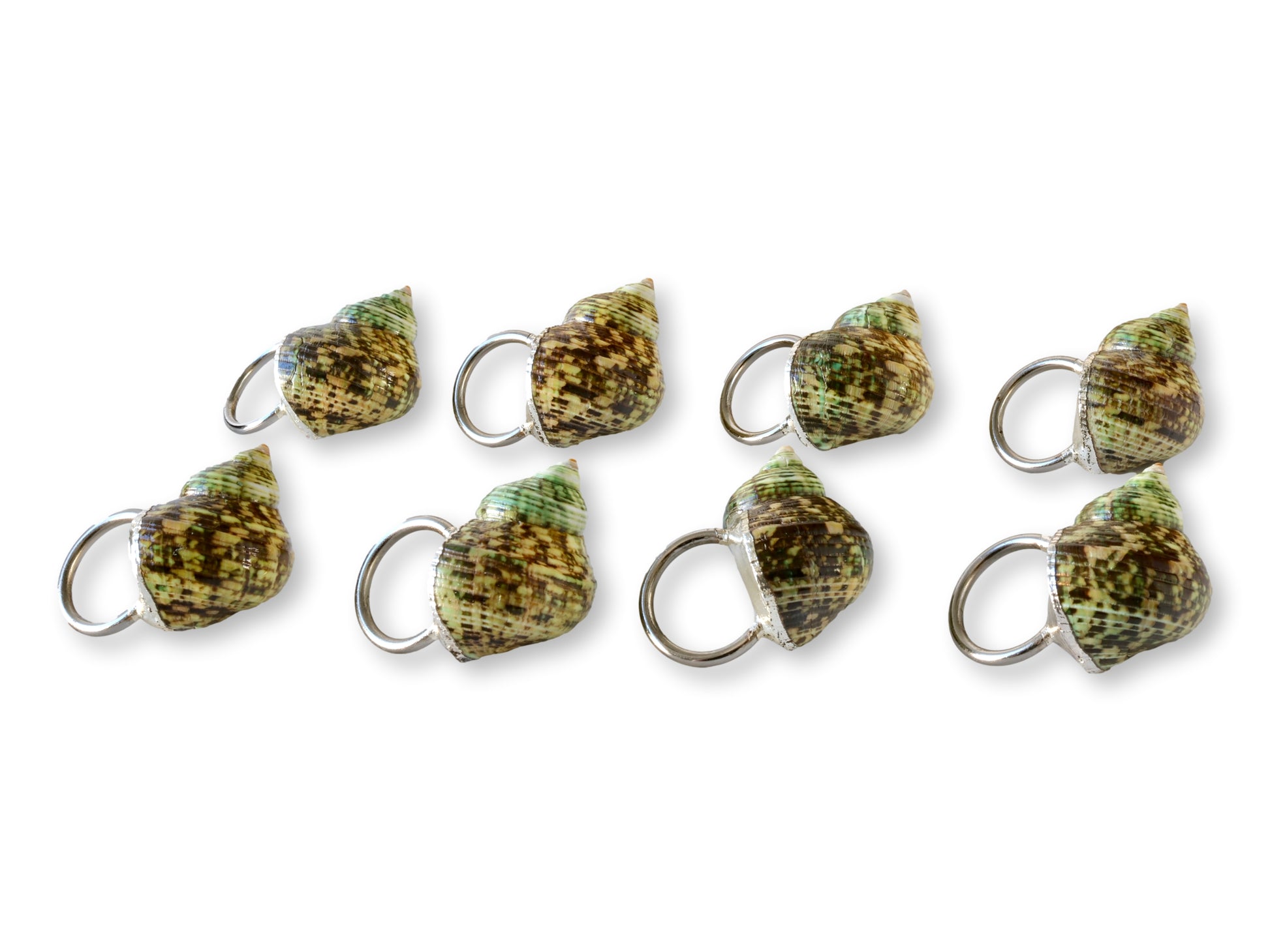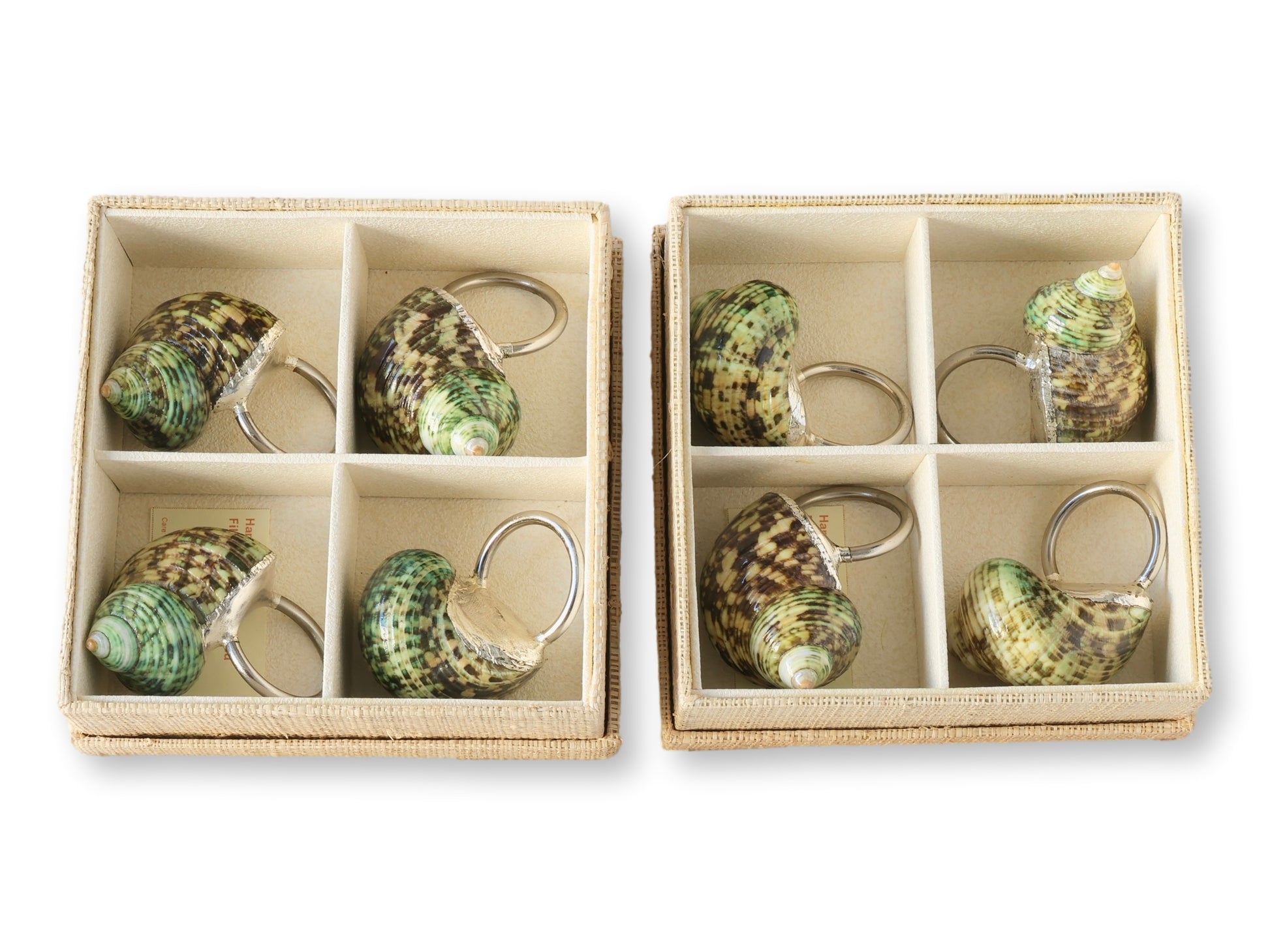 Beautiful set of eight vintage shell napkin rings, each handcrafted from natural marine shells with variegated tones of green, cream, and brown. Their organic texture and iridescent finish bring an elegant coastal touch to any table setting. Housed in the original presentation box, this complete set evokes the charm of midcentury coastal entertaining—think breezy lunches along the Amalfi Coast or summer dinners in Capri. A timeless accent for seaside-inspired décor or a thoughtful gift for the coastal entertainer.