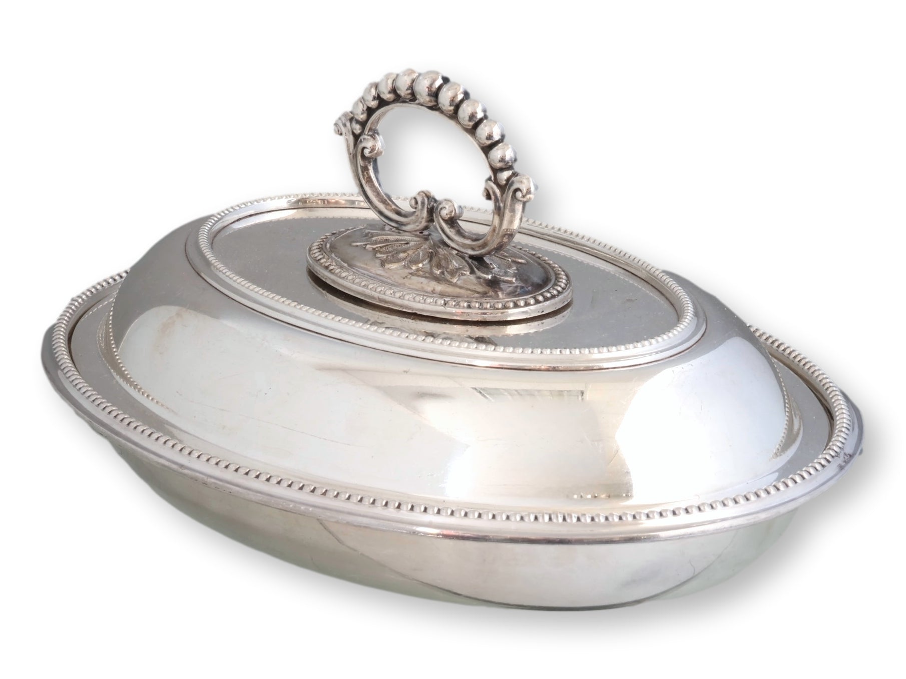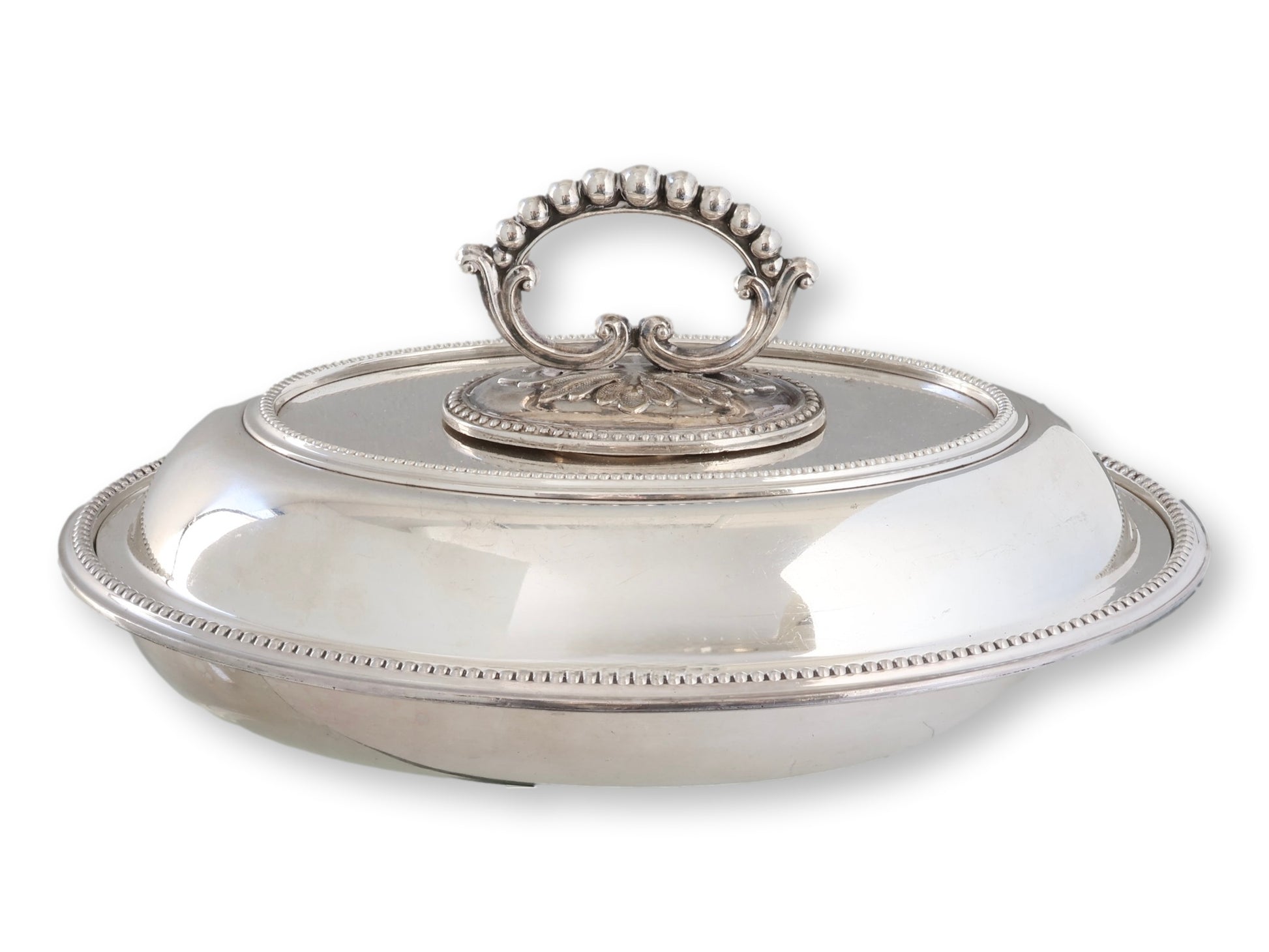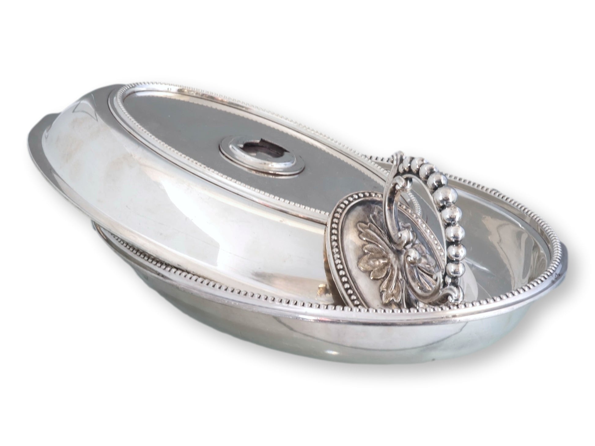 Exceptional quality Walker & Hall silverplate entrée dish with finely beaded rim and removable key handle. Both base and lid may be used as serving dishes—perfect for buffet-style presentation. Heavy-duty hotelware construction, ideal for entertaining or daily use. Excellent plating with deep, even luster. Stamped for Walker & Hall with clear hallmarks.