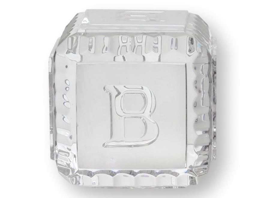 Delight in the artistry of fine Irish crystal with this charming pair of alphabet baby blocks by Waterford. Each cut crystal block features engraved letters, faceted borders, and a star motif that captures and refracts light beautifully. The acid-etched Waterford mark remains visible on the base, a testament to the brand’s renowned craftsmanship. Perfect as nursery décor, a christening gift, or a meaningful collectible celebrating timeless design and heritage quality.