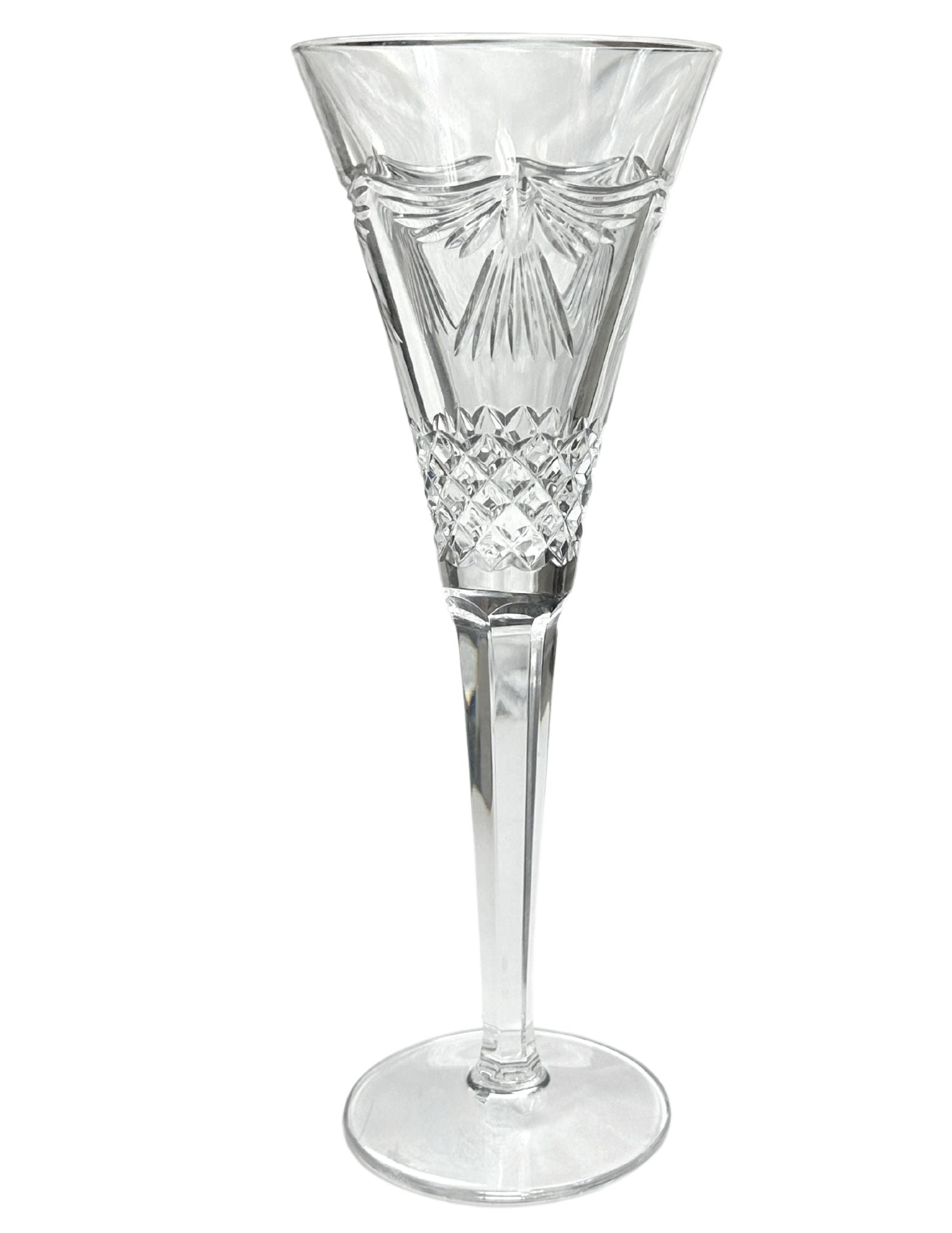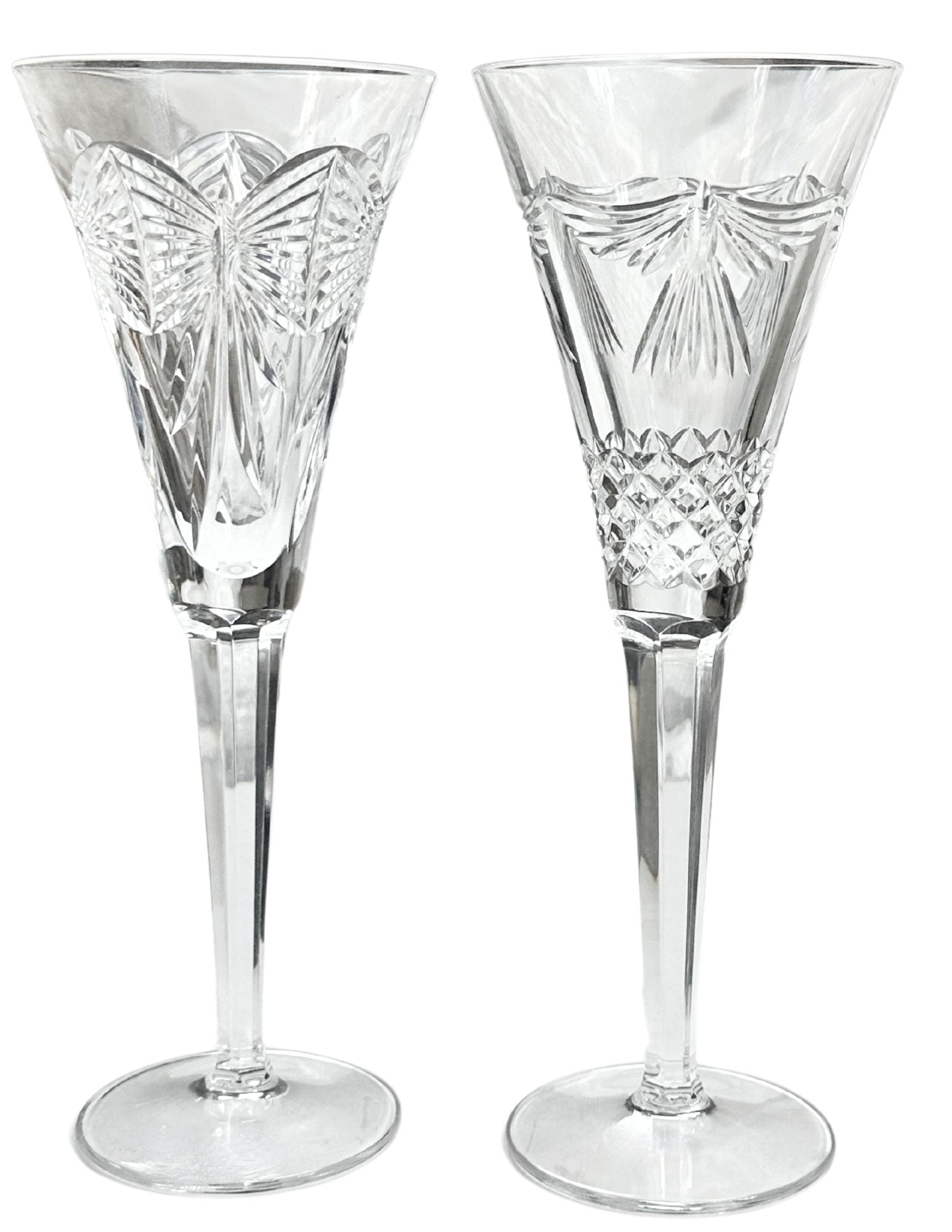 A stunning pair of Waterford Crystal toasting flutes from the Millennium Series, featuring intricate cut designs symbolizing peace and happiness. Crafted from high-quality crystal, these elegant flutes showcase Waterford's renowned craftsmanship. Perfect for toasting special occasions or as a timeless addition to any collection. Waterford mark on bottom.