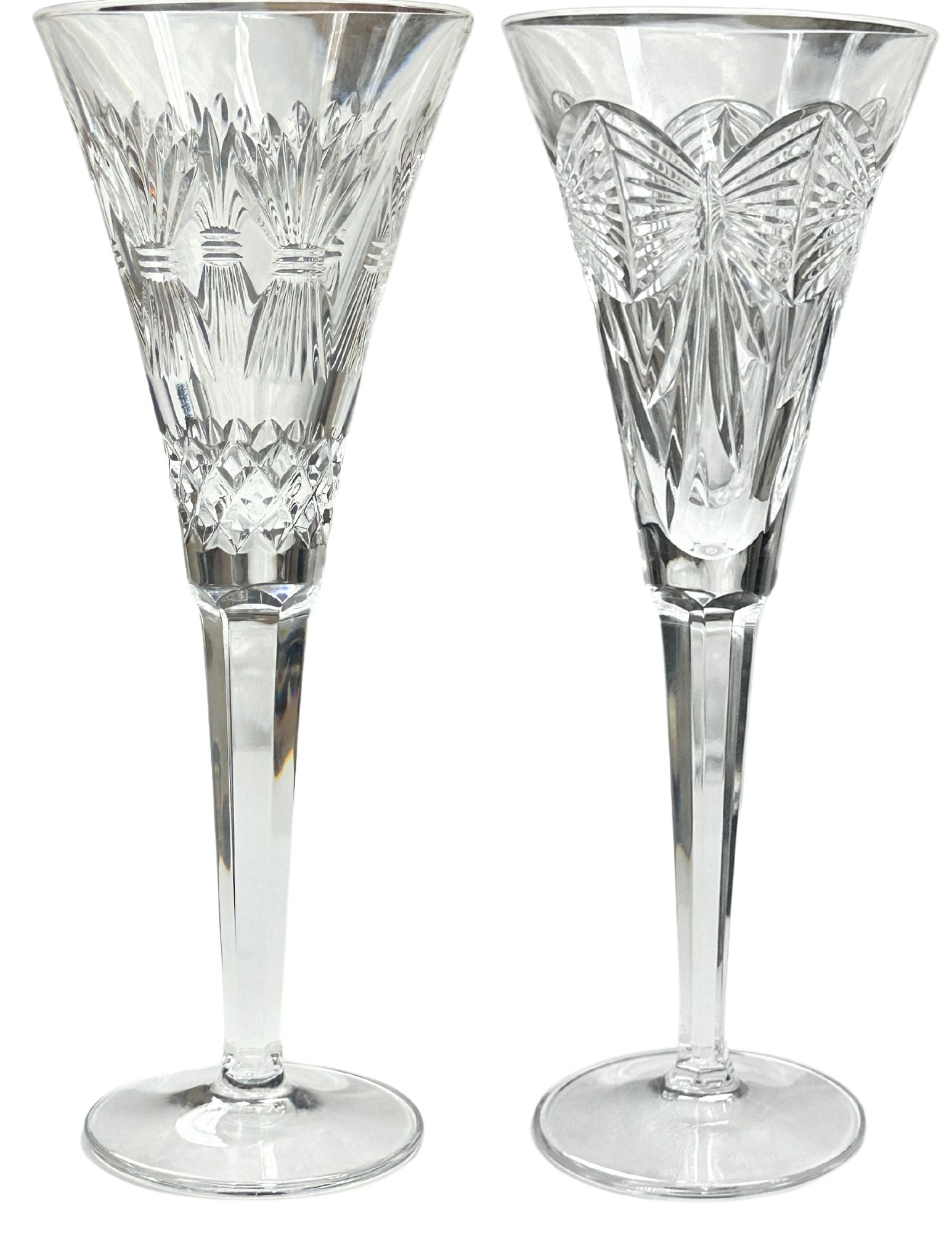 Beautiful pair of Waterford Crystal Millennium Series toasting flutes, featuring the iconic cut patterns for Happiness and Prosperity. Crafted from fine crystal, these flutes embody timeless elegance and exceptional craftsmanship, making them perfect for celebrating life’s most cherished moments. A limited series made to commemorate the 2000 Millennium, from 1996 to 2005. Waterford mark on bottom. Perfect for toasting special occasions, a wonderful gift or addition to any collection.