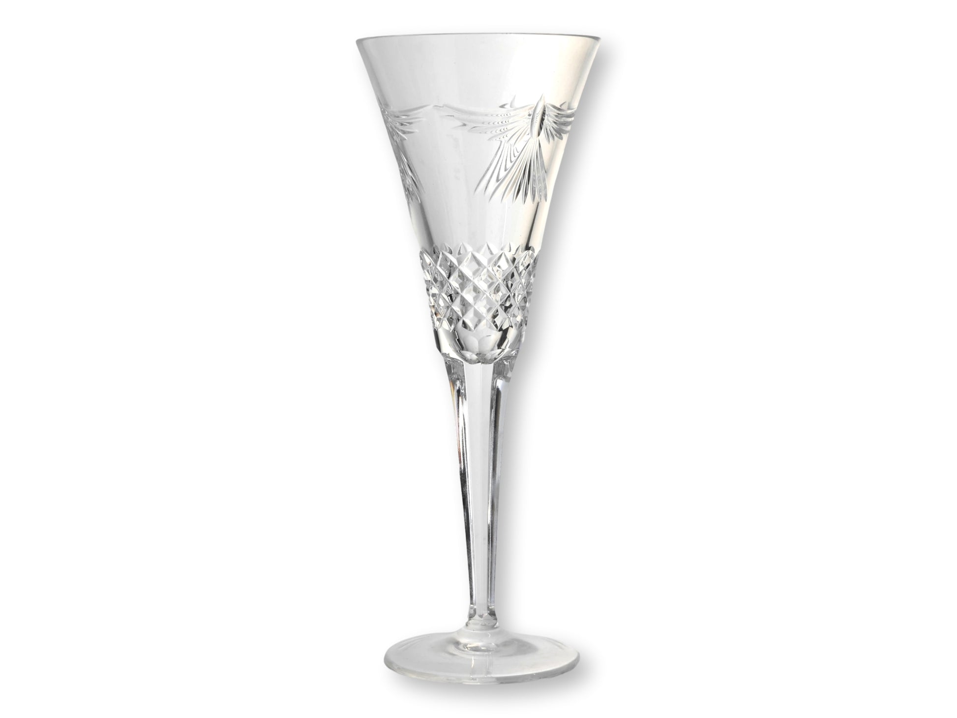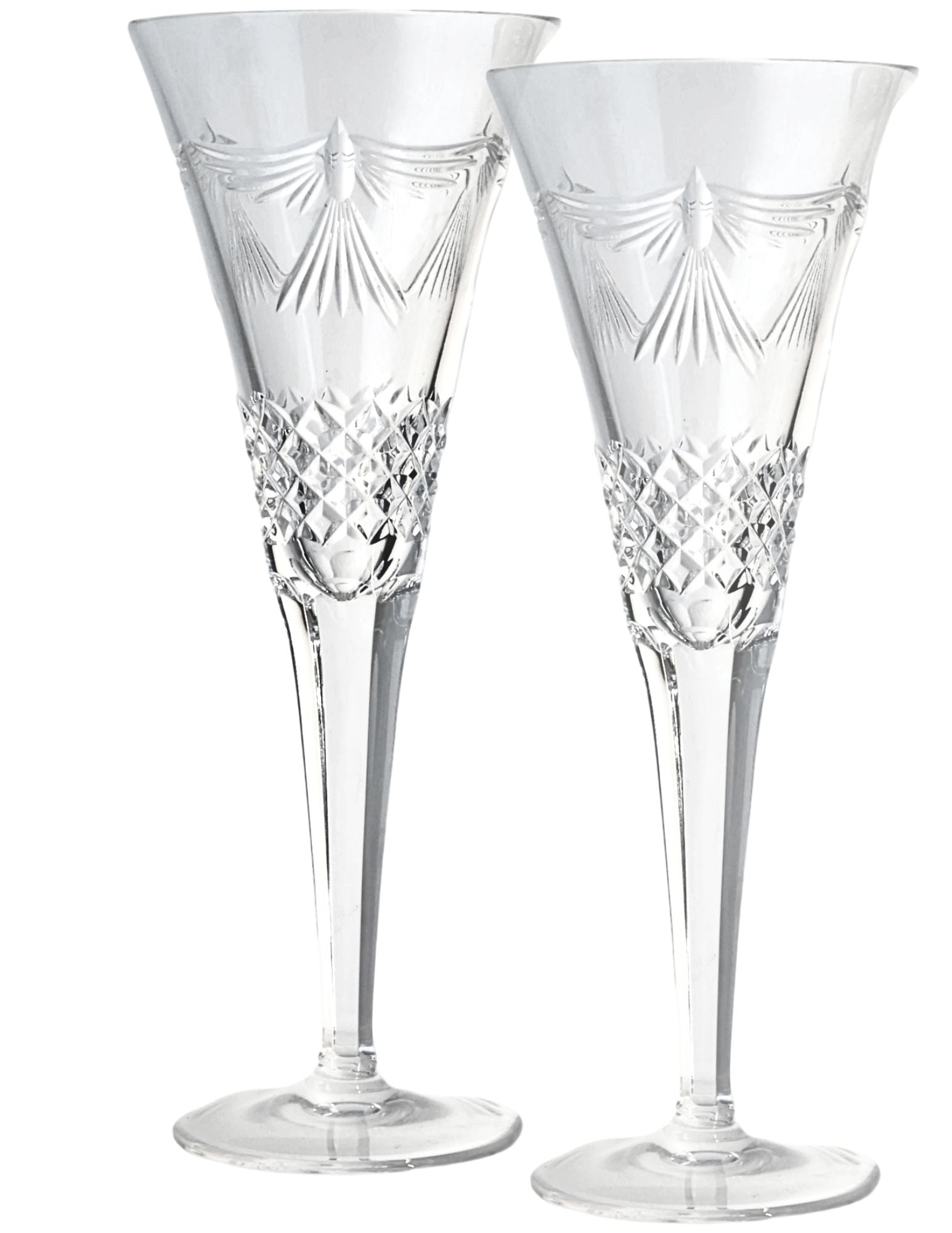 From Waterford's coveted Millennium Collection, this pair of cut crystal toasting flutes features the “Peace” design—elegantly etched with descending doves and finished with diamond-cut detail. Crafted in Ireland and released for the year 2000, these flutes celebrate a wish for peace in the new millennium. A thoughtful gift or keepsake, perfect for weddings, anniversaries, or collectors completing the series