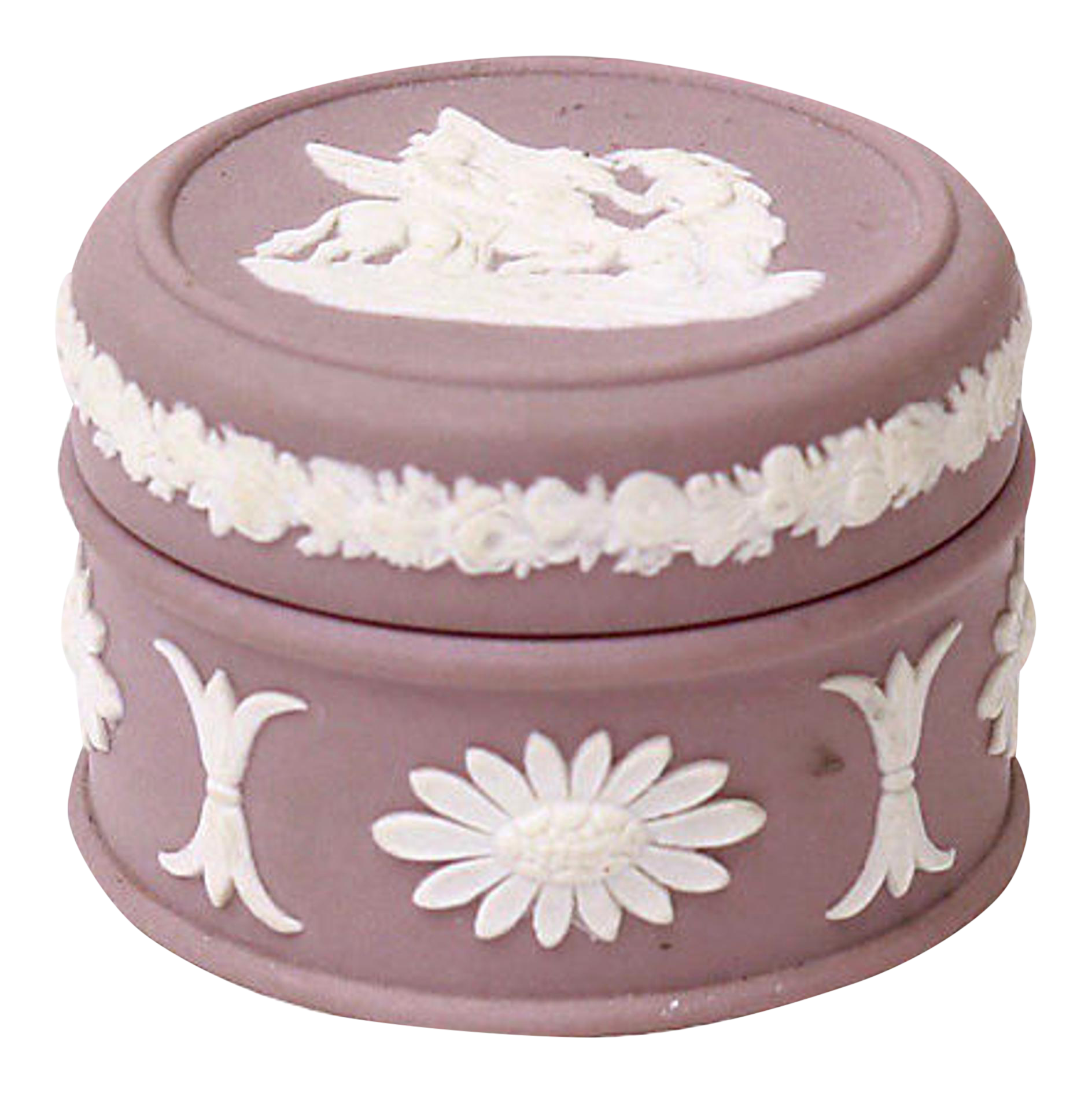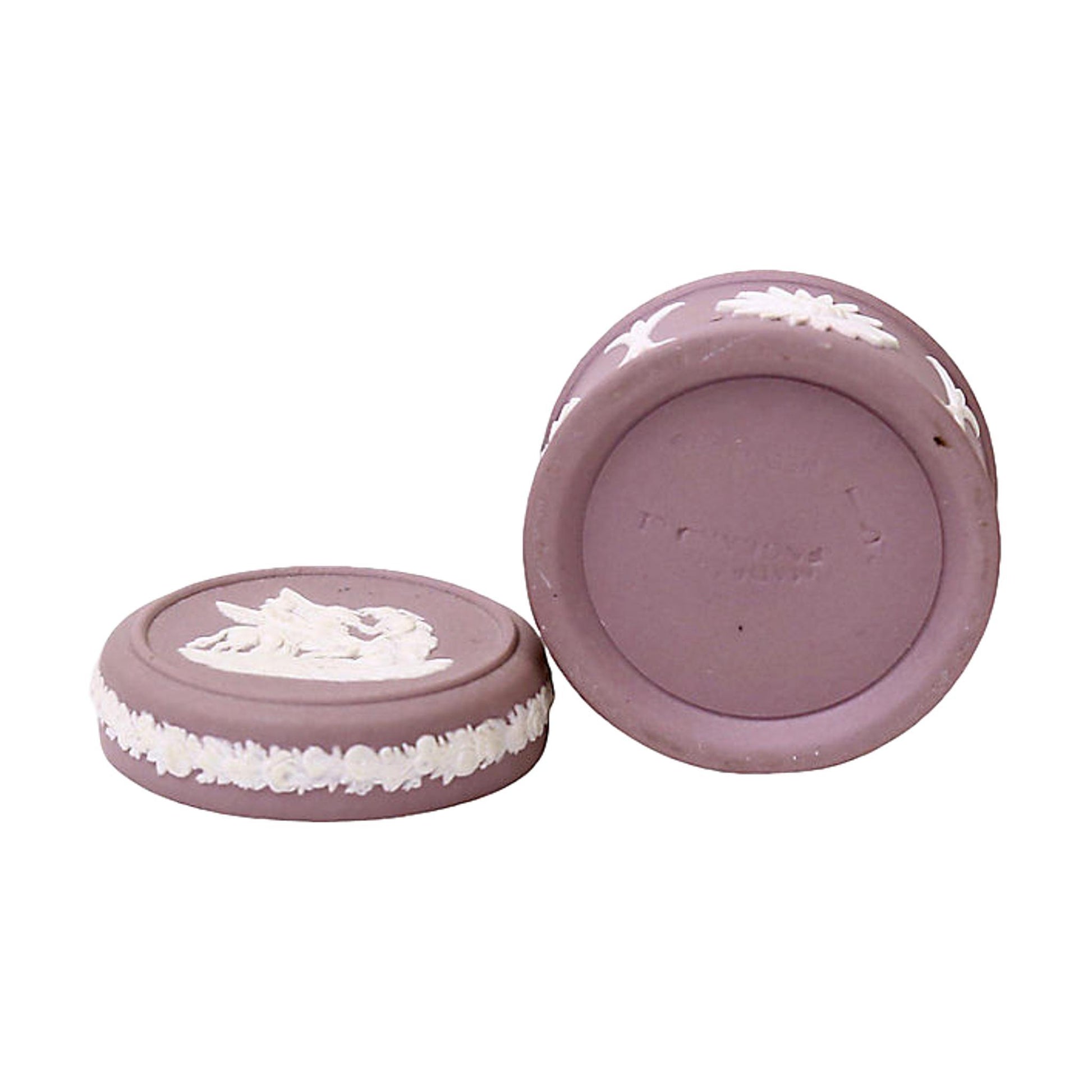 This elegant Wedgwood Jasperware ointment or pill pot is a beautiful example of the brand's iconic craftsmanship. Featuring a soft lavender hue and adorned with classical white relief figures, the pot showcases intricate floral detailing around its body and lid. Perfect for holding small items, this charming piece exudes timeless sophistication, making it ideal for collectors of Wedgwood or lovers of neoclassical design. Whether displayed as part of a collection or used for its intended purpose, this pot is a lovely addition to any home.